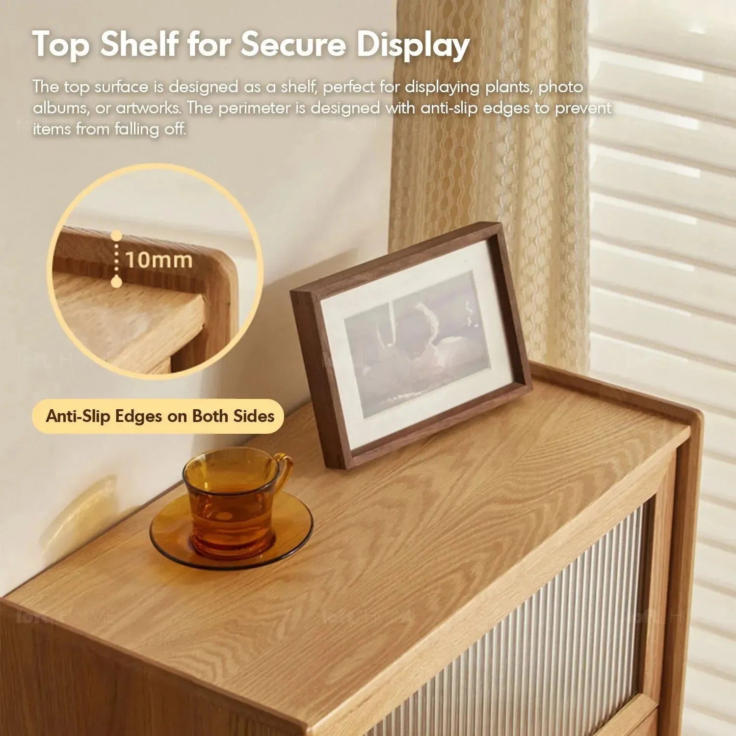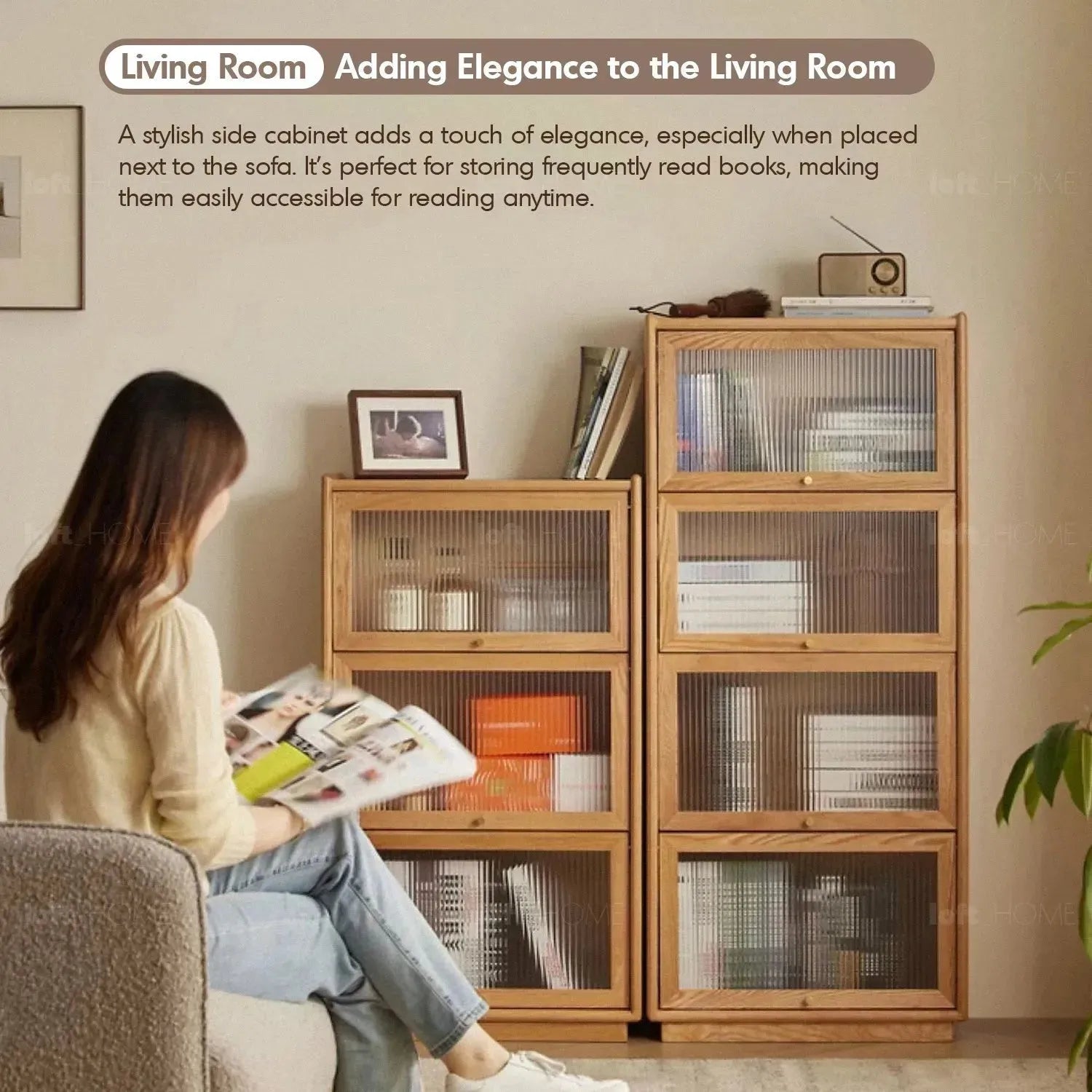 This refined cabinet mixed the warmth of natural wood with the contemporary flair of fluted glass panels. Offering privacy and style, it features sturdy shelves and sophisticated brass handles, creating an ideal space for both storage and display.