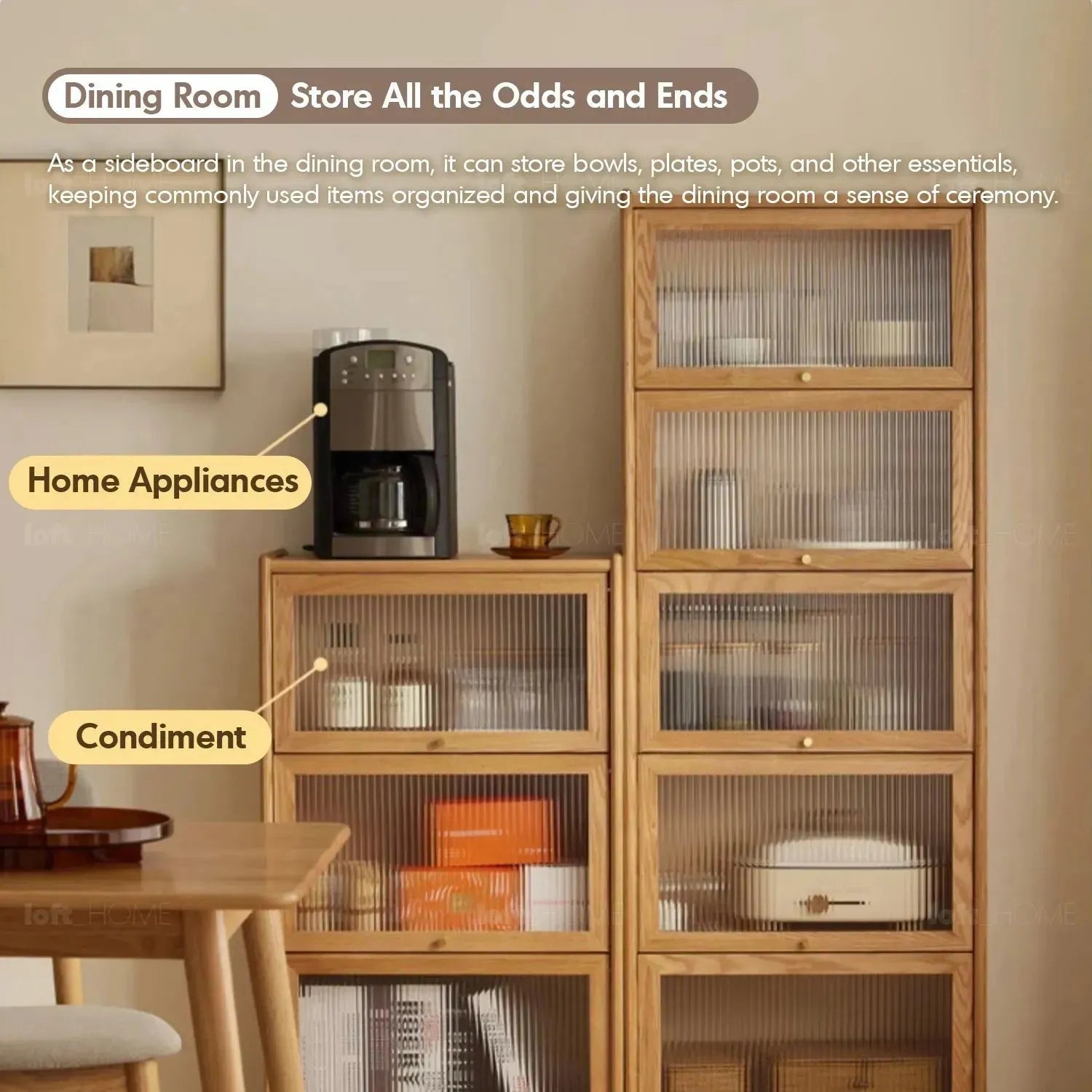 This versatile piece serves as an elegant organizational solution, perfect for neatly storing dinnerware and pantry items, thus enhancing the dining area with a sense of order and beauty. |