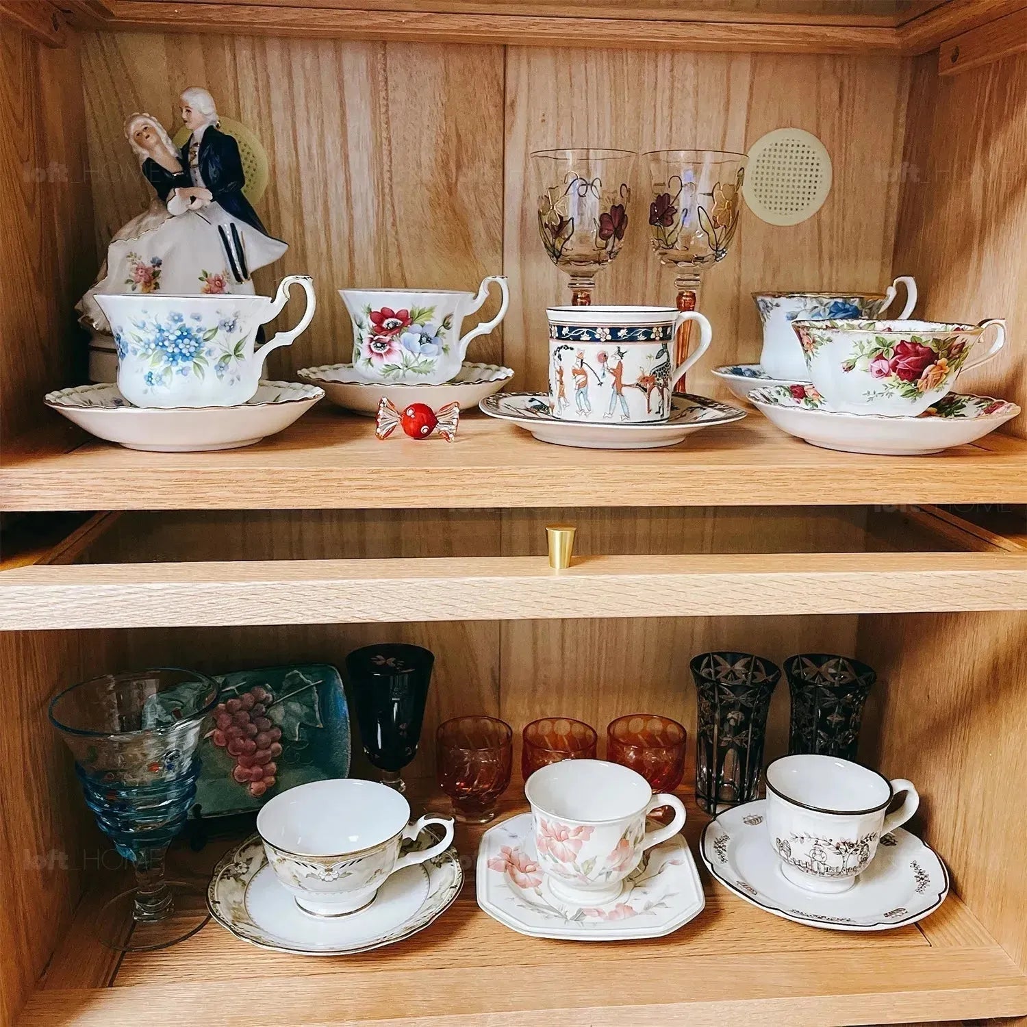 This versatile piece serves as an elegant organizational solution, perfect for neatly storing dinnerware and pantry items, thus enhancing the dining area with a sense of order and beauty.