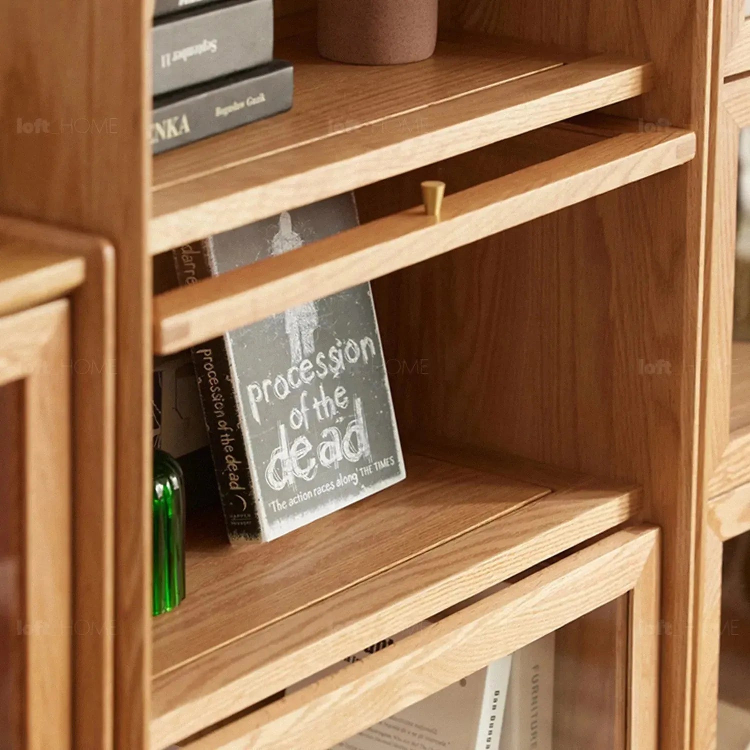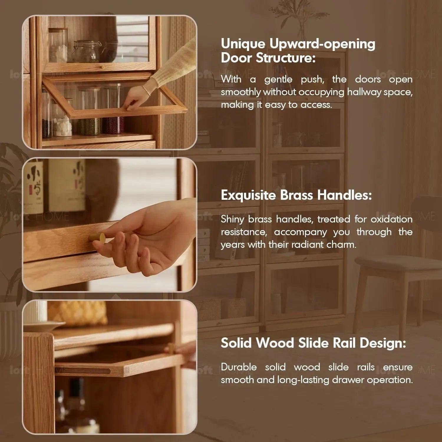 This elegantly crafted cabinet showcases a natural wood finish, exuding warmth and timeless style. Brass handles add a touch of sophistication, while spacious shelves and clear glass doors create the perfect display for treasured items and essential documents.