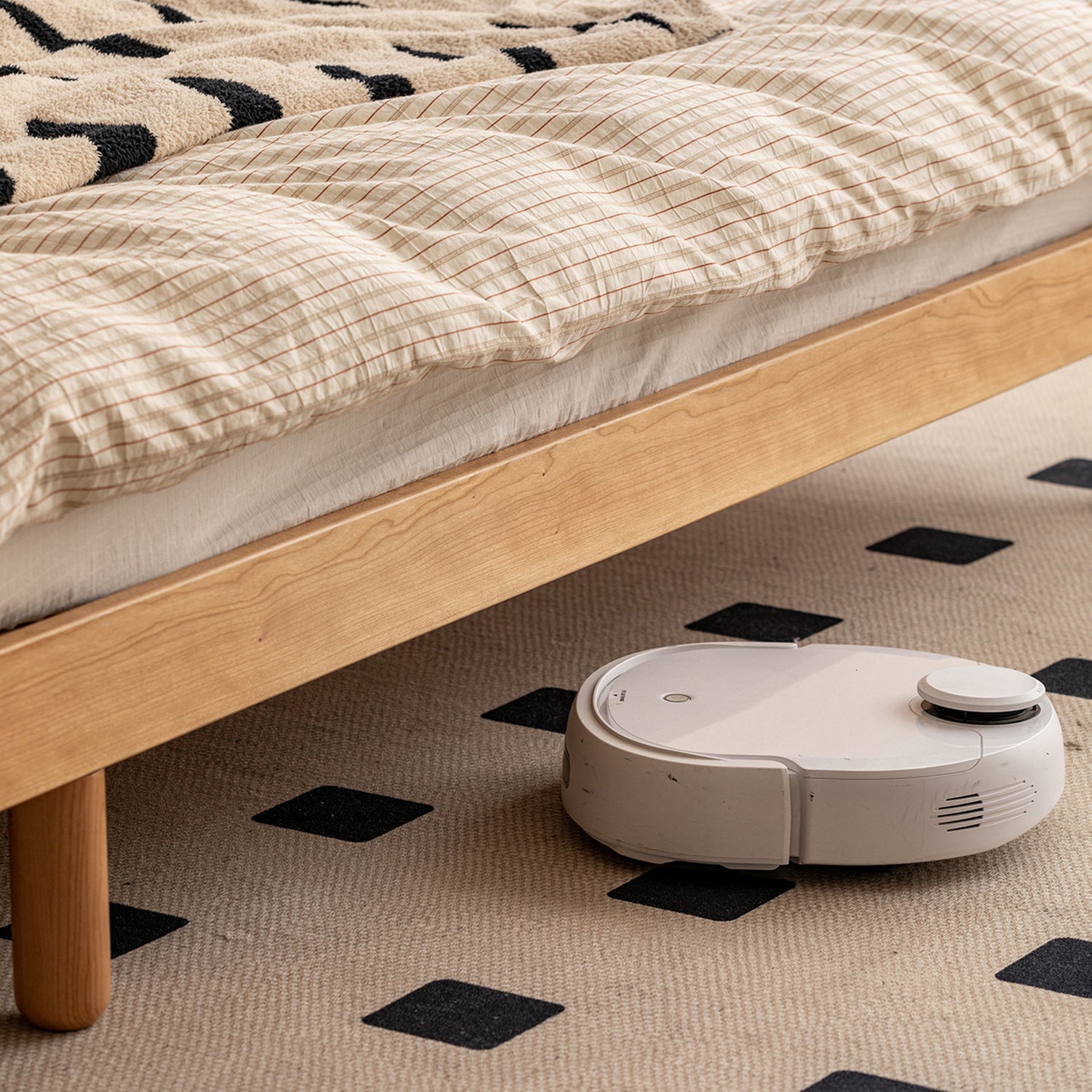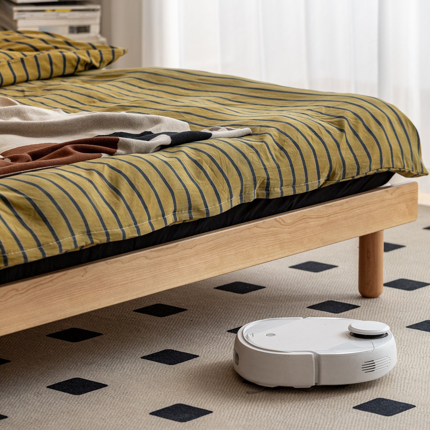 Plank design with raised edge prevents mattress shifting while allowing easy sheet changes and robot vacuum access
