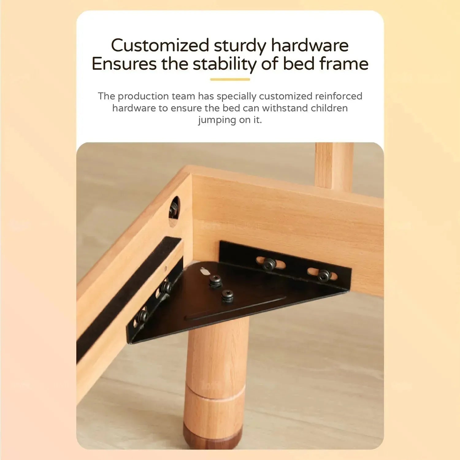 Custom heavy-duty hardware, bounce without worry. Our production team specially beefed up the hardware to ensure a rock-solid bed frame.