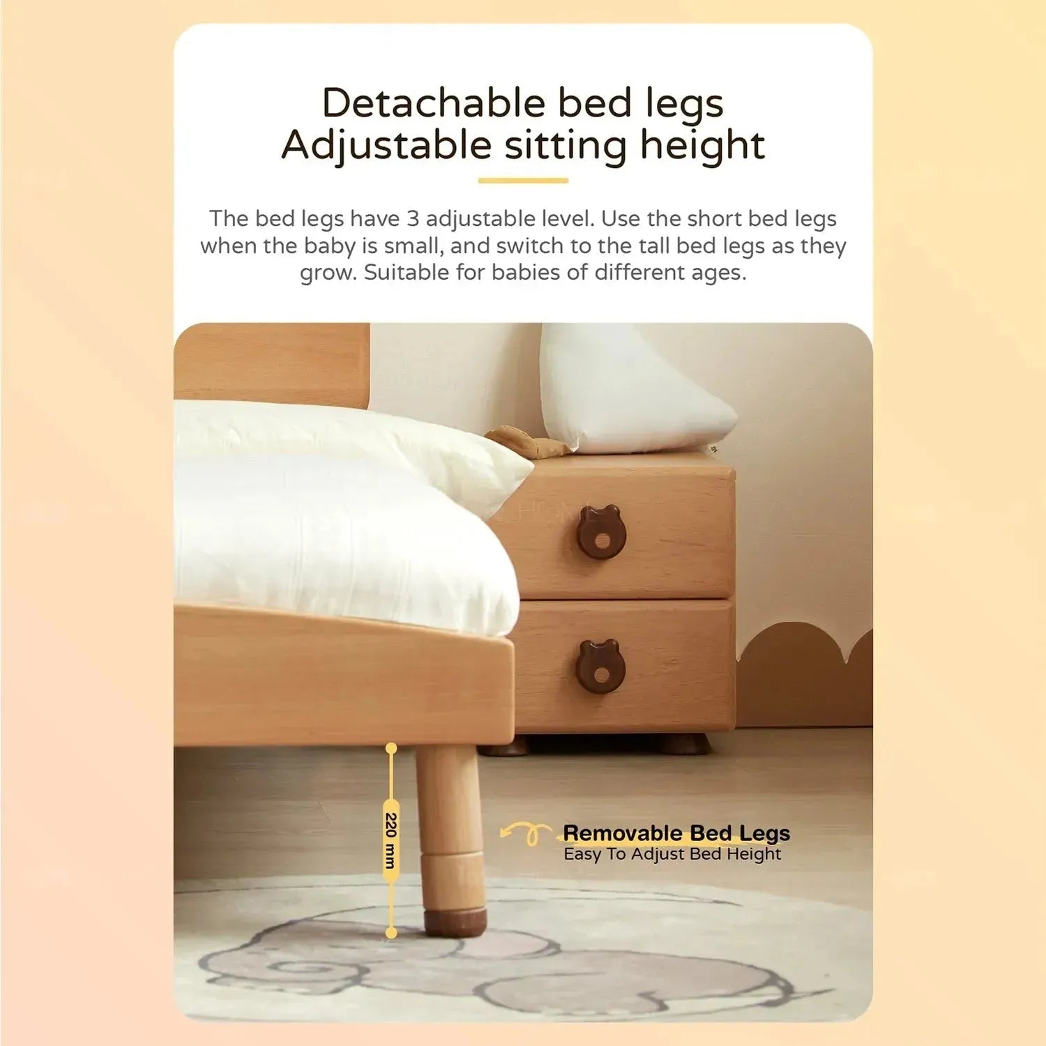 The bed legs come in three sections – use the short ones when your little one is small, switch to the tall ones as they grow. Perfect for different ages, making climbing up and down a breeze.