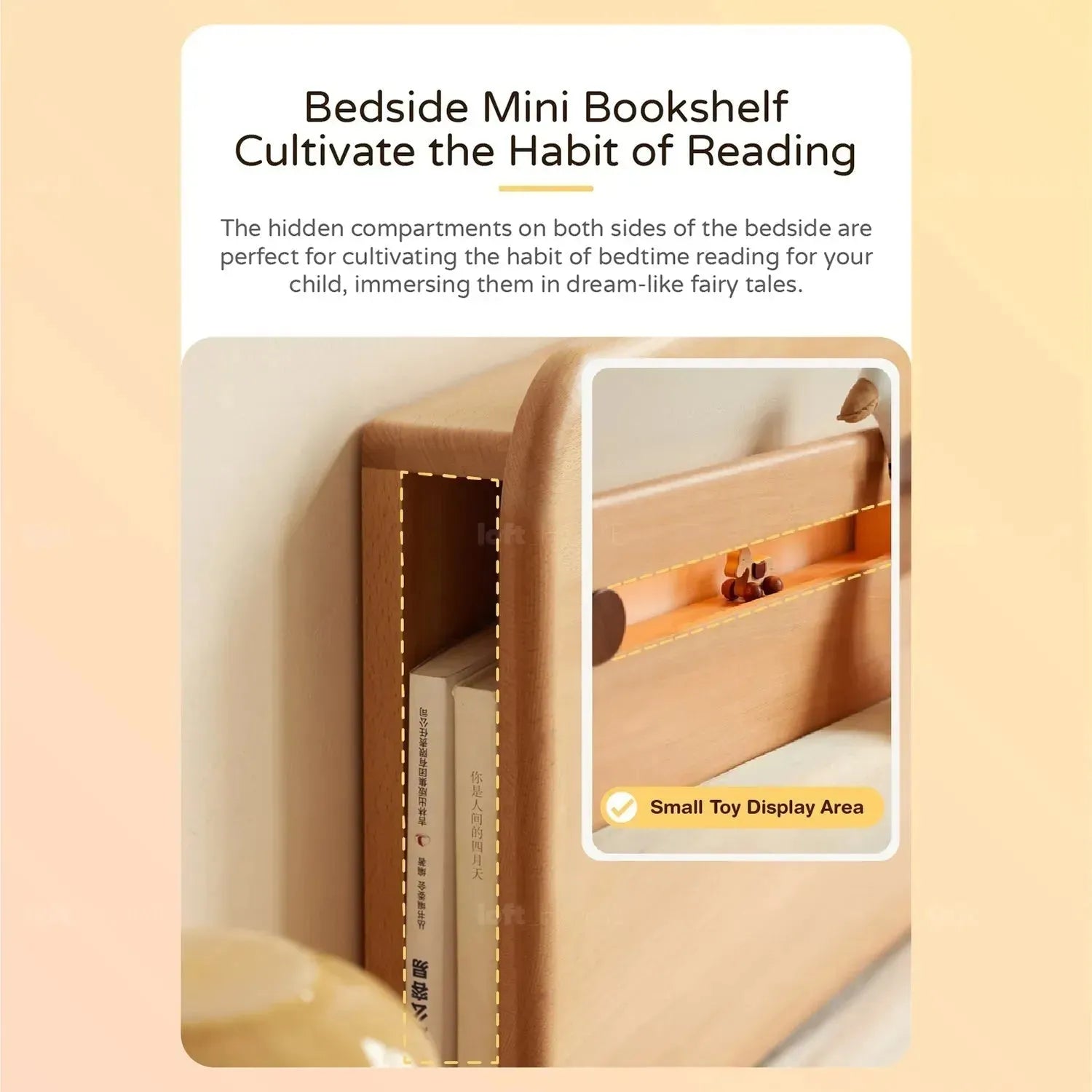 Built-in touch-controlled nightlight on the bedhead. A gentle touch activates the warm yellow light, softer than moonlight.