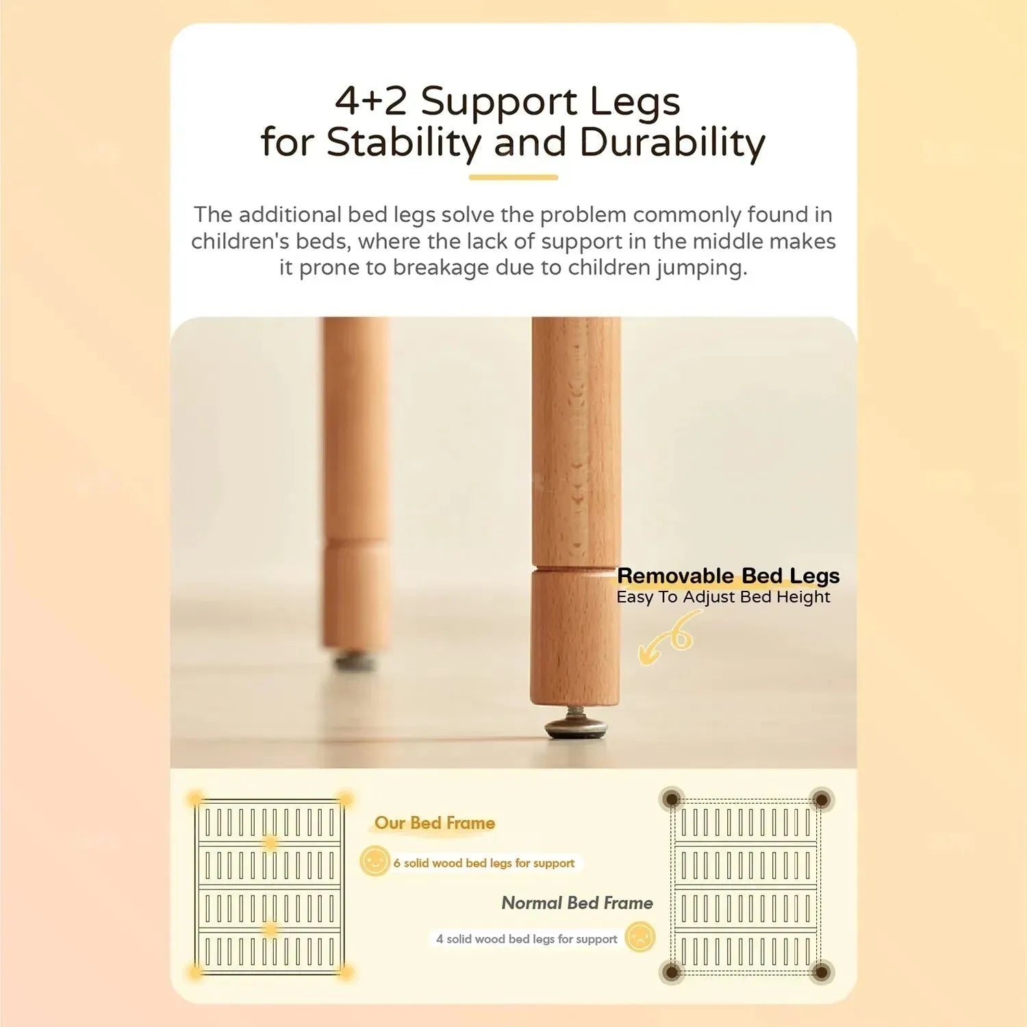 Solid wood planks, naturally eco-friendly, sturdy and reliable, evenly distribute pressure, no wobbling, no creaking - ensuring a stable and peaceful sleep for children.