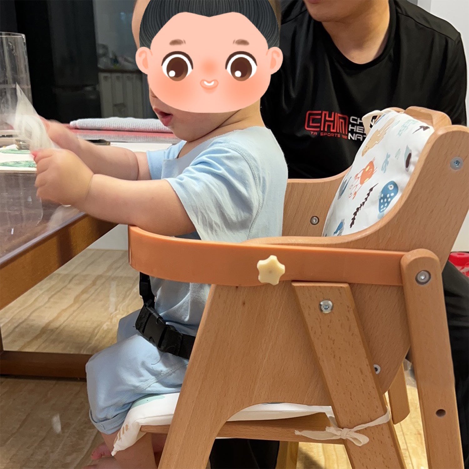The solid wood tray is adjustable for growing children, with a curved seat and backrest designed for ergonomic support. |
