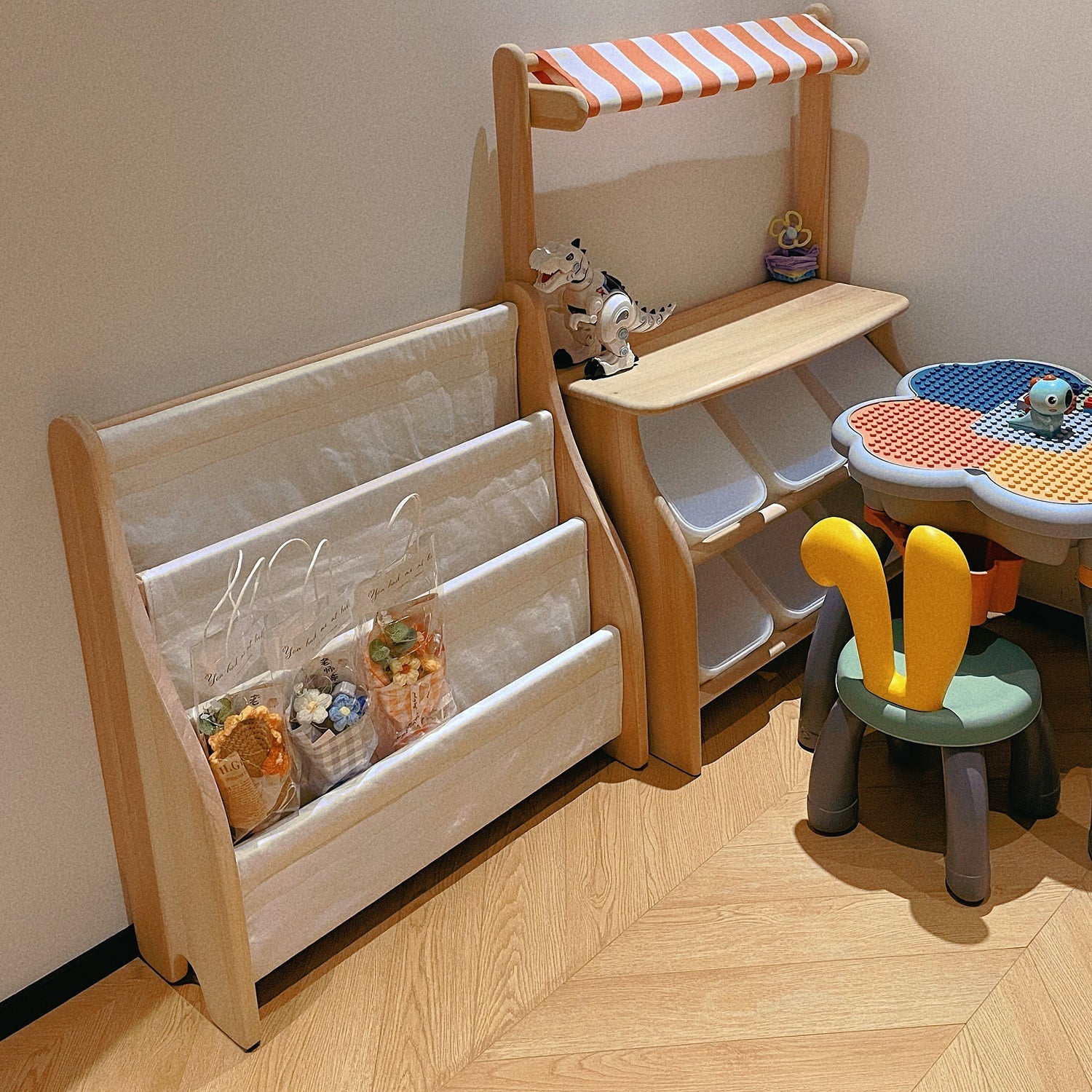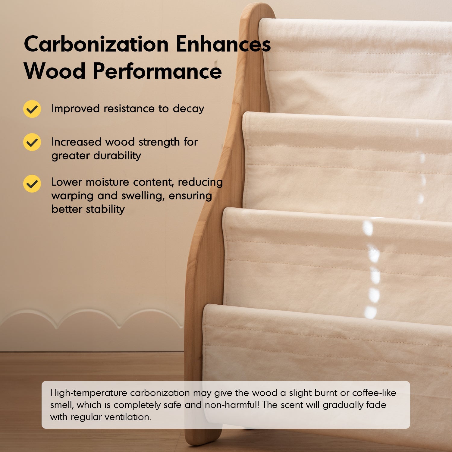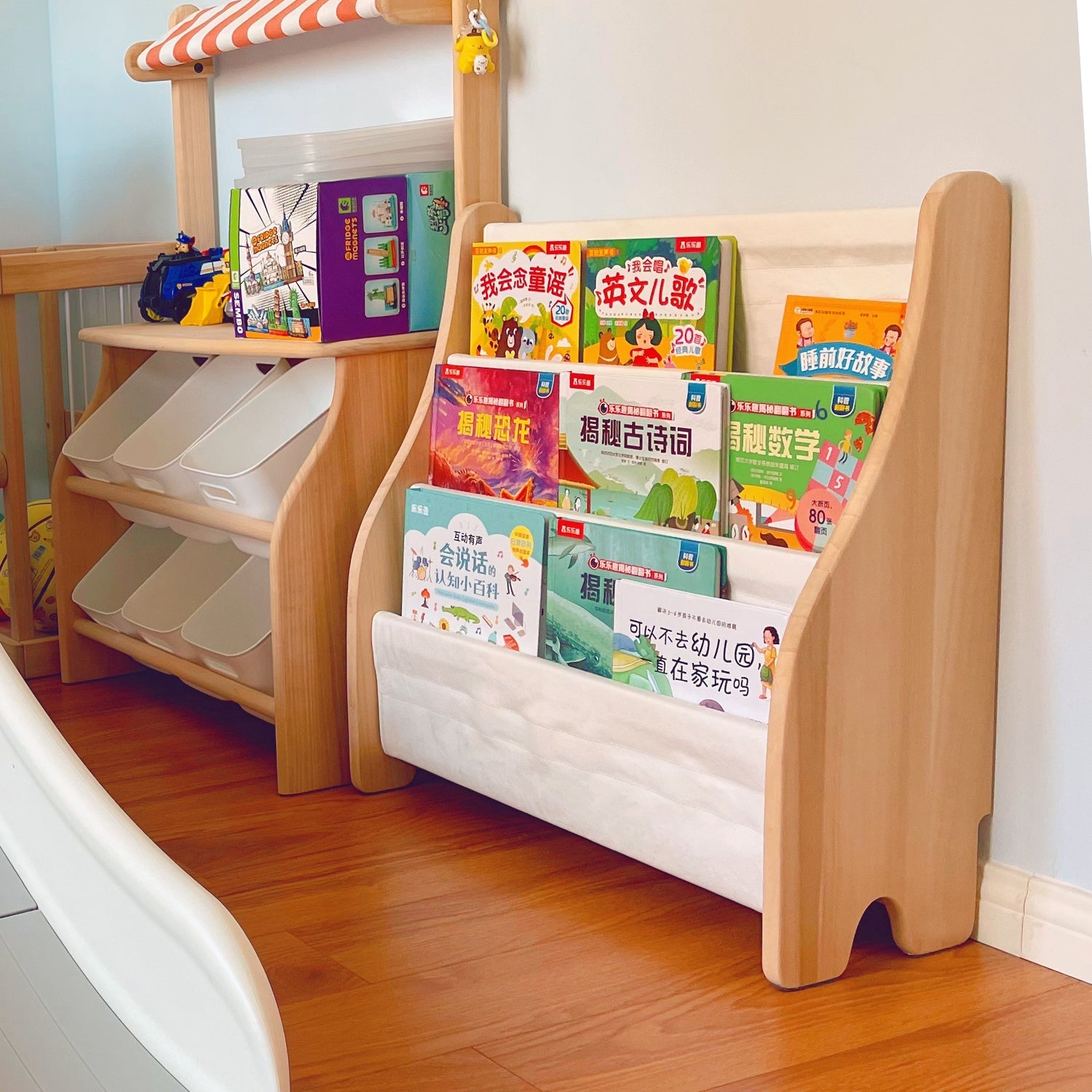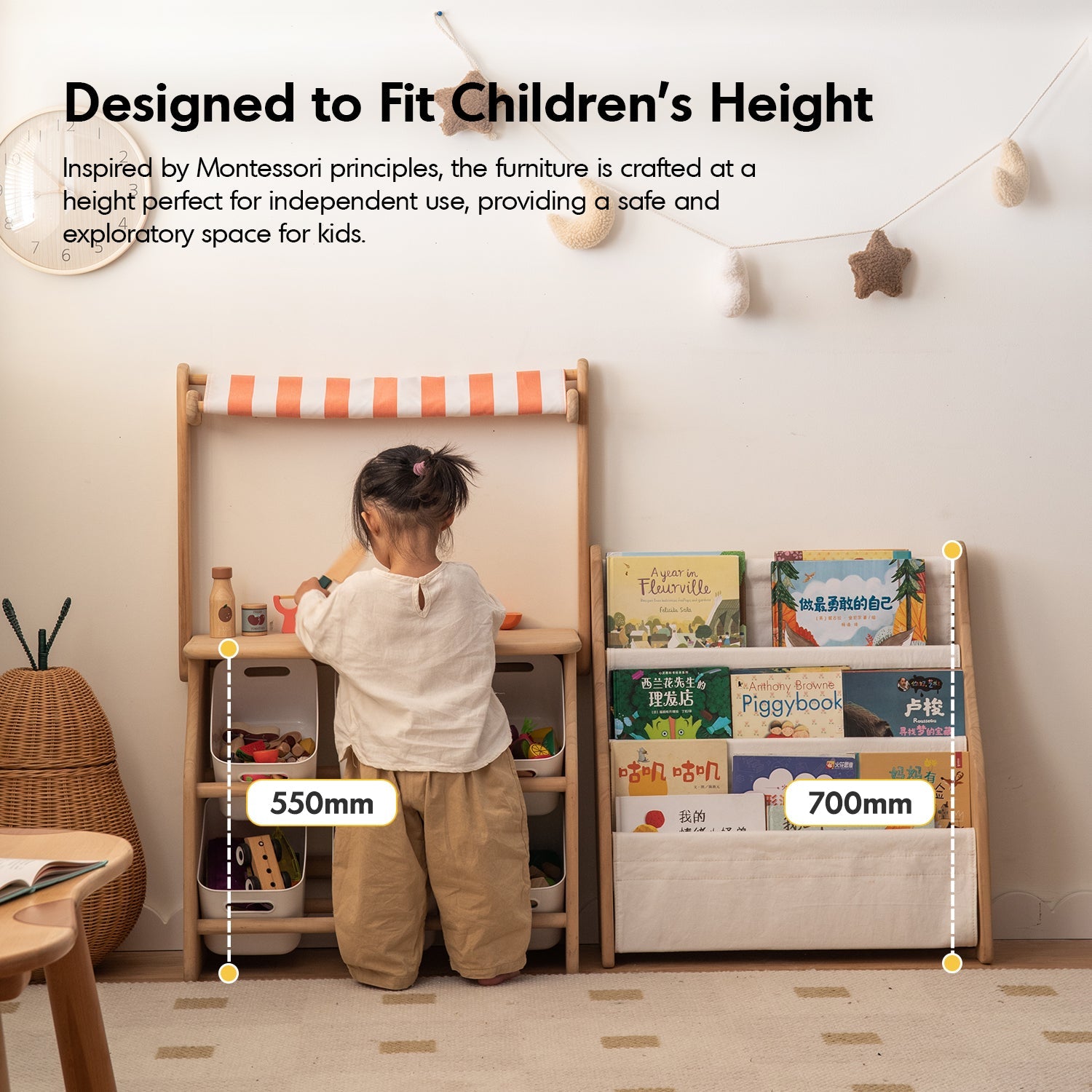 The Scandinavian Poplar Wood Kids Bookshelf LUNA combines style and practicality, encouraging a love for reading with its easy-to-reach, four-tier display. Crafted from 100% solid, non-toxic poplar wood, it's built to withstand everyday use while ensuring safety for your little ones. With a removable, washable fabric cover, it's as easy to maintain as it is functional - perfect for nurturing independent play