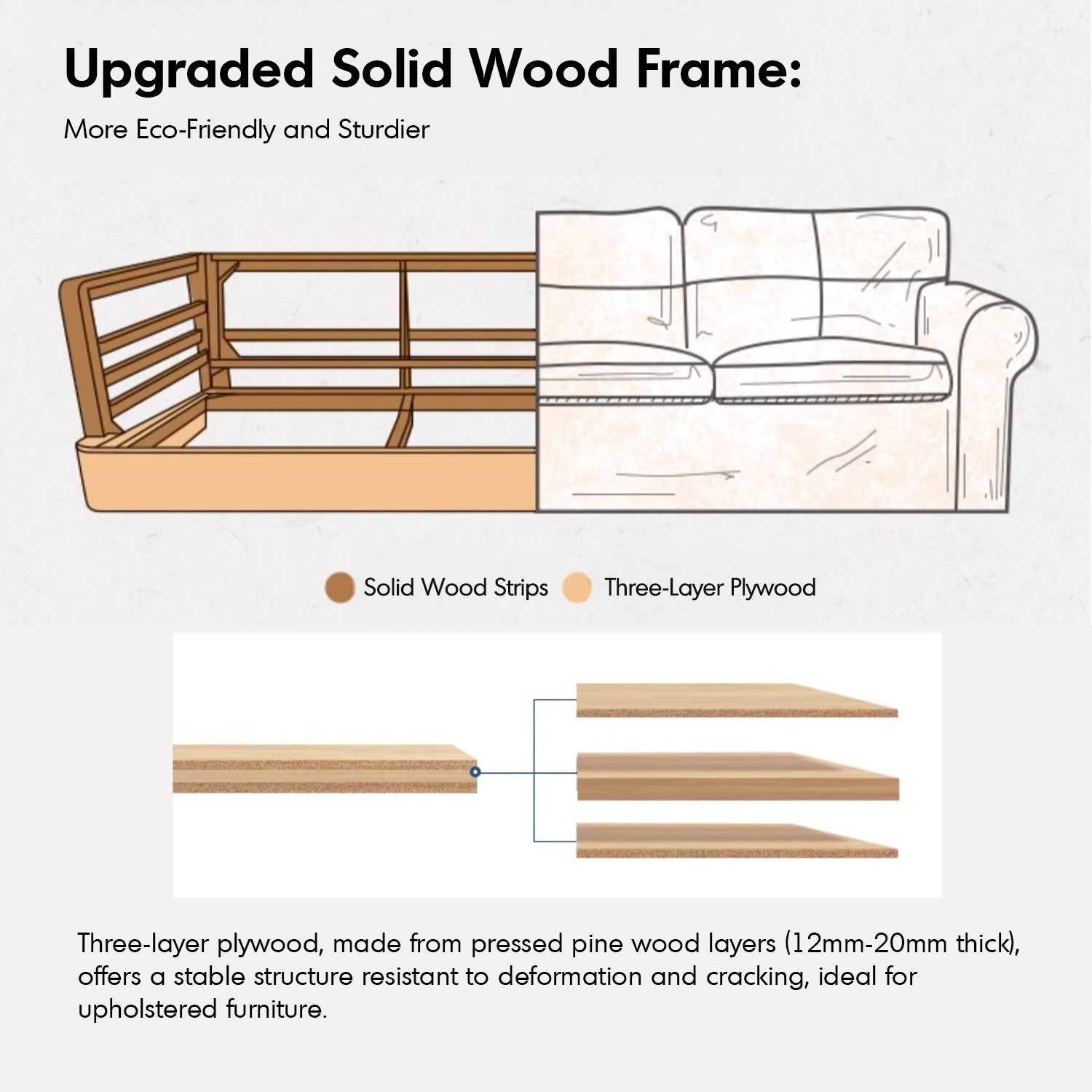 Constructed with an upgraded three-layer plywood frame, the sofa offers exceptional stability and resistance to deformation, ensuring long-term reliability. |