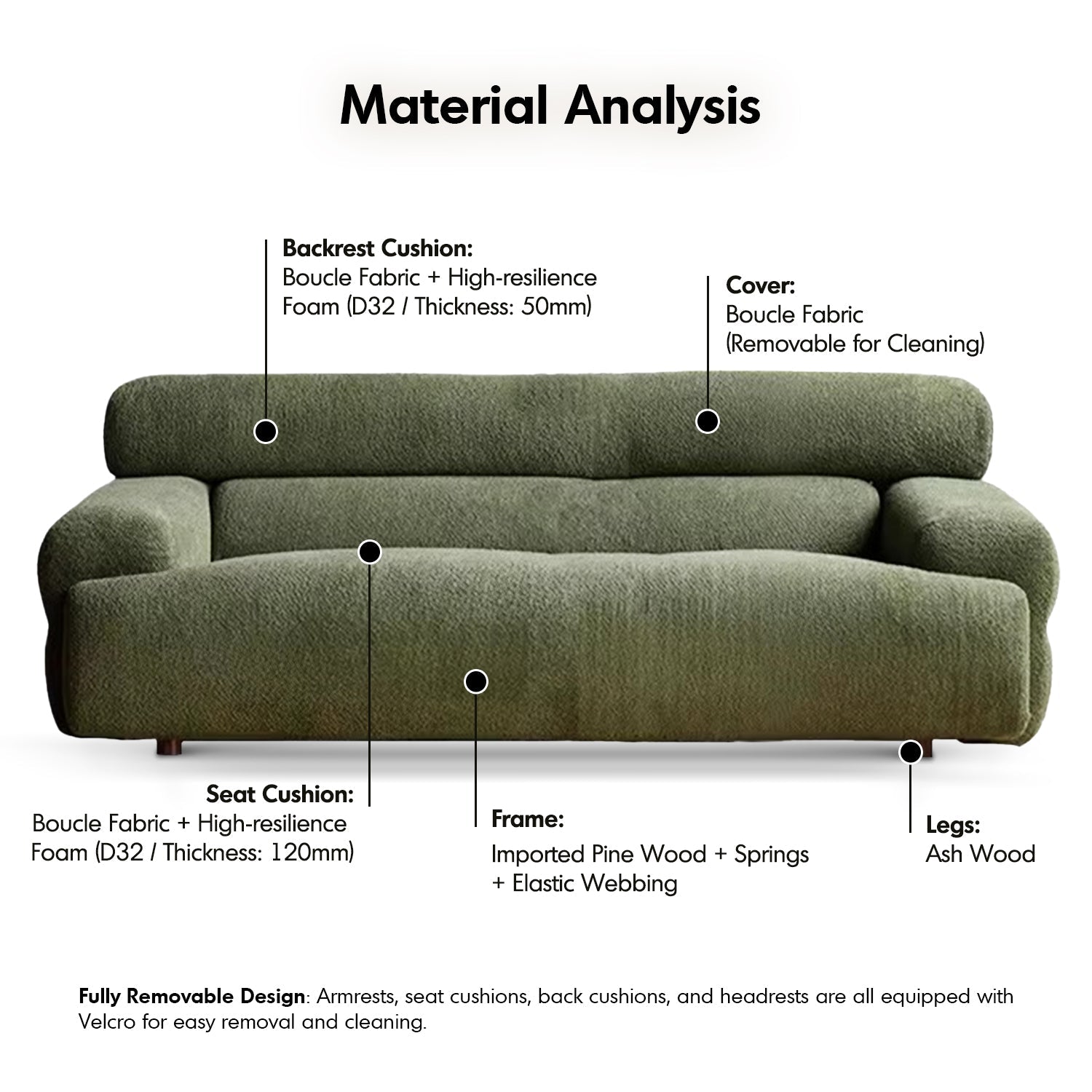 All cushions and armrests feature Velcro attachments, making them fully removable and washable for effortless cleaning. |