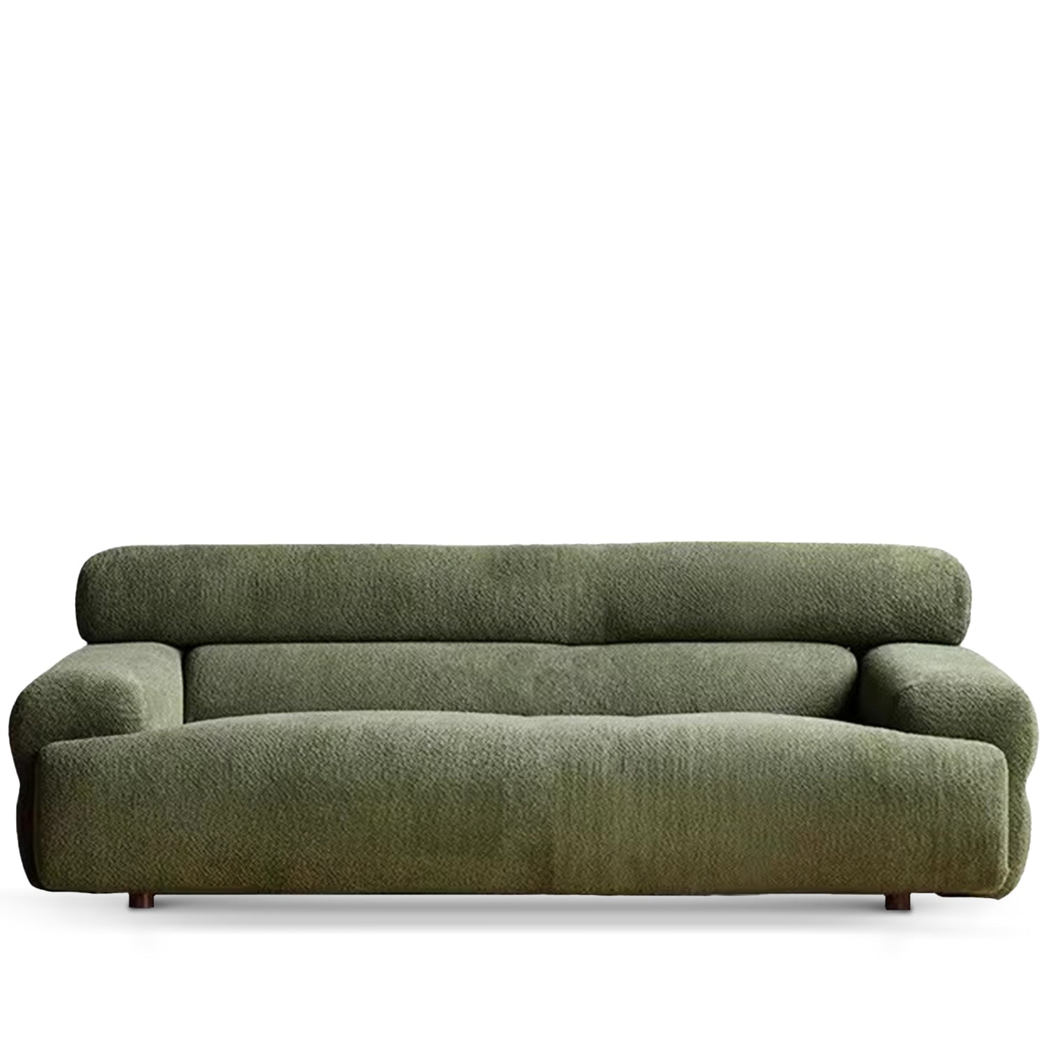 With plump, toast-like seat cushions and a muted green bouclé fabric, this sofa combines vintage charm with modern elegance. |