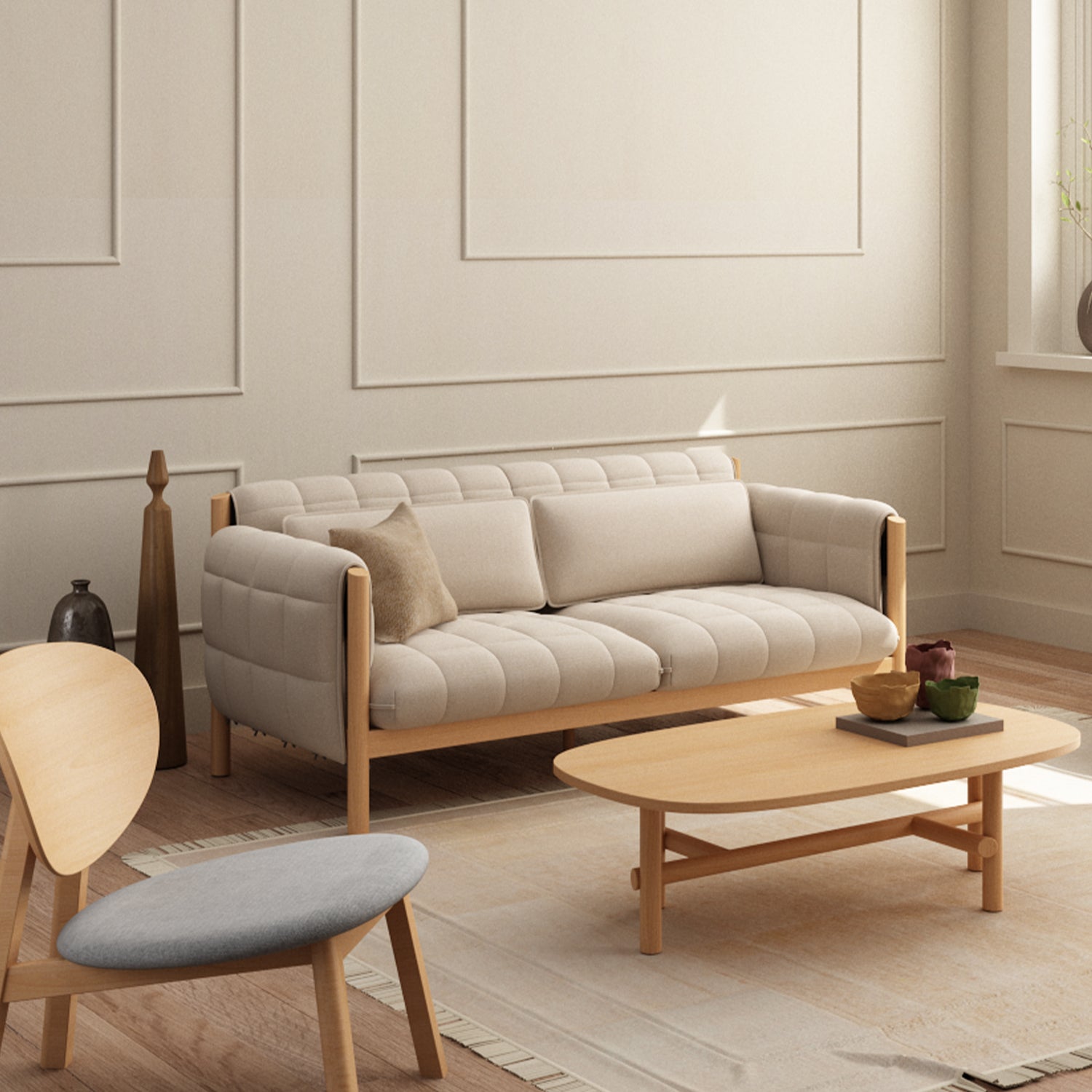 Scandinavian Beech Wood Fabric 2 Seater Sofa HILDA blends wide, cozy seating with fine craftsmanship. Made with European beech wood, soft padding, and eco-friendly materials, it ensures comfort and style from every angle. Available in multiple colors to perfectly match your decor.