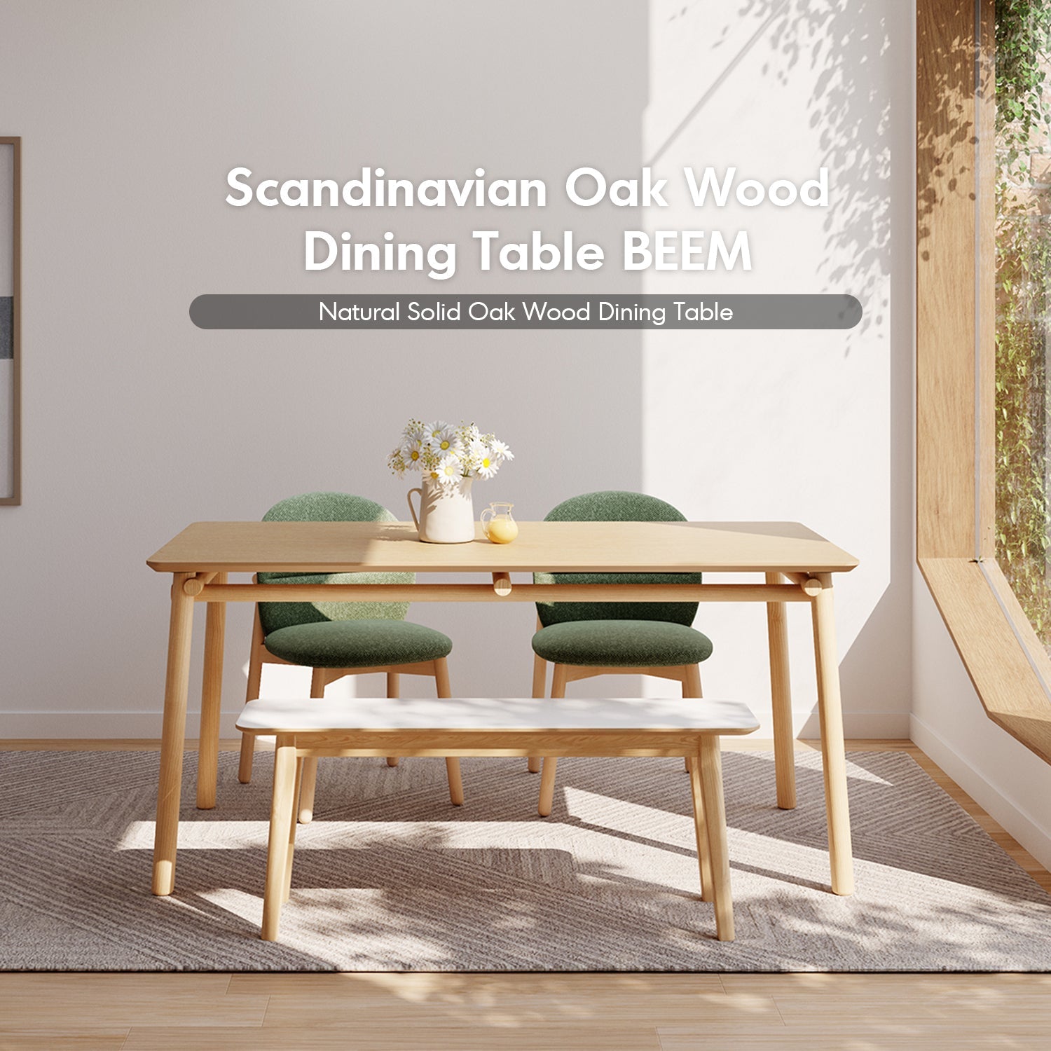 The Scandinavian Oak Wood Dining Table BEEM blends natural elegance with practicality. It features a solid oak frame with an embossed texture, a durable MDF core, and a clear lacquer finish. Its spacious design complements any space, making it a versatile choice for dining, work, or gatherings, all while adding a touch of minimalist sophistication.