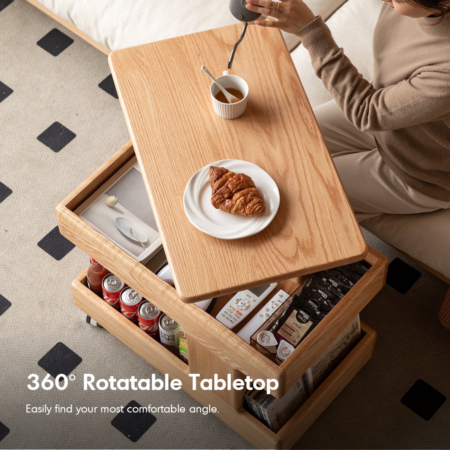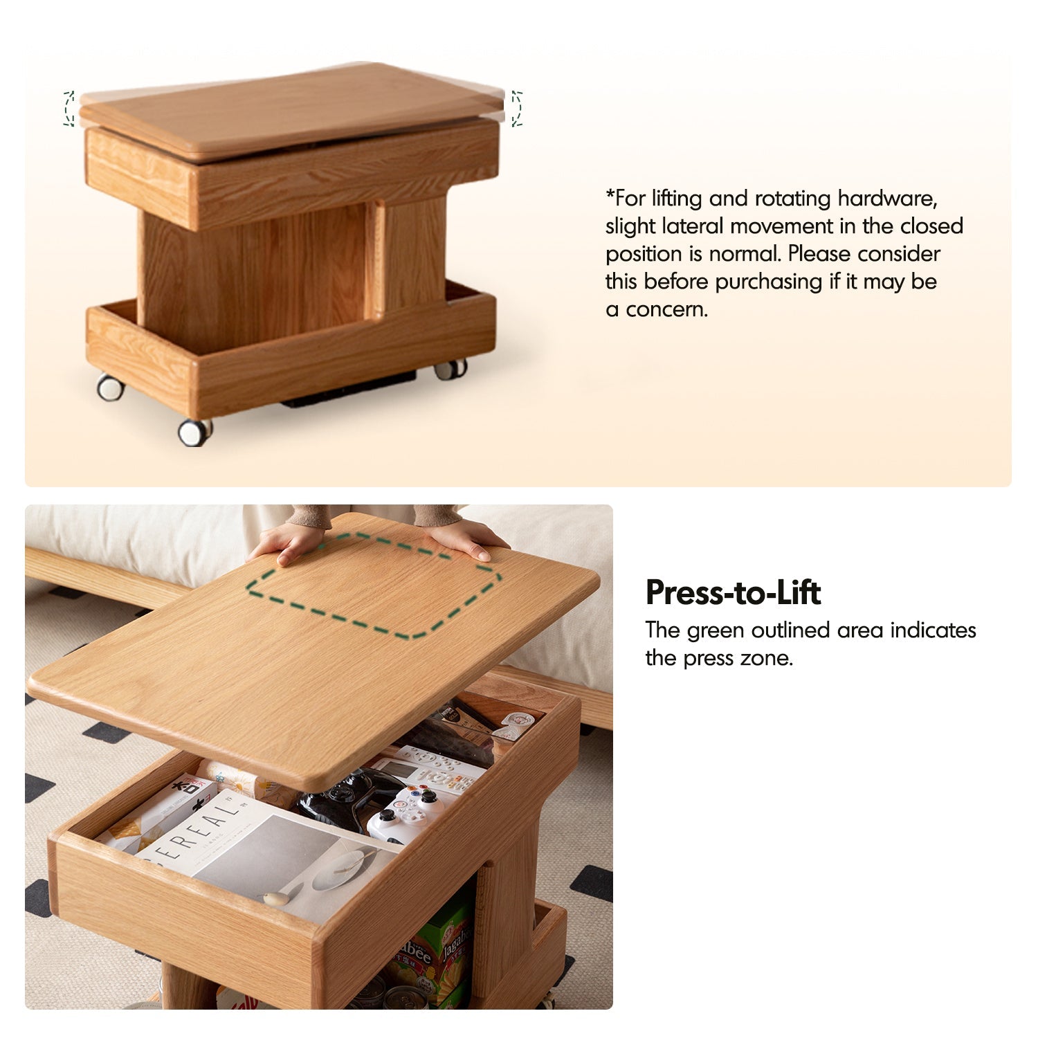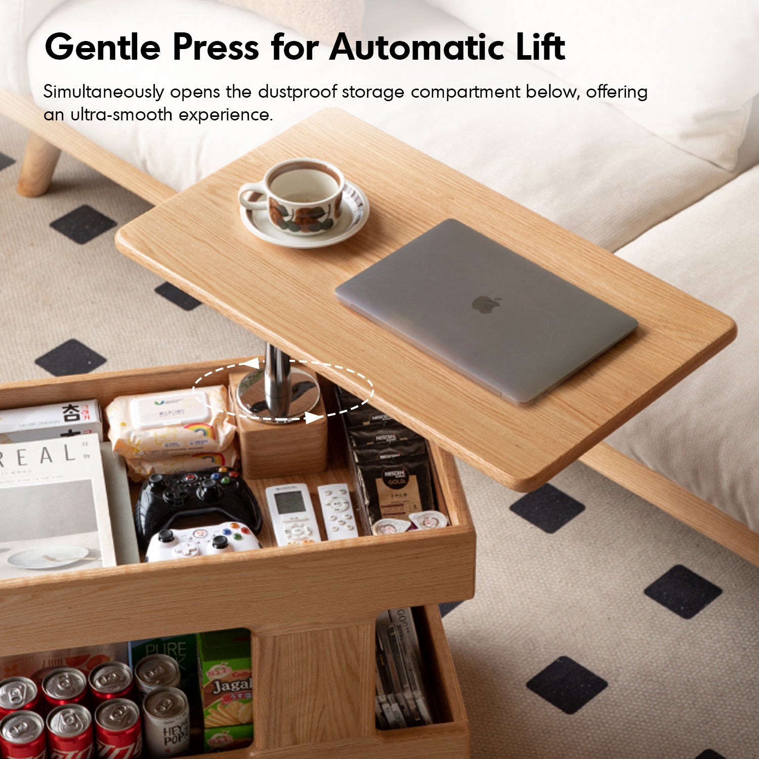 The Scandinavian Oak Wood Height Adjustable Coffee Table LIFT combines versatility and elegance. With a 360° rotatable tabletop, smooth gas lift, and spacious dustproof storage, it's perfect as a trolley, bedside table, or desk. Durable, stylish, and effortlessly funct