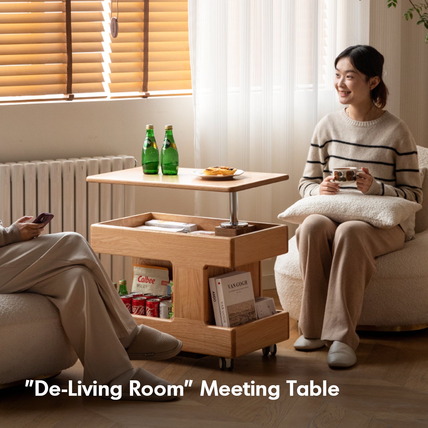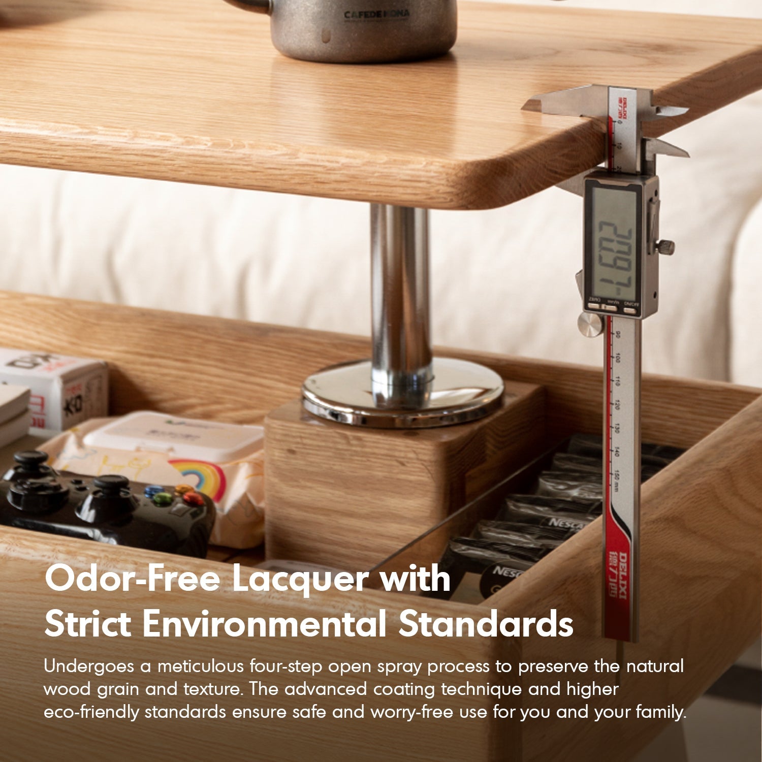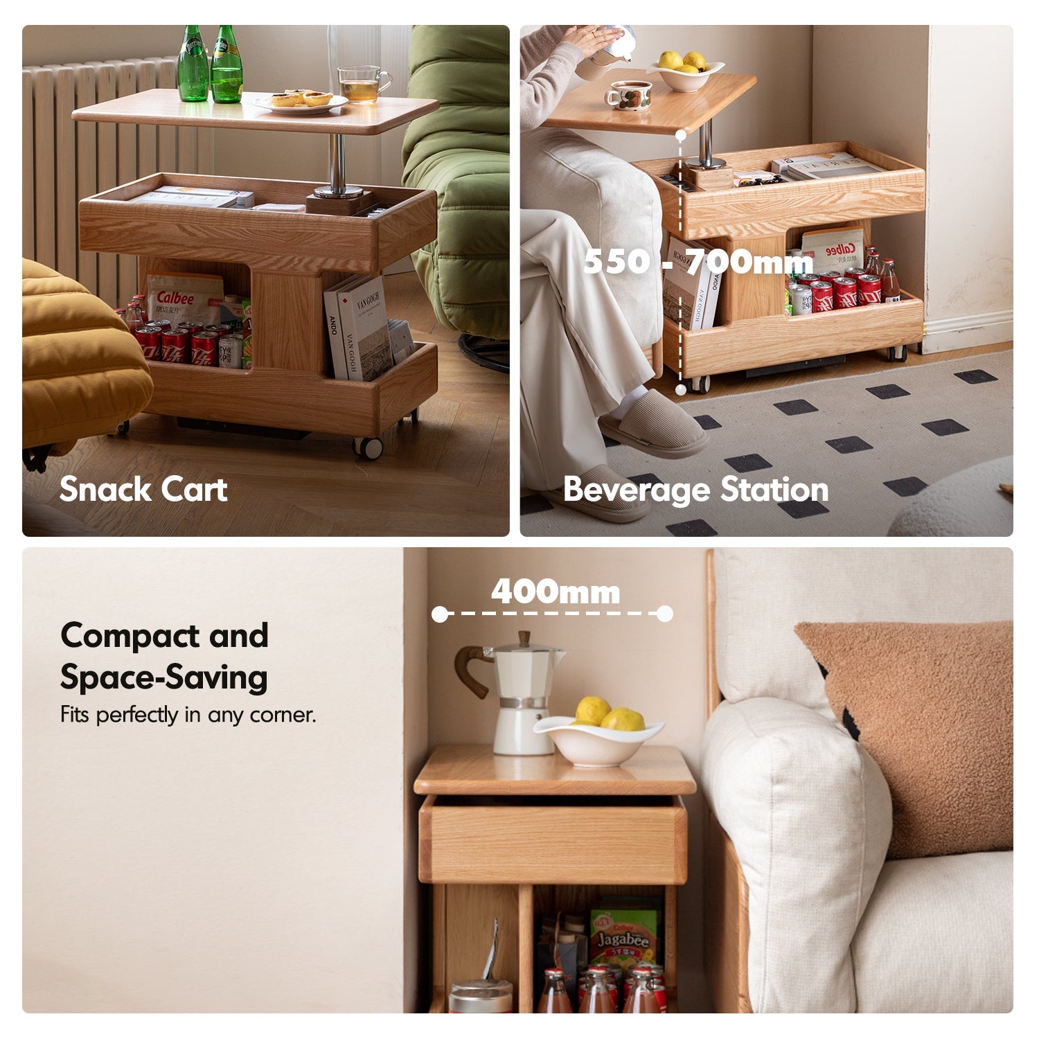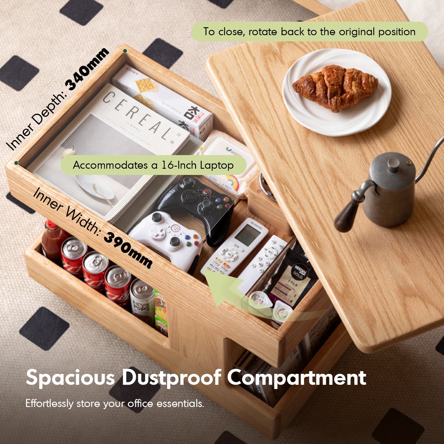 The Scandinavian Oak Wood Height Adjustable Coffee Table LIFT combines versatility and elegance. With a 360° rotatable tabletop, smooth gas lift, and spacious dustproof storage, it's perfect as a trolley, bedside table, or desk. Durable, stylish, and effortlessly funct