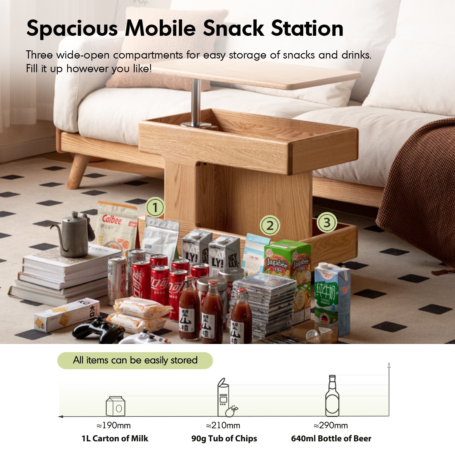 Includes a hidden compartment and open shelves, perfect for storing essentials, beverages, or snacks, keeping your space organized and tidy.