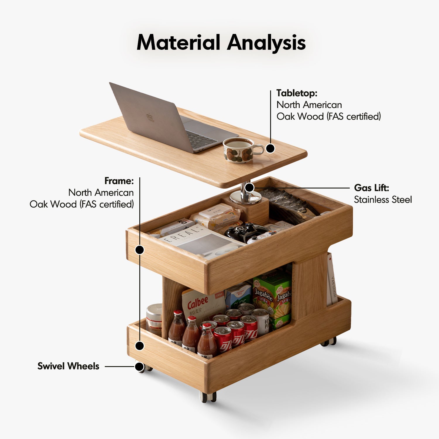 The 120N gas lift system allows a gentle press to elevate the table effortlessly, transforming it into a trolley, bedside table, or temporary desk panel.