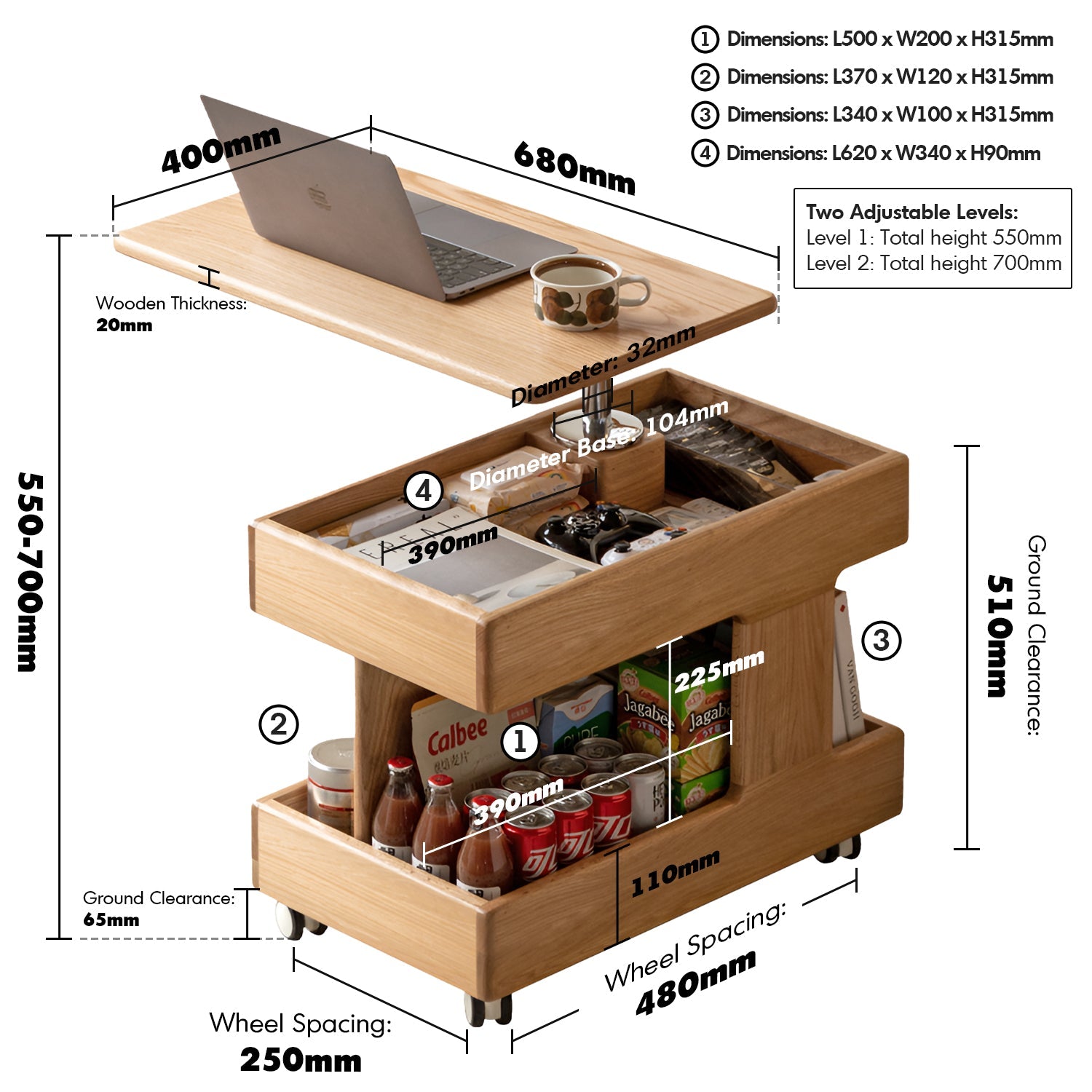 - L680 x W400 x H550-700mm