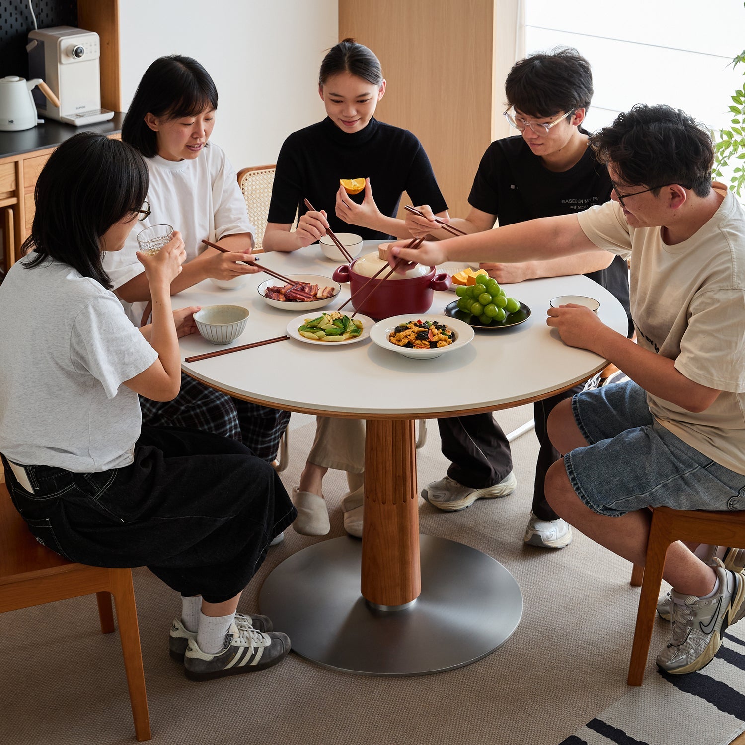 The round tabletop encourages comfortable seating and smooth movement around the table, perfect for family meals and social gatherings. |