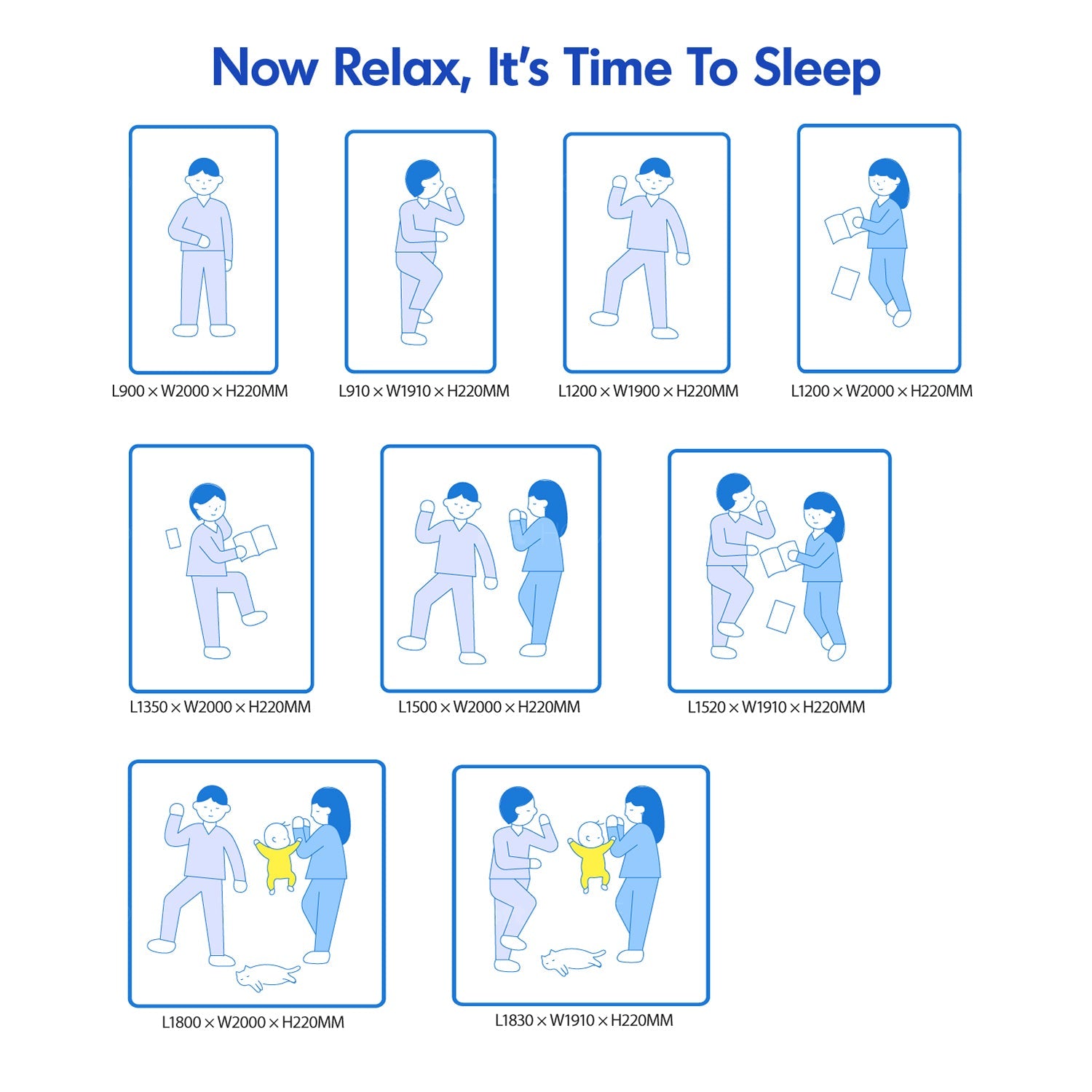 Asia Single: W900 x L2000 x H220mm SG Single: W910 x L1910 x H220mm Asia Super Single: W1200 x L2000 x H220mm Asia Queen: W1500 x L2000 x H220mm |