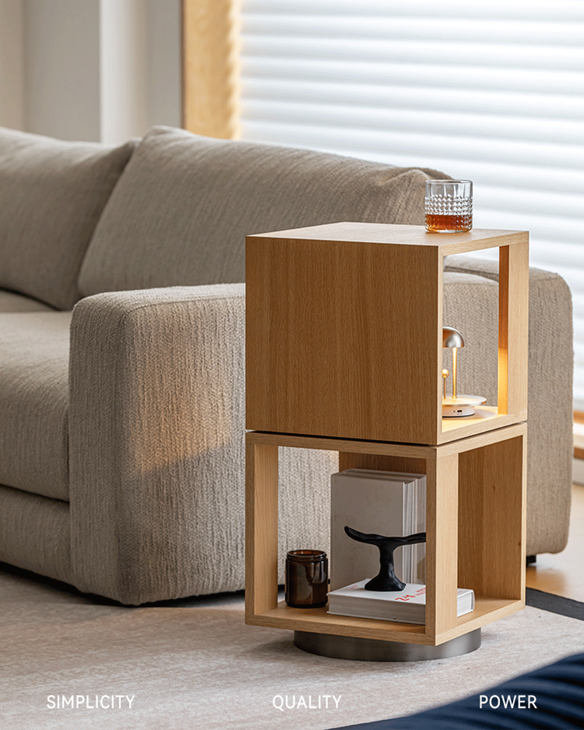 Minimalist Ash Wood Veneer Revolving Side Table AXEL features a smooth rotating top warm ash wood tones and a compact design that brings flexible everyday convenience to modern living spaces.