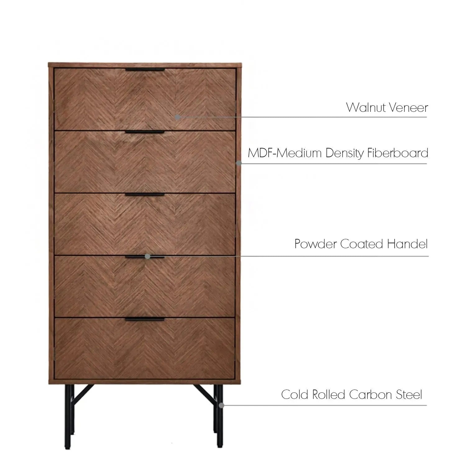 High-quality materials like Walnut veneer and Medium-density fibreboard (MDF) cases are used to create the modern plywood drawer cabinet, achieving both strength and beauty. The contemporary look of this design is complemented by the use of cold-rolled carbon steel legs and powder-coated handles.
