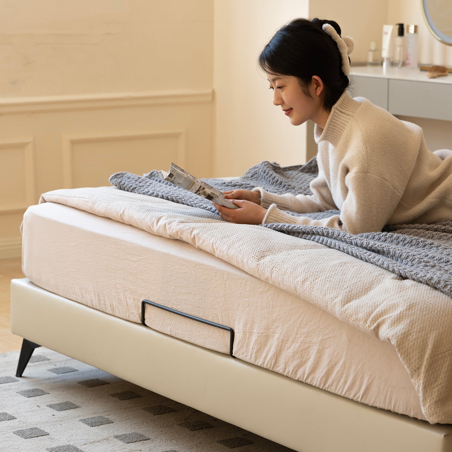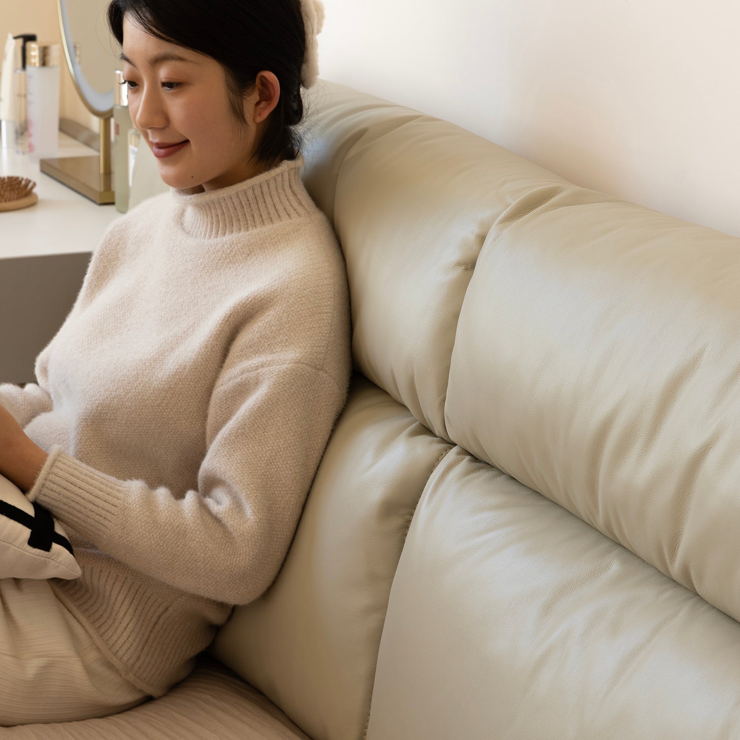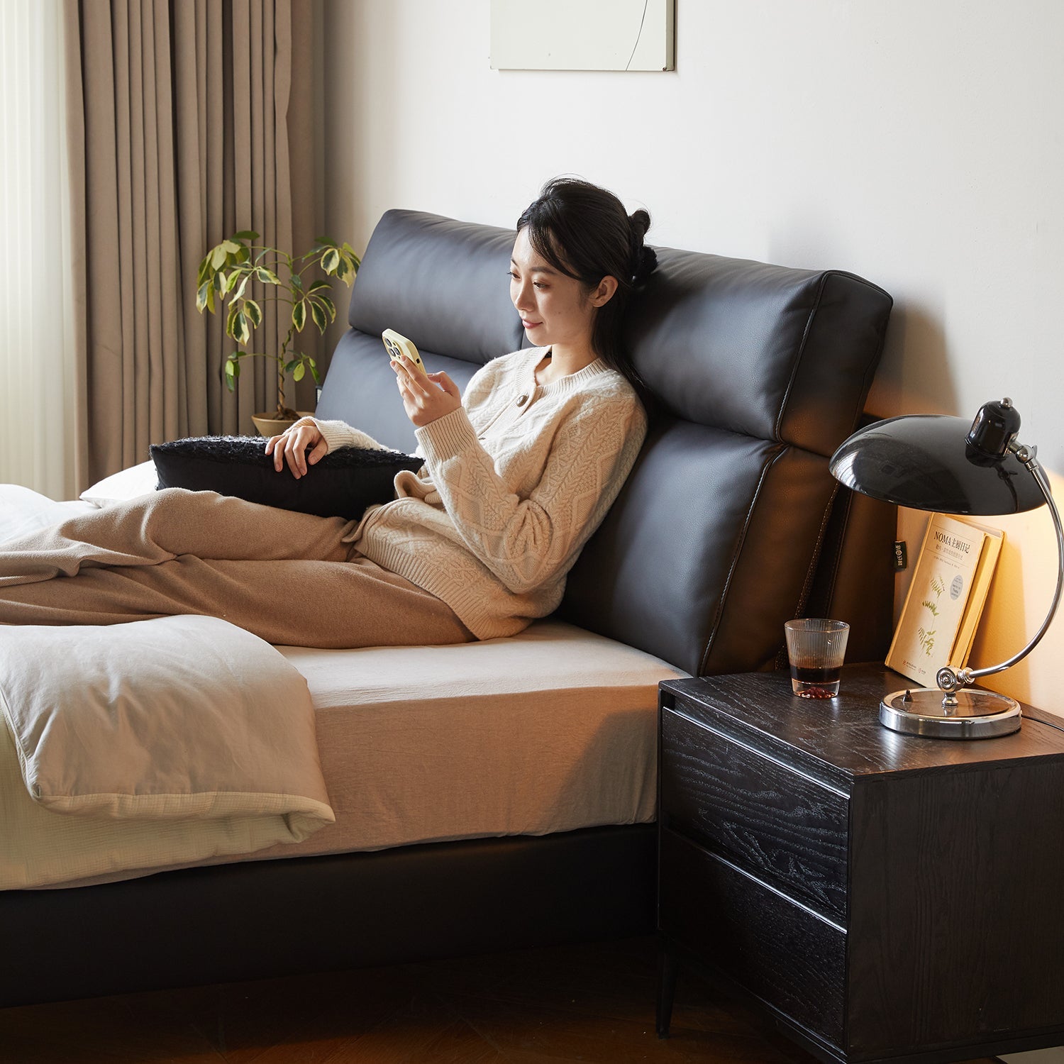 Modern Genuine Leather Bed Frame DUSKO combines ergonomic angles, plush feather fill, and natural leather softness designed for lasting comfort and everyday elegance.