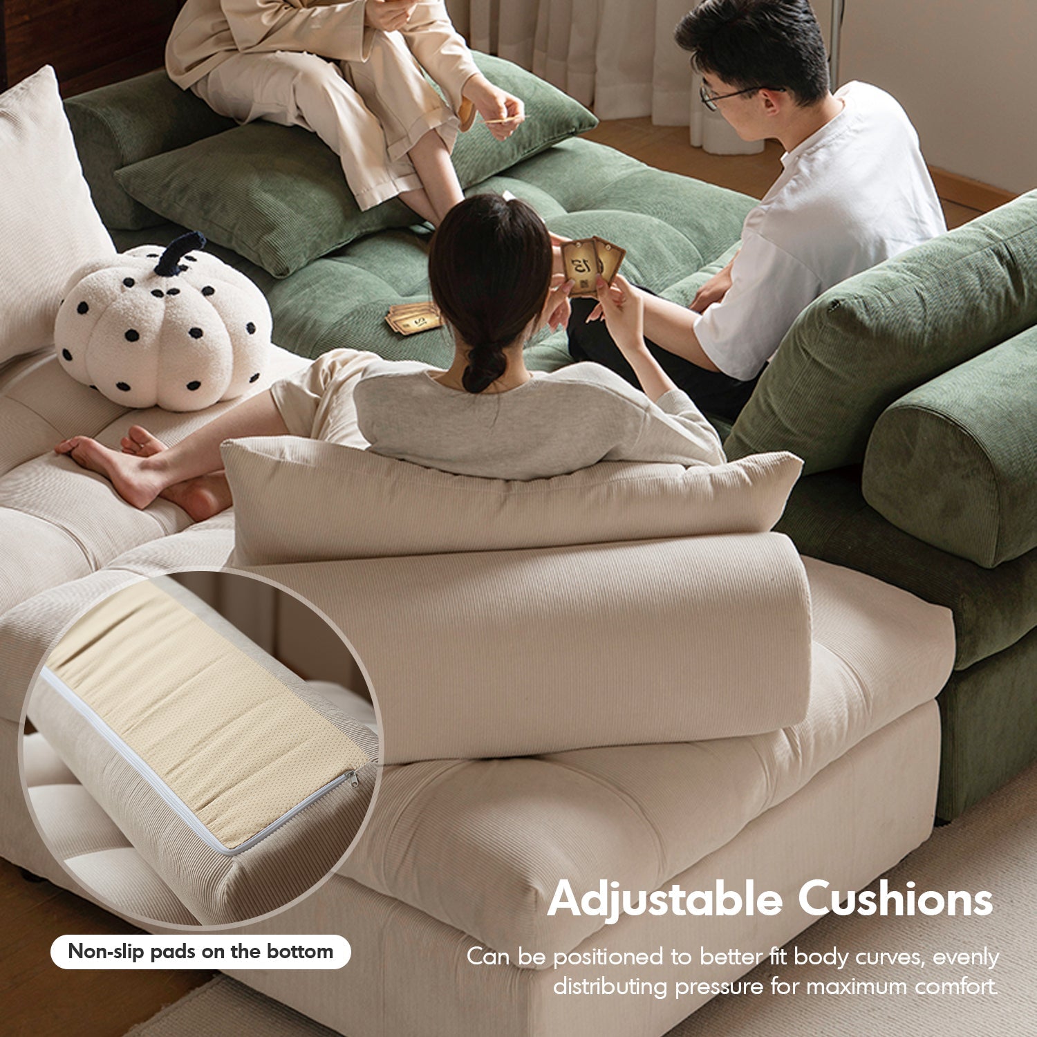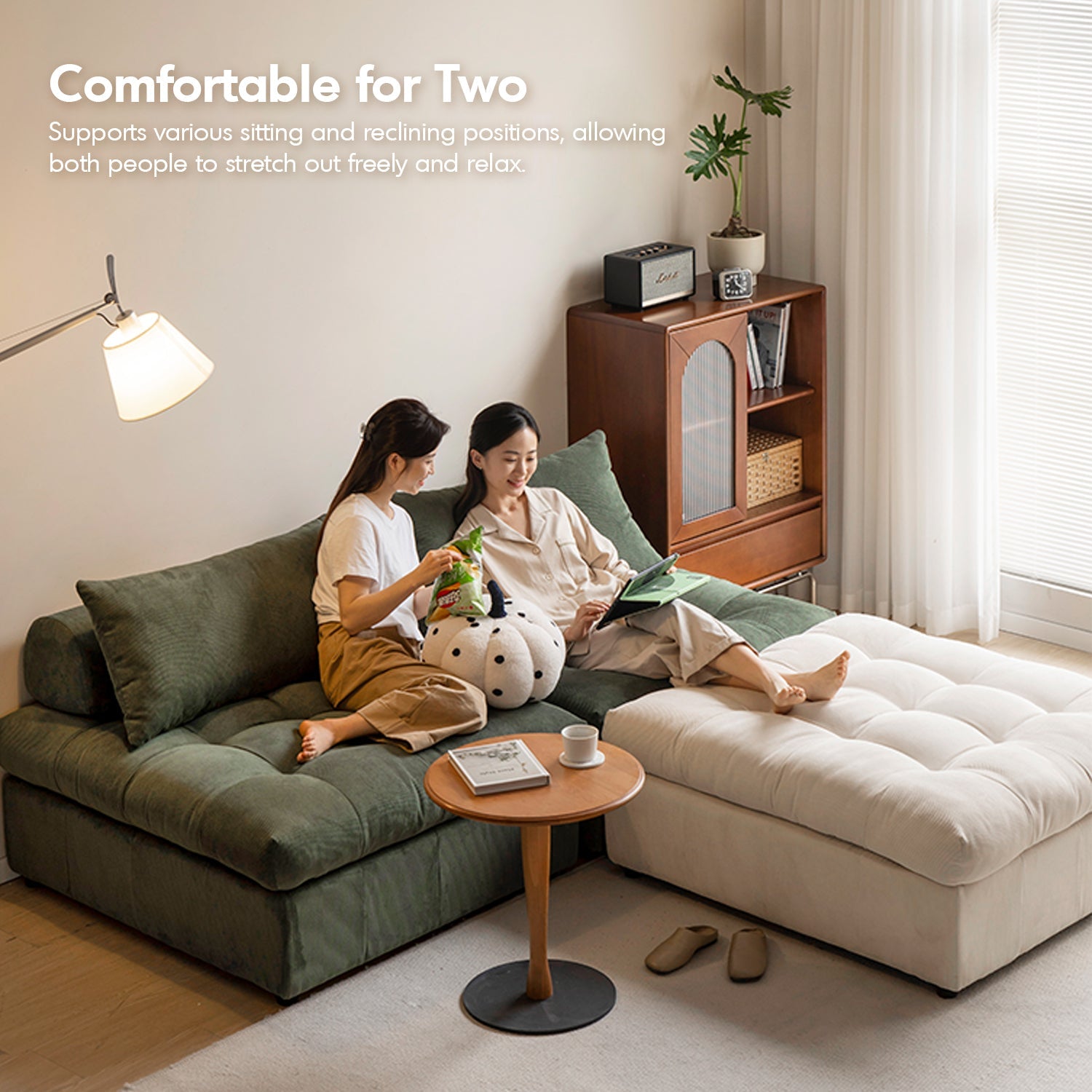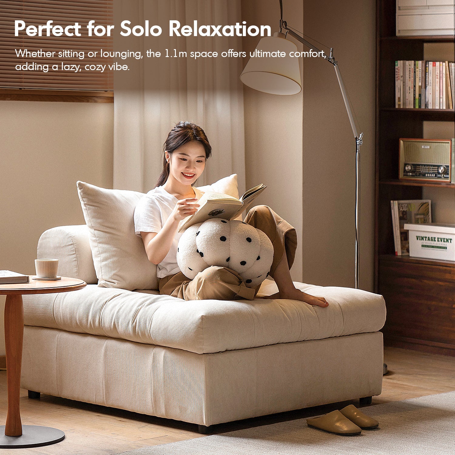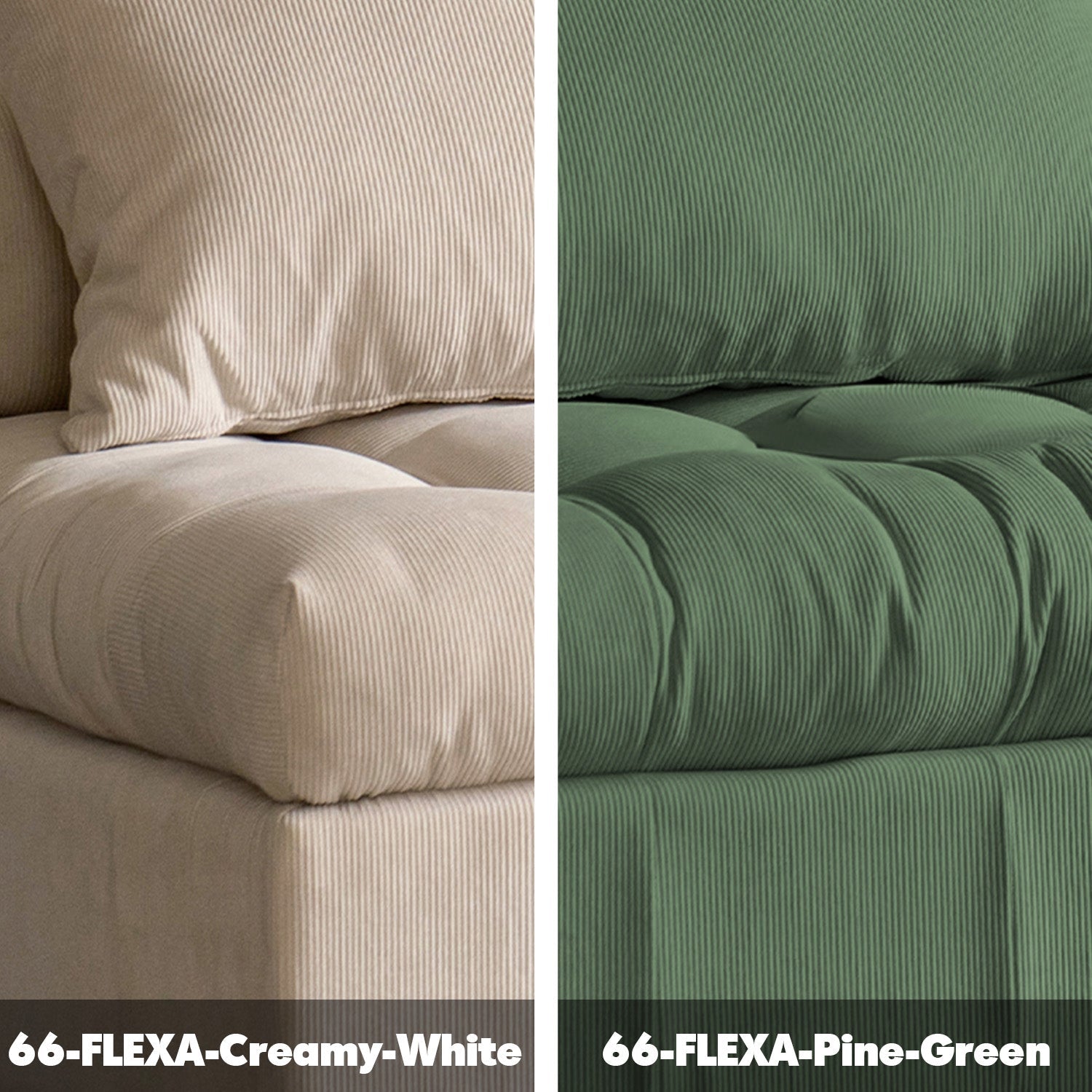 Modern Corduroy Velvet Fabric Modular Armless 1 Seater Sofa FLEXA is designed for ultimate comfort and versatility. Perfect for solo relaxation or cozy gatherings, it offers adjustable seat depth, plush corduroy fabric, and a supportive back cushion filled with soft doll cotton. FLEXA can transform into a sleeping surface or floor mat, making it ideal for naps or entertaining guests. With elegant button-tufting and exquisite stitching, FLEXA is available in Pine Green and Creamy White, adding a warm, stylish touch to any room.