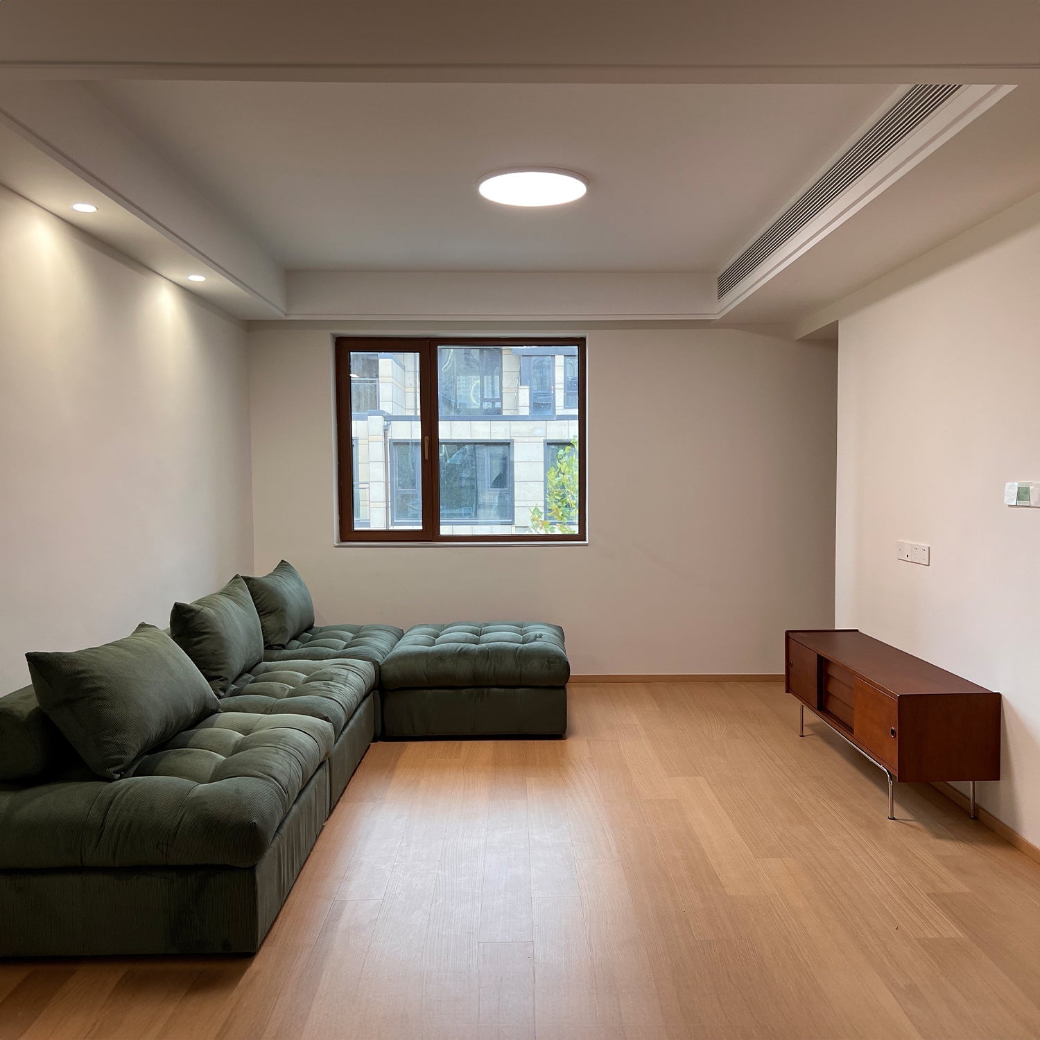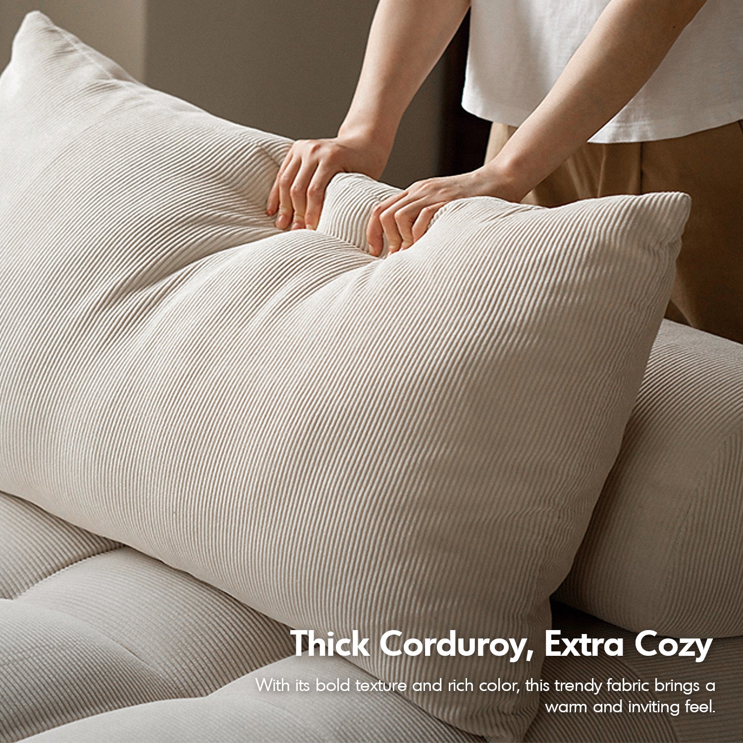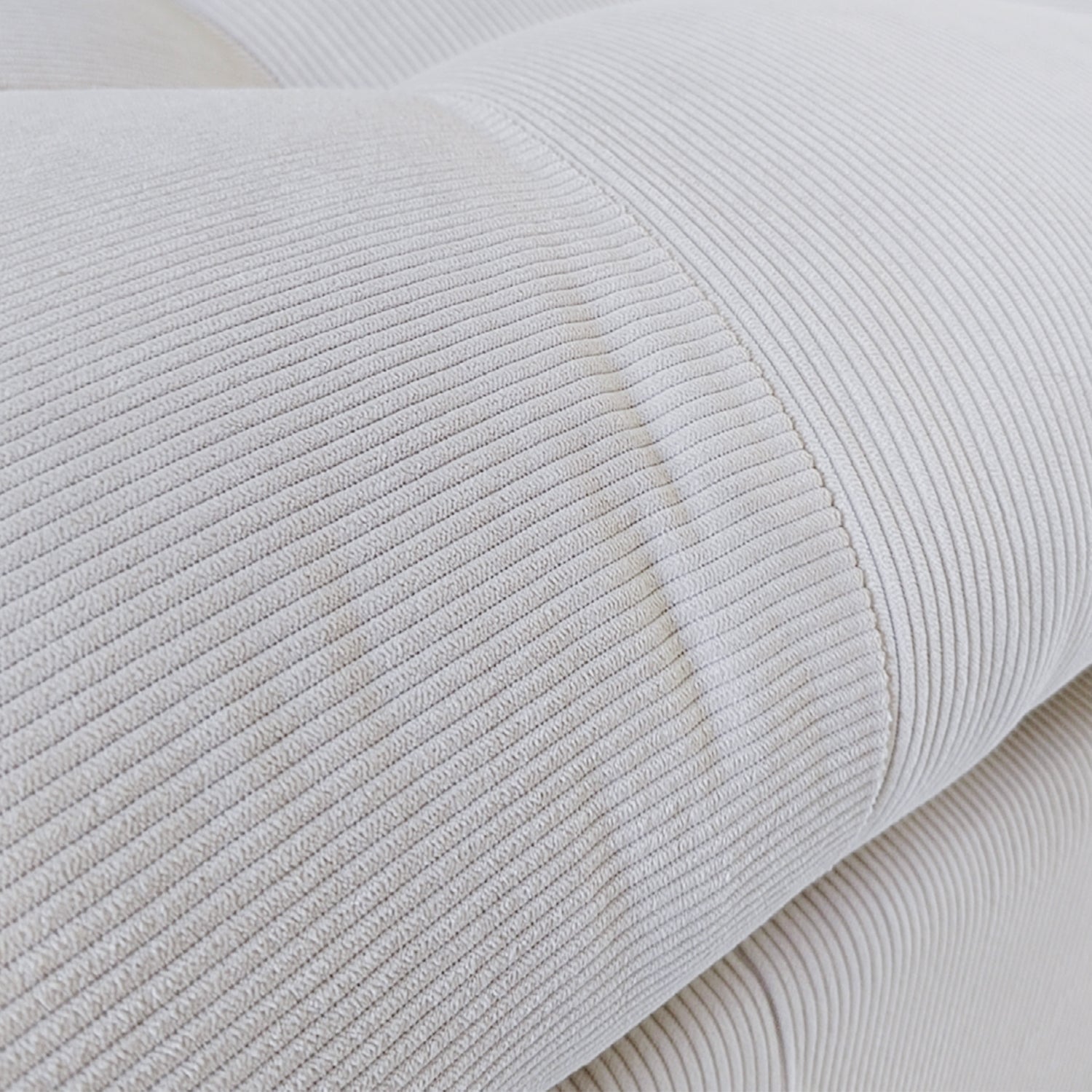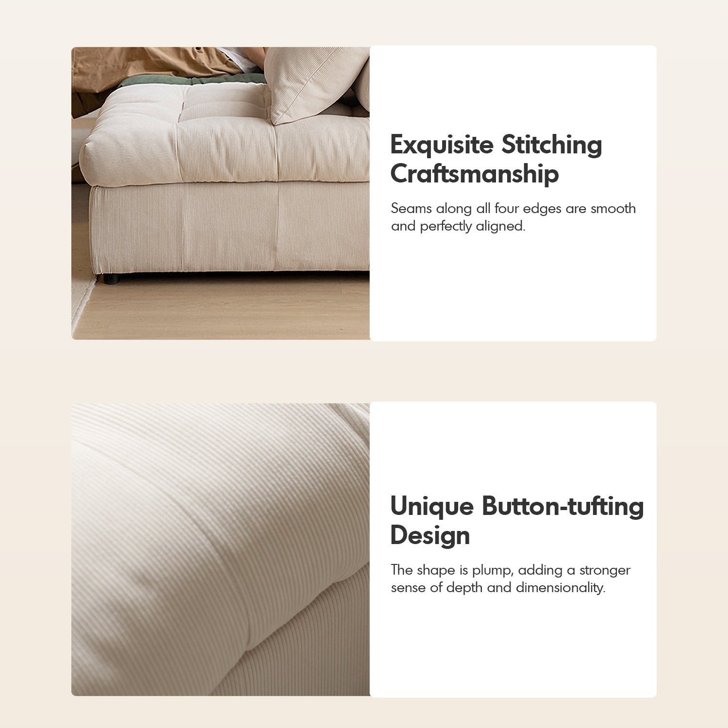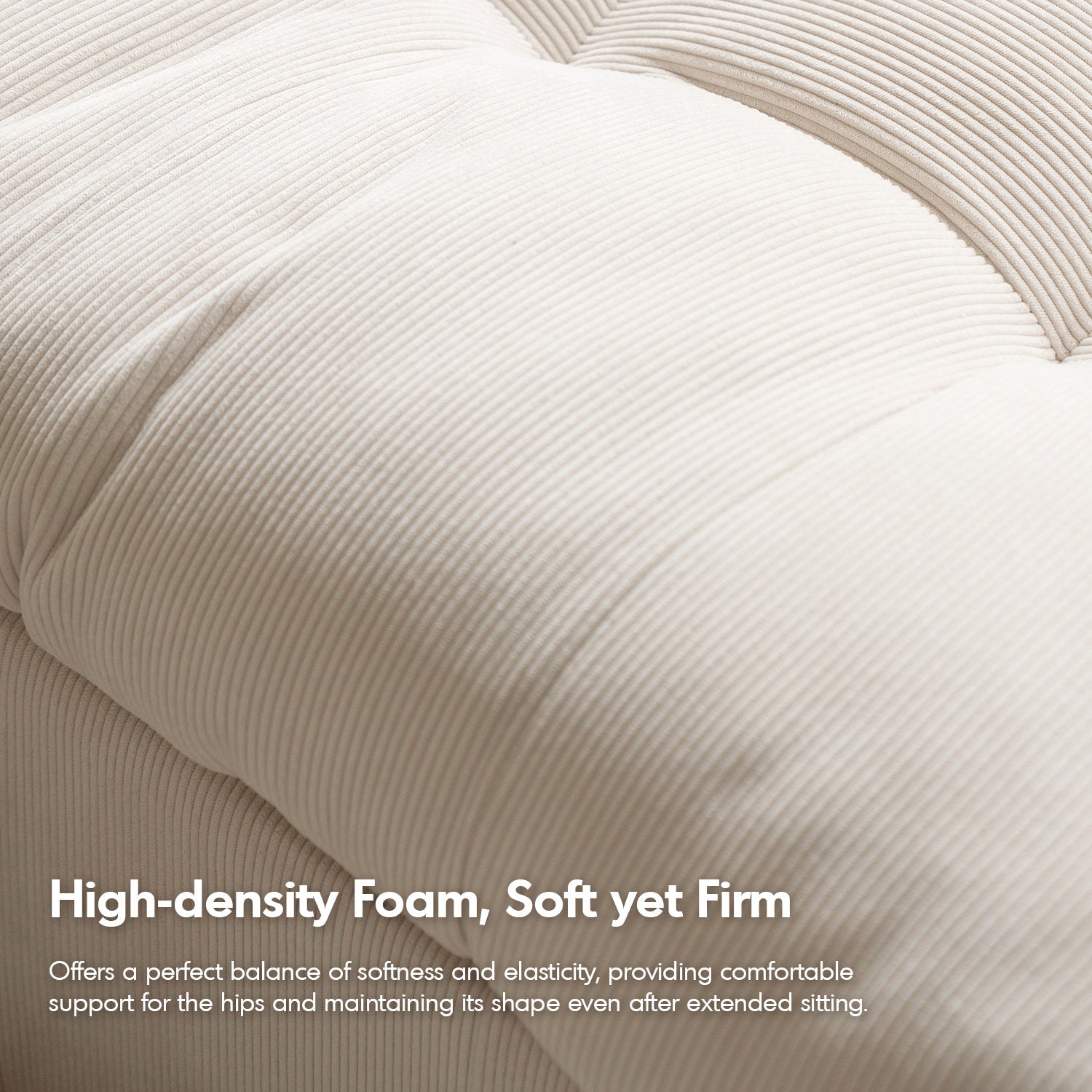Modern Corduroy Velvet Fabric Modular Armless 1 Seater Sofa FLEXA is designed for ultimate comfort and versatility. Perfect for solo relaxation or cozy gatherings, it offers adjustable seat depth, plush corduroy fabric, and a supportive back cushion filled with soft doll cotton. FLEXA can transform into a sleeping surface or floor mat, making it ideal for naps or entertaining guests. With elegant button-tufting and exquisite stitching, FLEXA is available in Pine Green and Creamy White, adding a warm, stylish touch to any room.