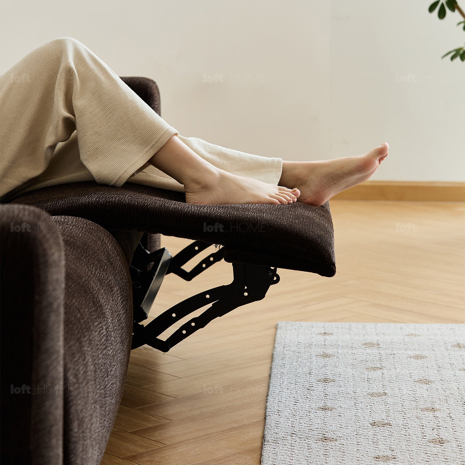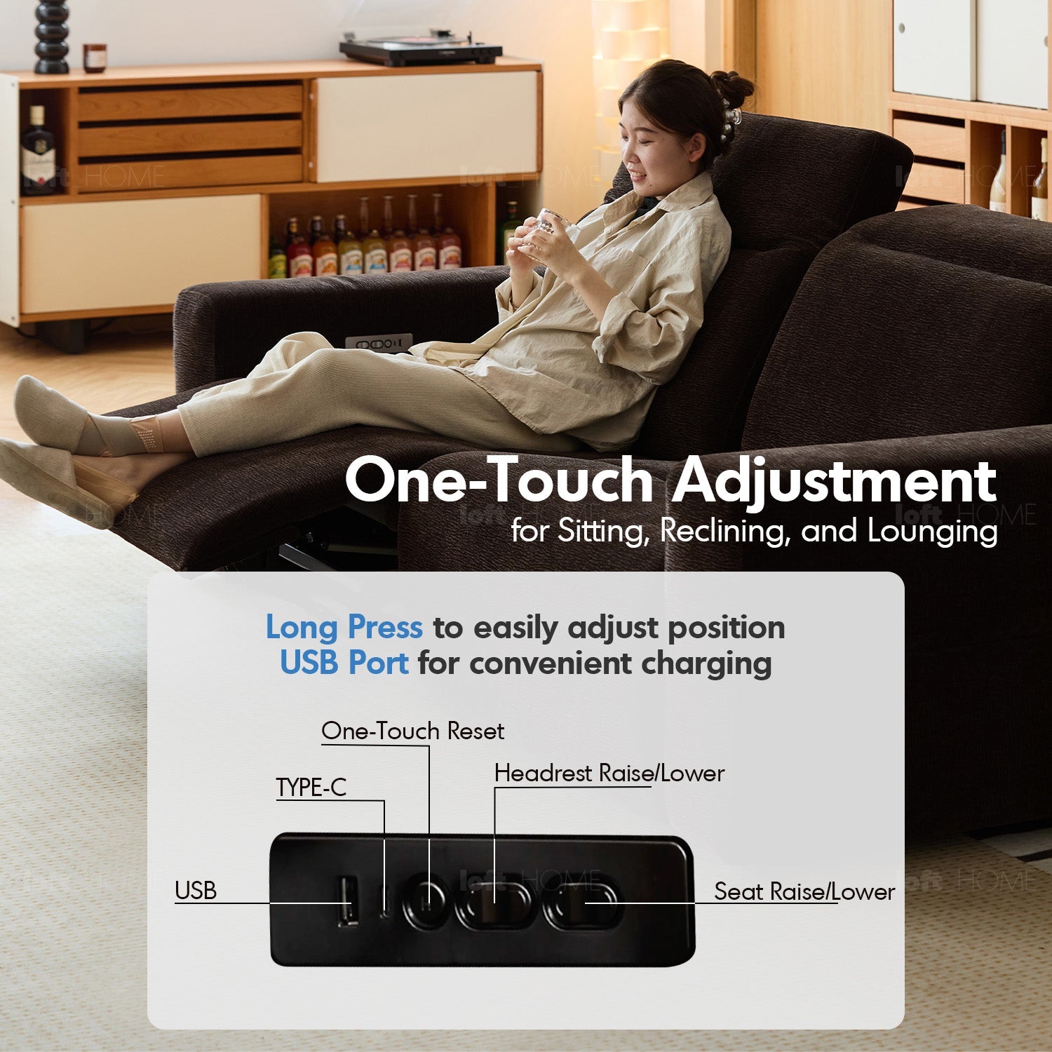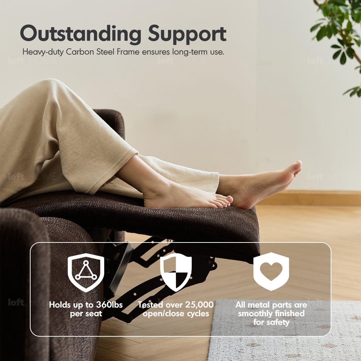Smooth reclining motion powered by a silent motor and a strong carbon steel frame.
