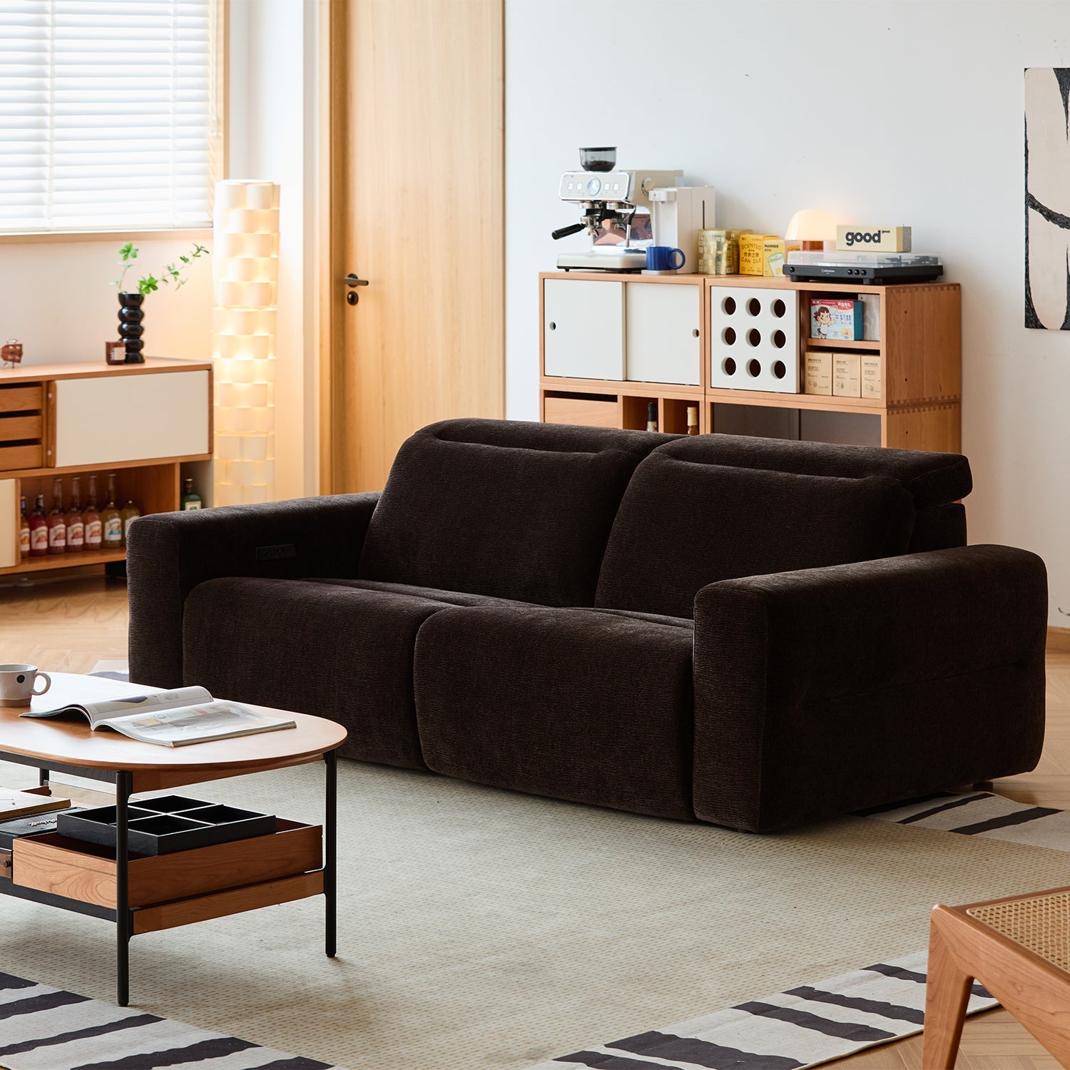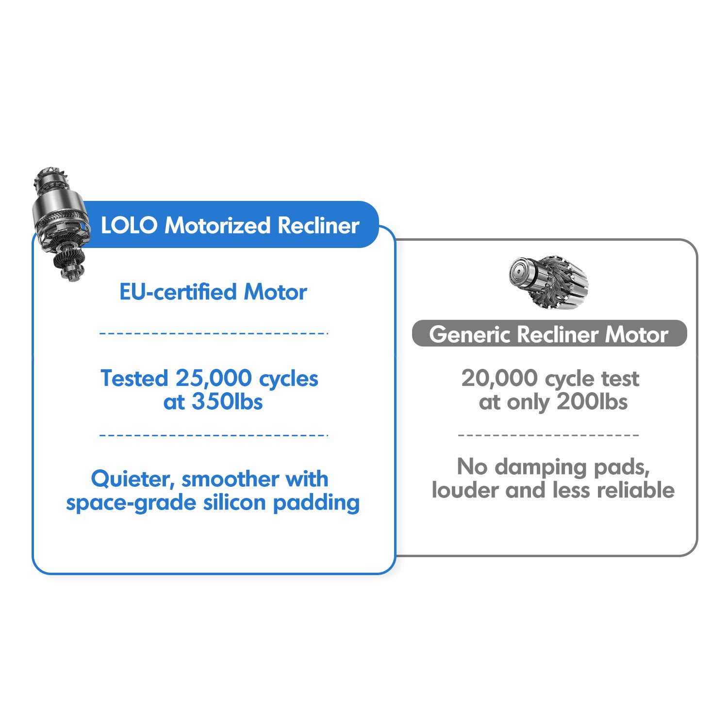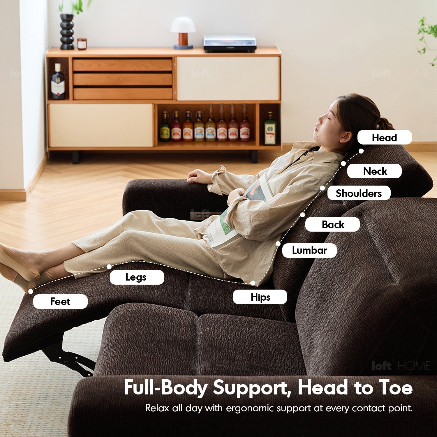 Smooth reclining motion powered by a silent motor and a strong carbon steel frame.