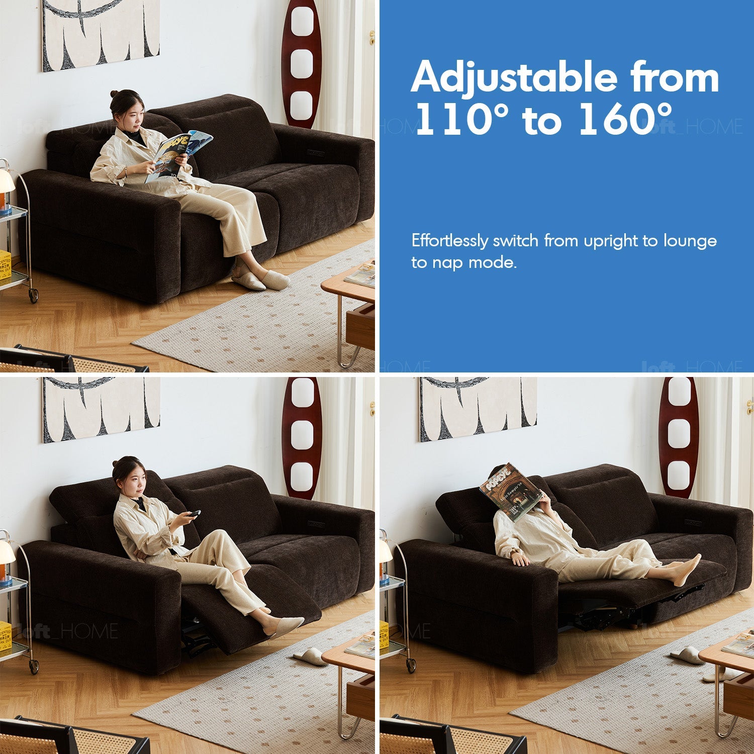 Effortlessly switch between upright, lounge, and nap modes for personalized comfort.