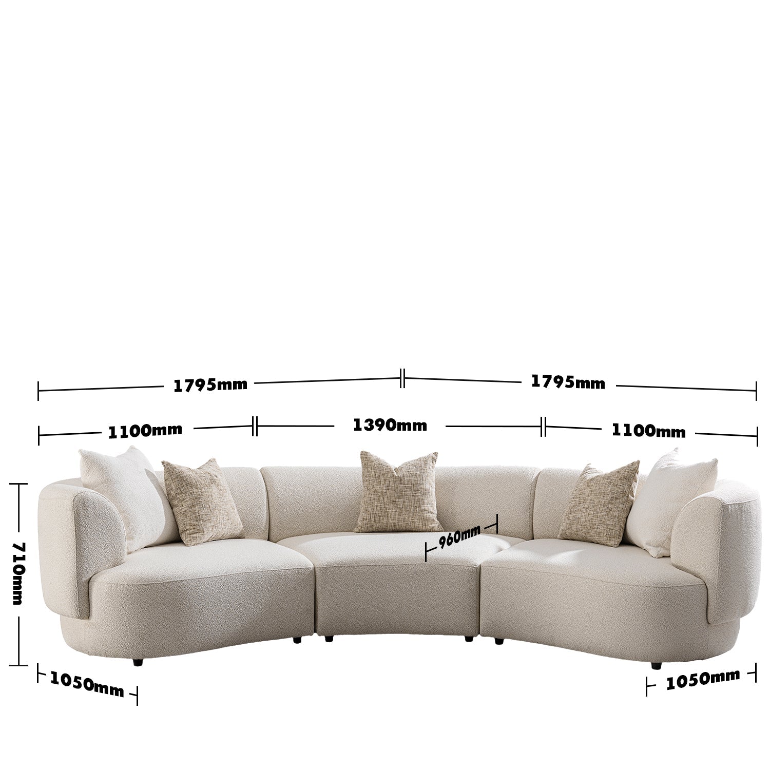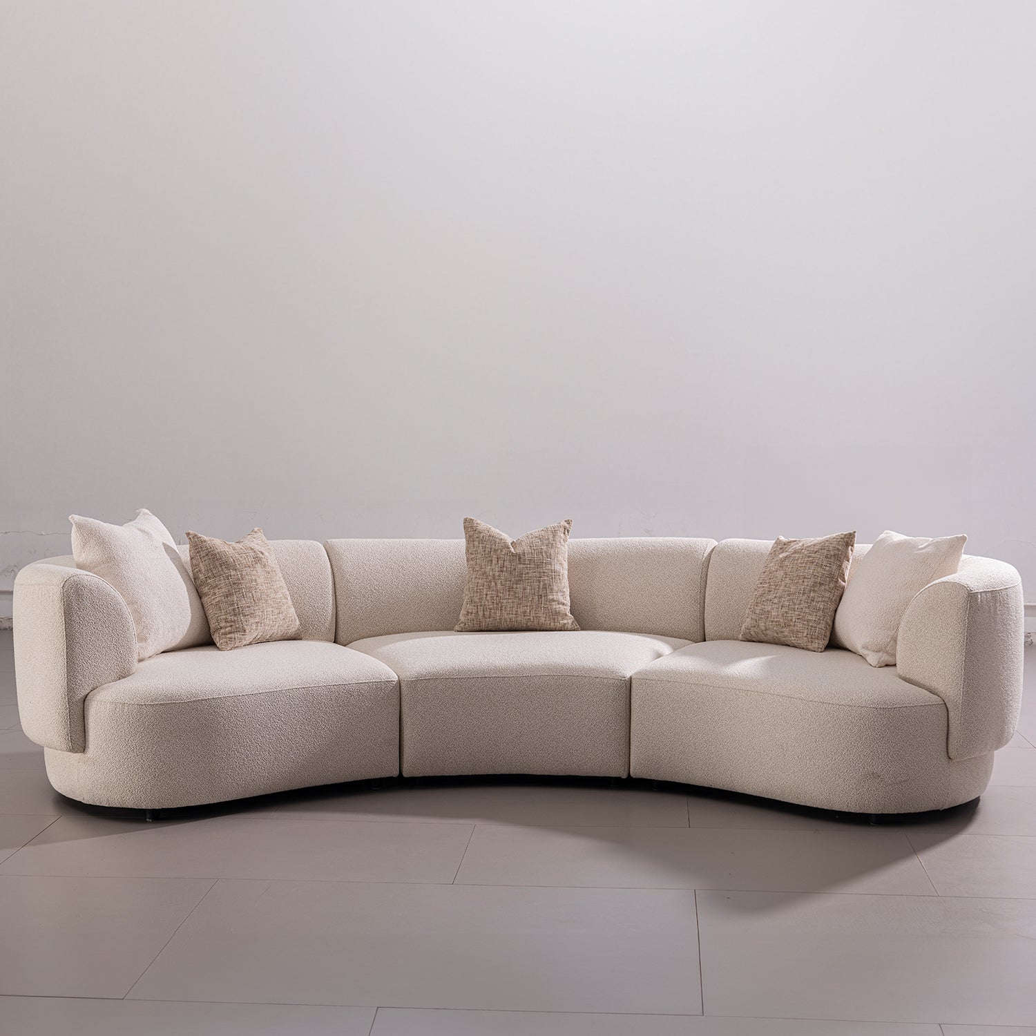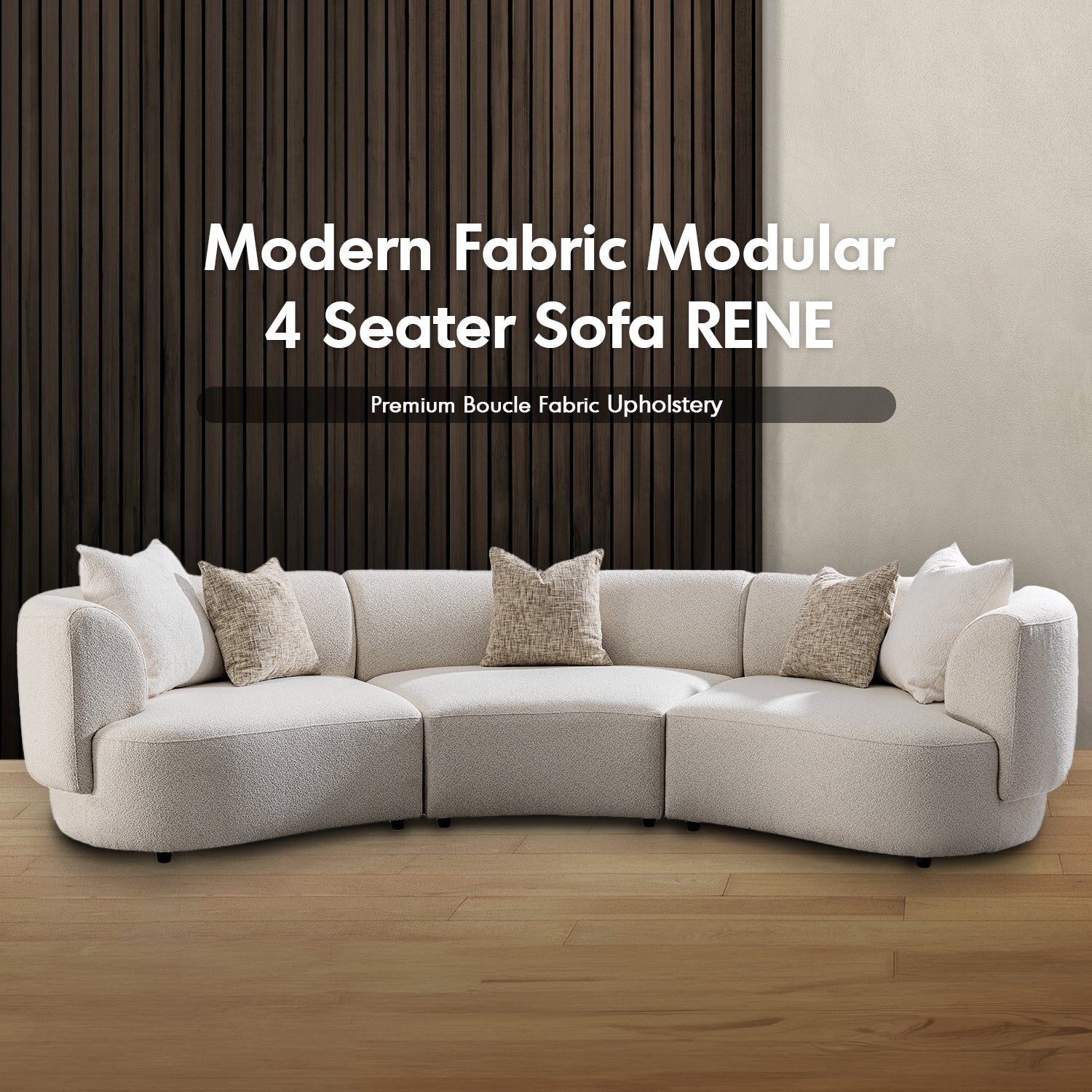 The Modern Boucle Fabric Modular 4 Seater Sofa RENE exudes a premium aesthetic, elevating your living space with its elegant curves and plush fabric. |