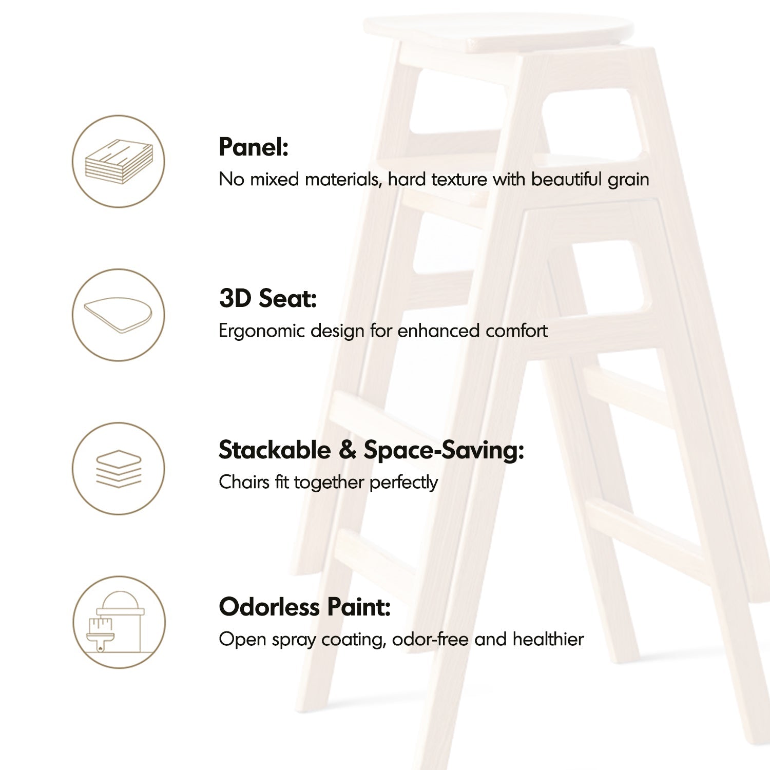 The Scandinavian Oak Wood Stackable Bar Stool STACKO combines style, comfort, and functionality. Made from premium North American FAS Grade Oak, its ergonomic 3D seat offers superior comfort, while its stackable design ensures space efficiency. The trapezoid structure and dual crossbars provide excellent stability, and the eco-friendly, odorless finish enhances its appeal. Ideal for kitchens, dining areas, or balconies, this bar stool is the perfect blend of durability and elegance.
