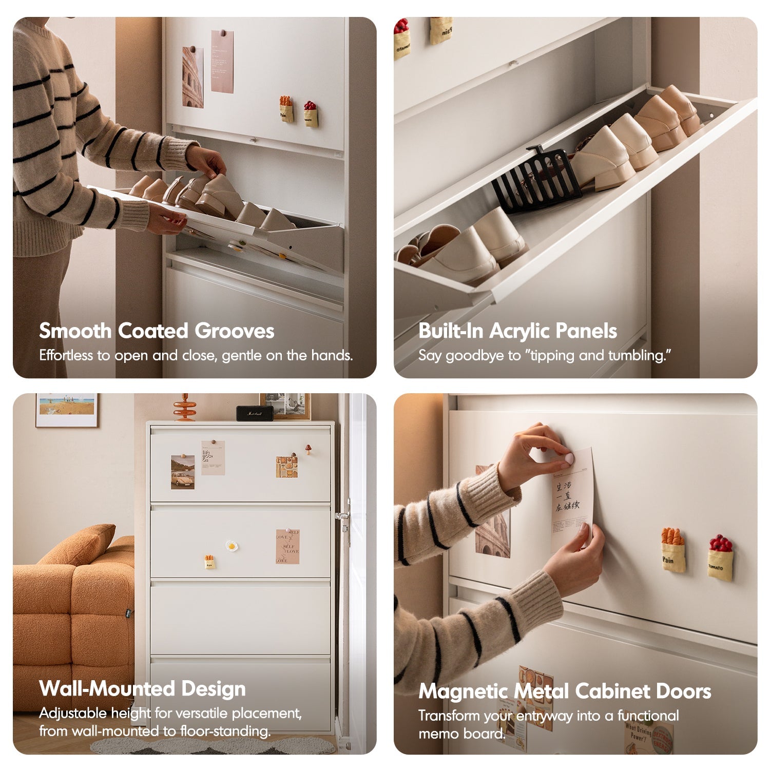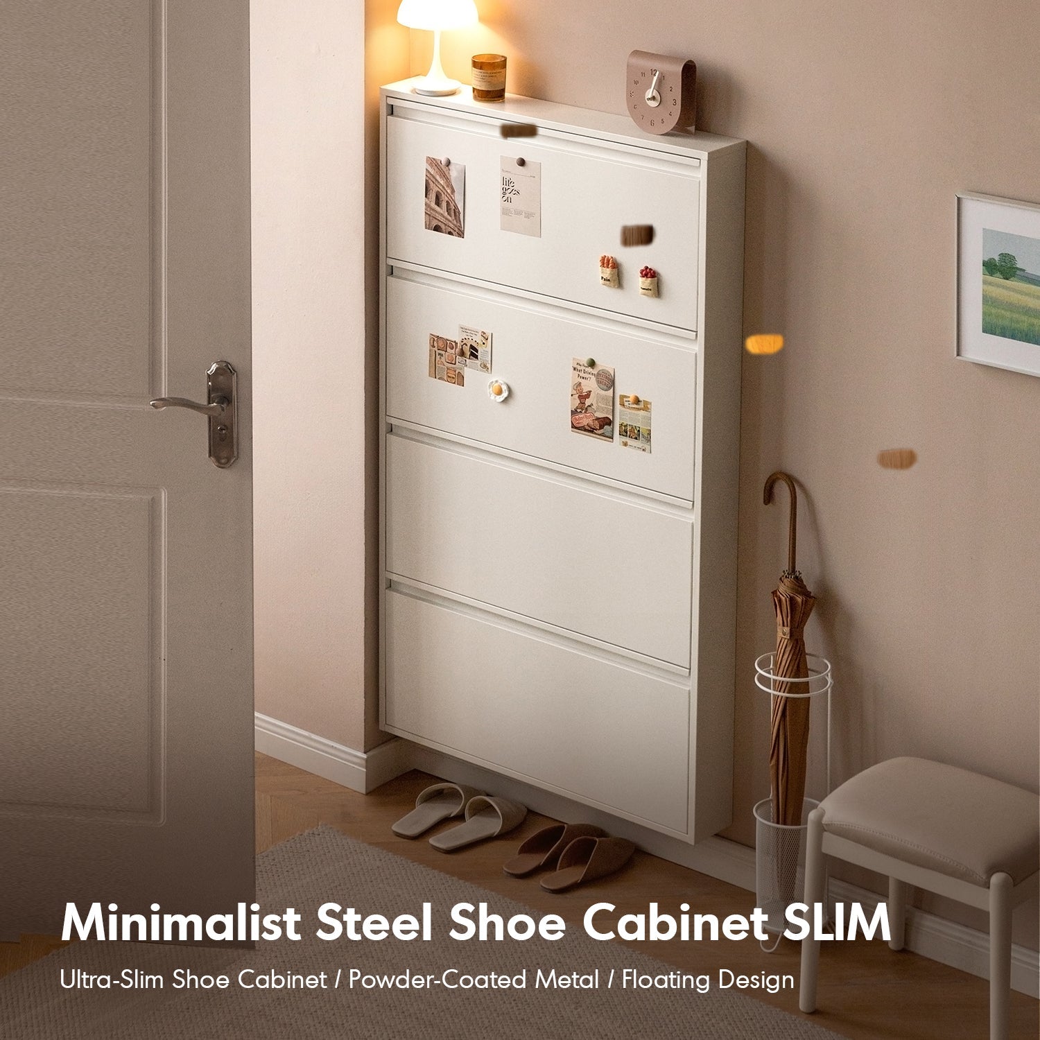 The Minimalist Steel Shoe Cabinet SLIM redefines entryway elegance with its ultra-slim, wall-mounted design. Crafted from durable powder-coated metal, it stores up to 12 pairs of shoes, resists rust and deformation, and doubles as a functional memo board.