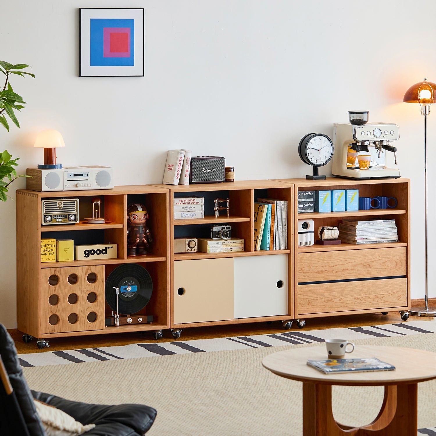 Modular cabinet design with drawers, sliding doors, and open compartments gives you freedom to organize and display items your way