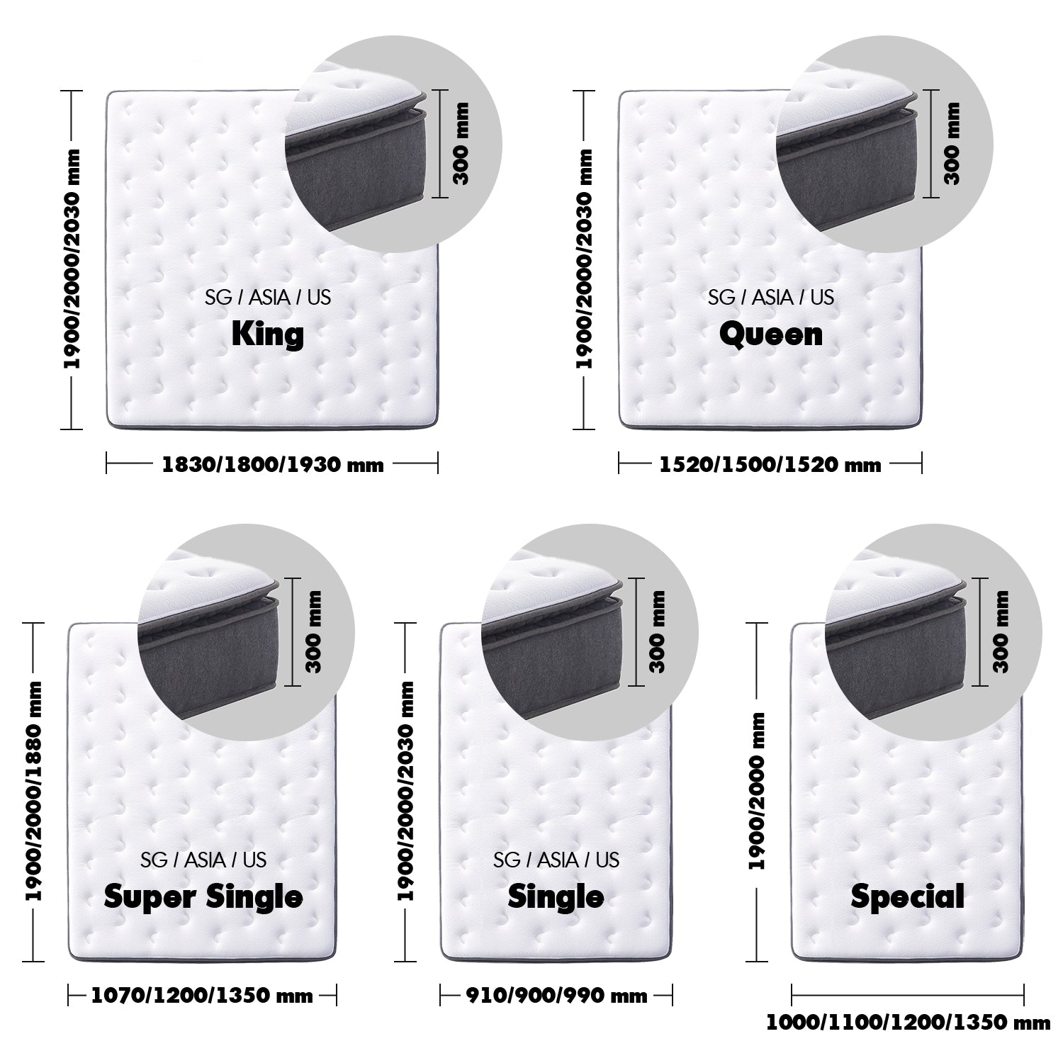 - SG Single: W910 x L1900 x H300mm