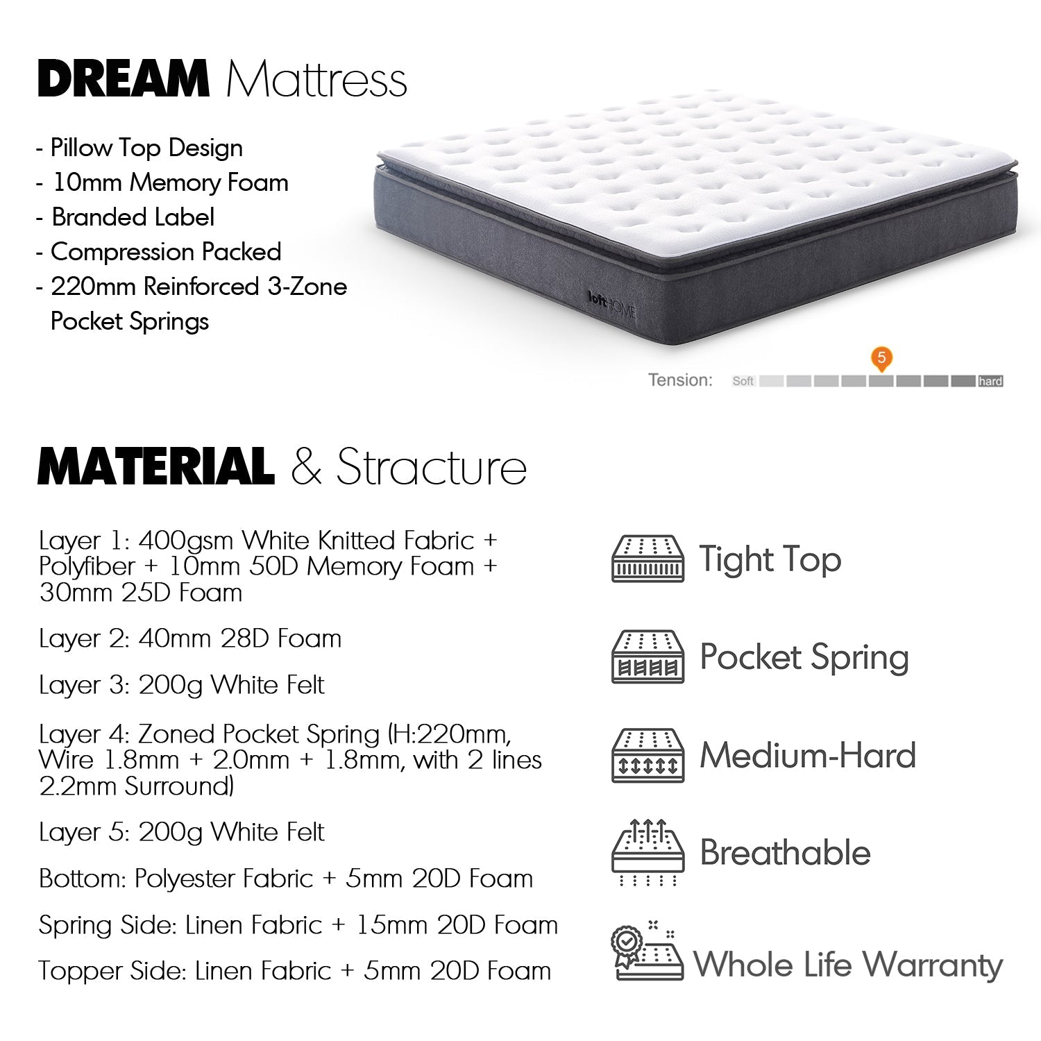 The 400gsm knitted fabric cover enhances airflow, keeping you cool and comfortable throughout the night.