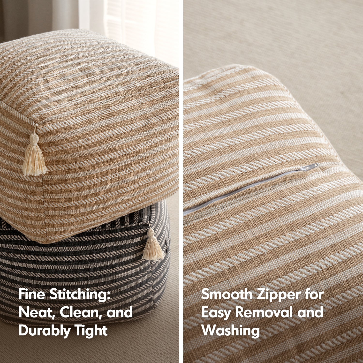 The Modern Mixed Weave Fabric Ottoman BEANIE offers exceptional comfort with its eco-friendly EPP particle filling that moulds to your body for resilient support. This versatile ottoman functions as a footrest, shoe bench, or kids' seat. With elegant tassel accents, a removable, washable cover, and durable craftsmanship, it's a stylish and practical addition to any space, providing comfort, flexibility, and timeless design.