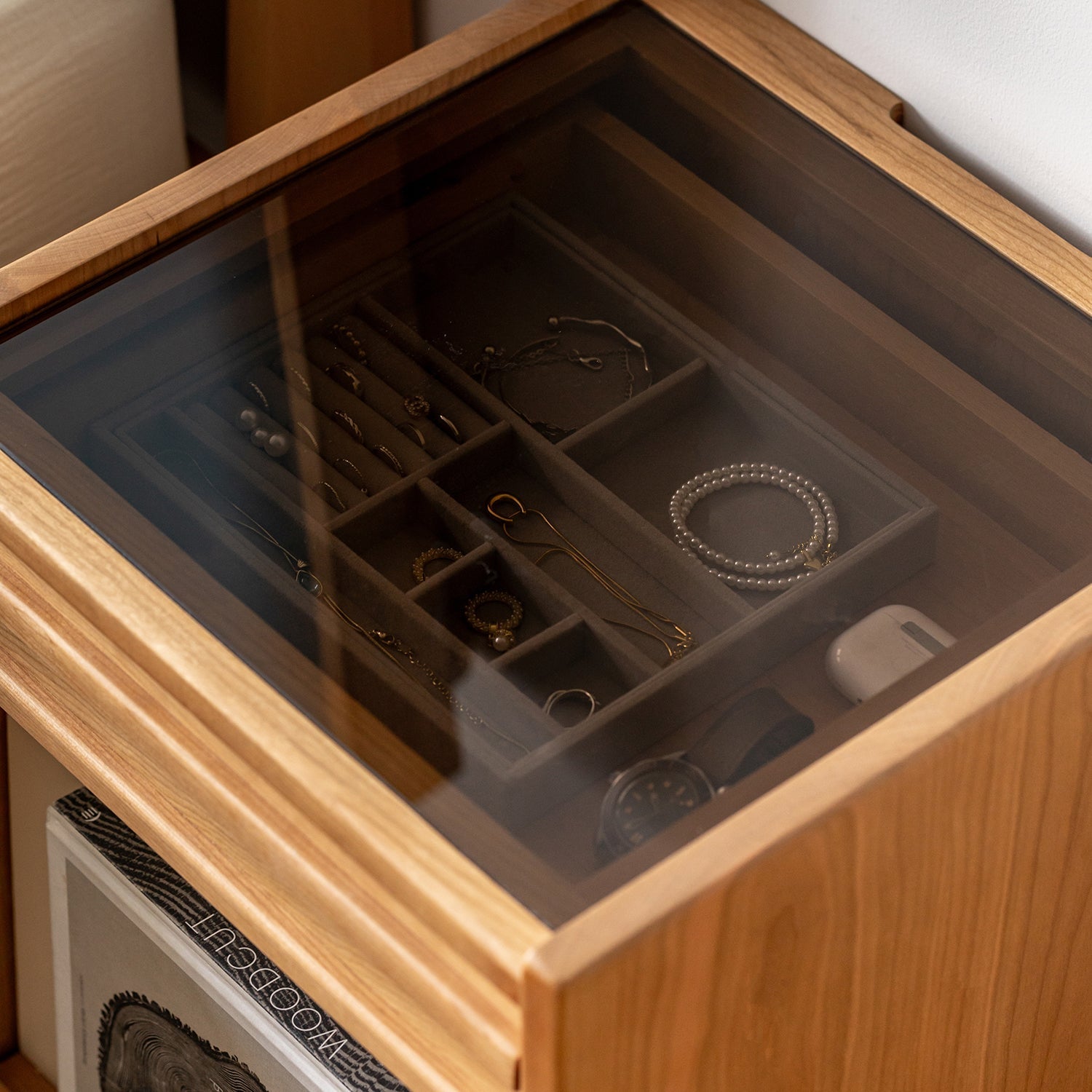 A thoughtfully designed drawer, a visible glass top compartment, and a bottom flip-door section keep everything neatly organized and easy to access.