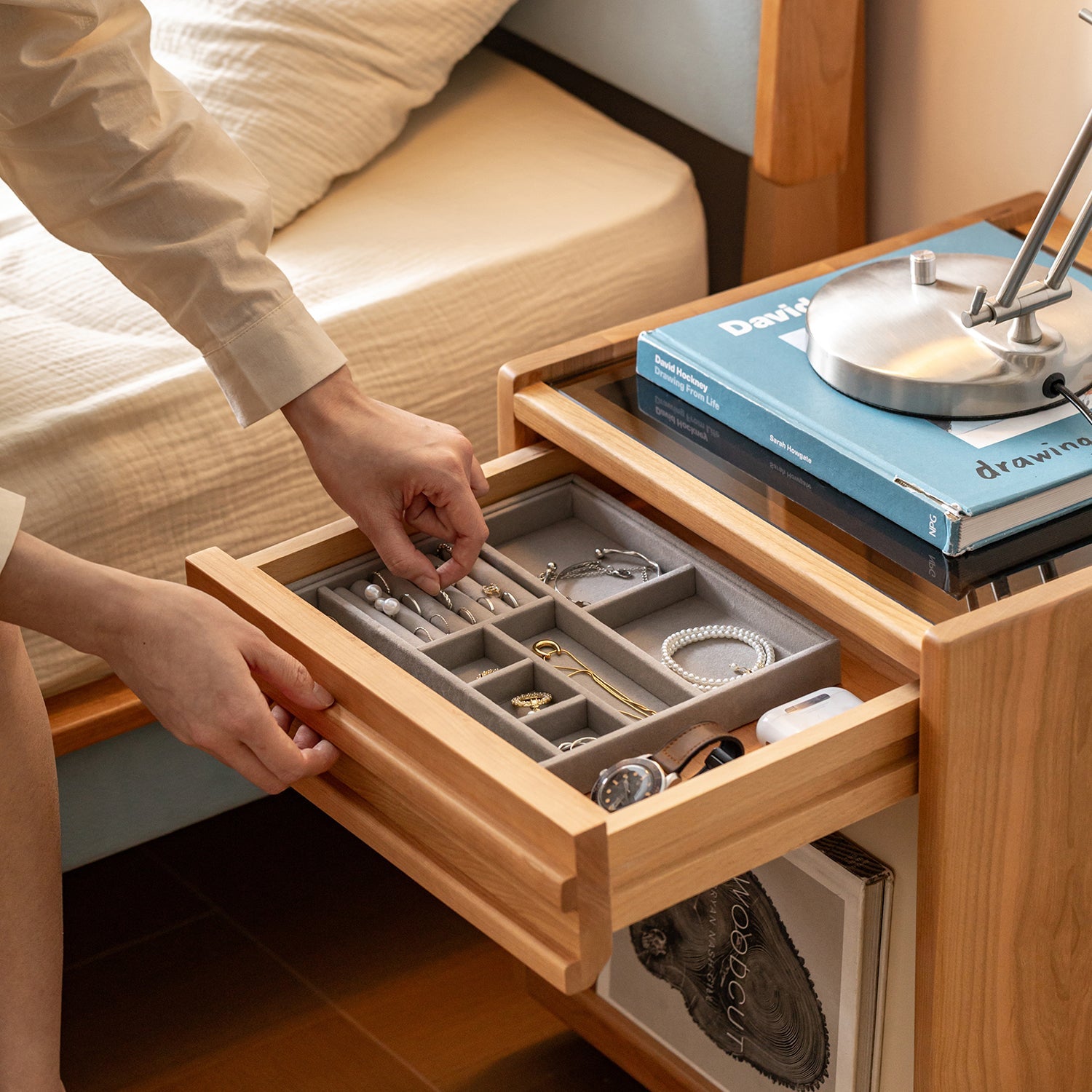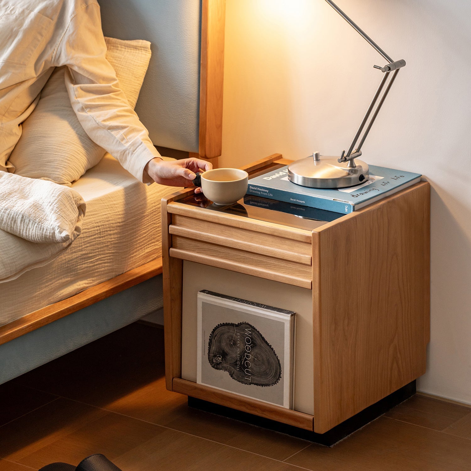Scandinavian Cherry Wood Side Table TIMELESS brings compact charm and smart storage to any bedroom with premium cherry wood and a stylish mid-century look.