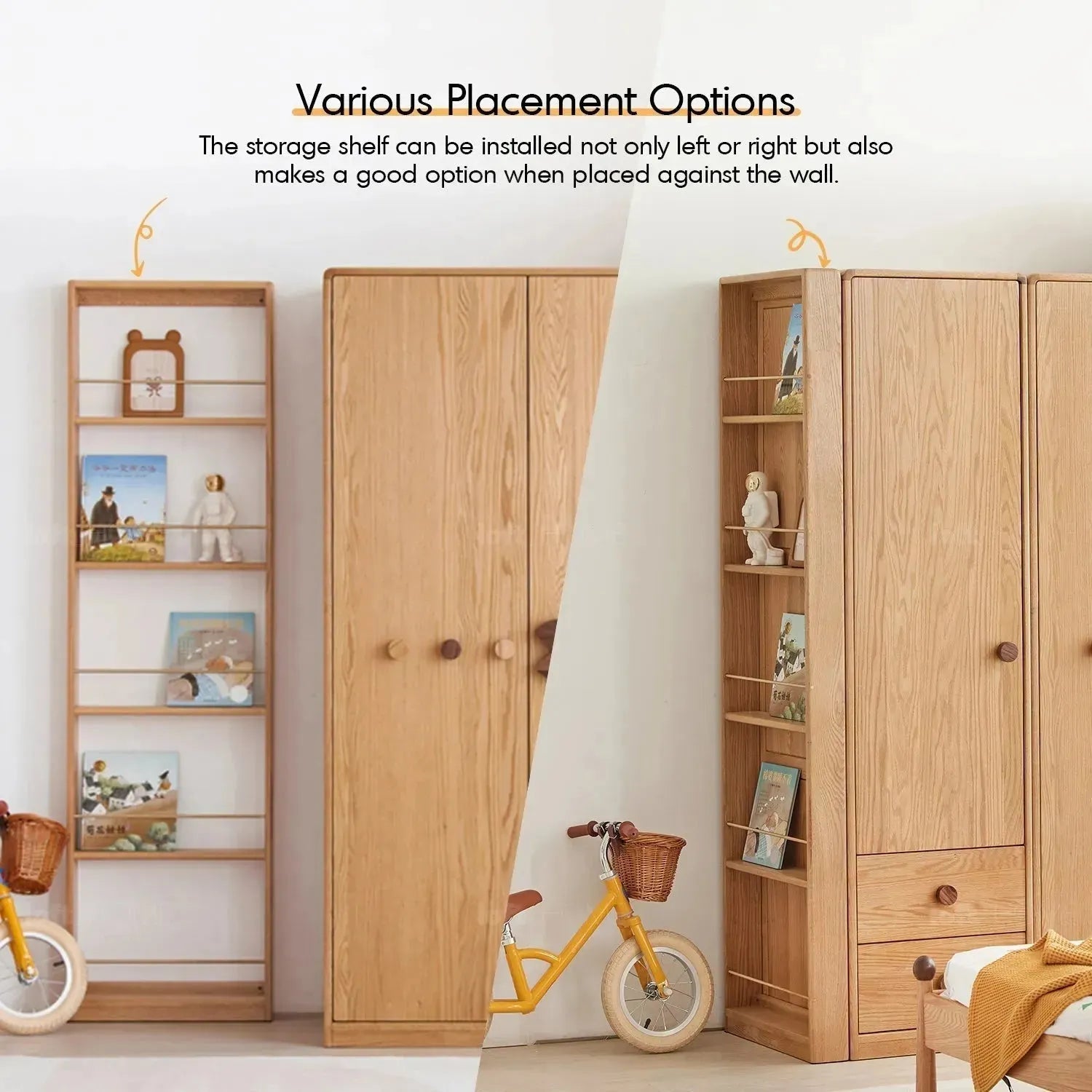 The wardrobe, made of European-imported Solid Beech Wood and North American Black Walnut Wood, with quirky Pac-Man handles and legs. It provides a space for kids to be themselves, learn how to structure their stuff and create moments of happiness in an environment all their own. With a maximum bearing capacity of 300kg, it ensures durability and effectiveness.