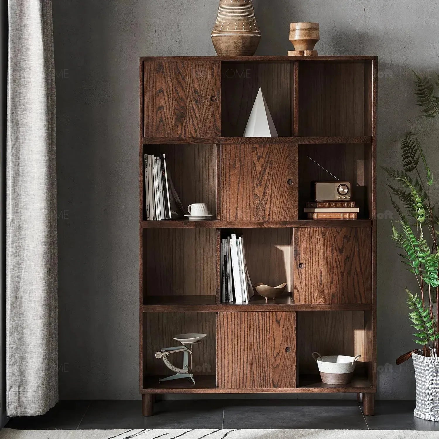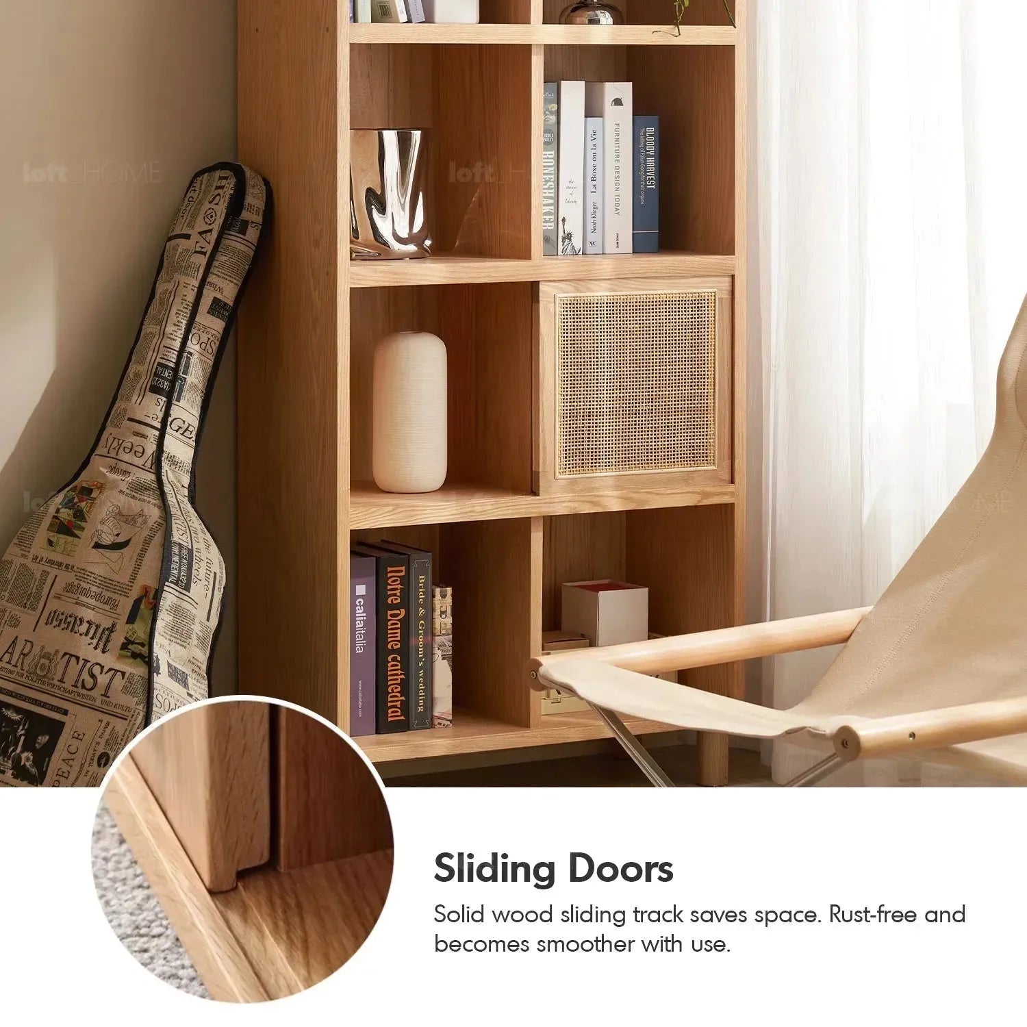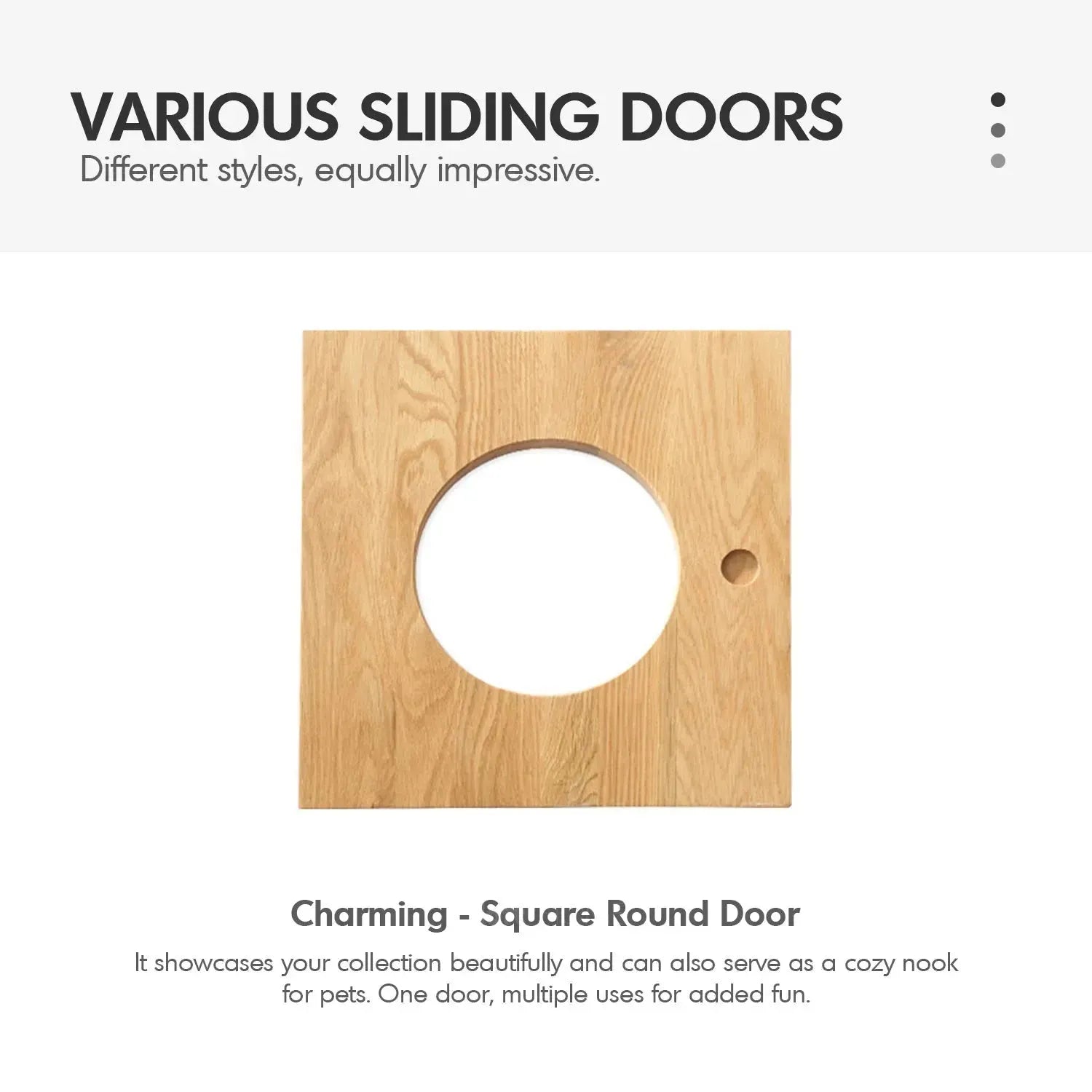 Scandinavian Wood Shelf Bookshelf Optional Door GERIN features versatile sliding doors in classic flat, dynamic louver, and charming hollow designs. Crafted from premium North American FAS grade oak, it offers a smooth, space-saving sliding track and multiple uses for added fun.