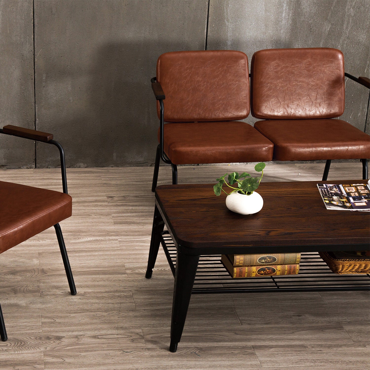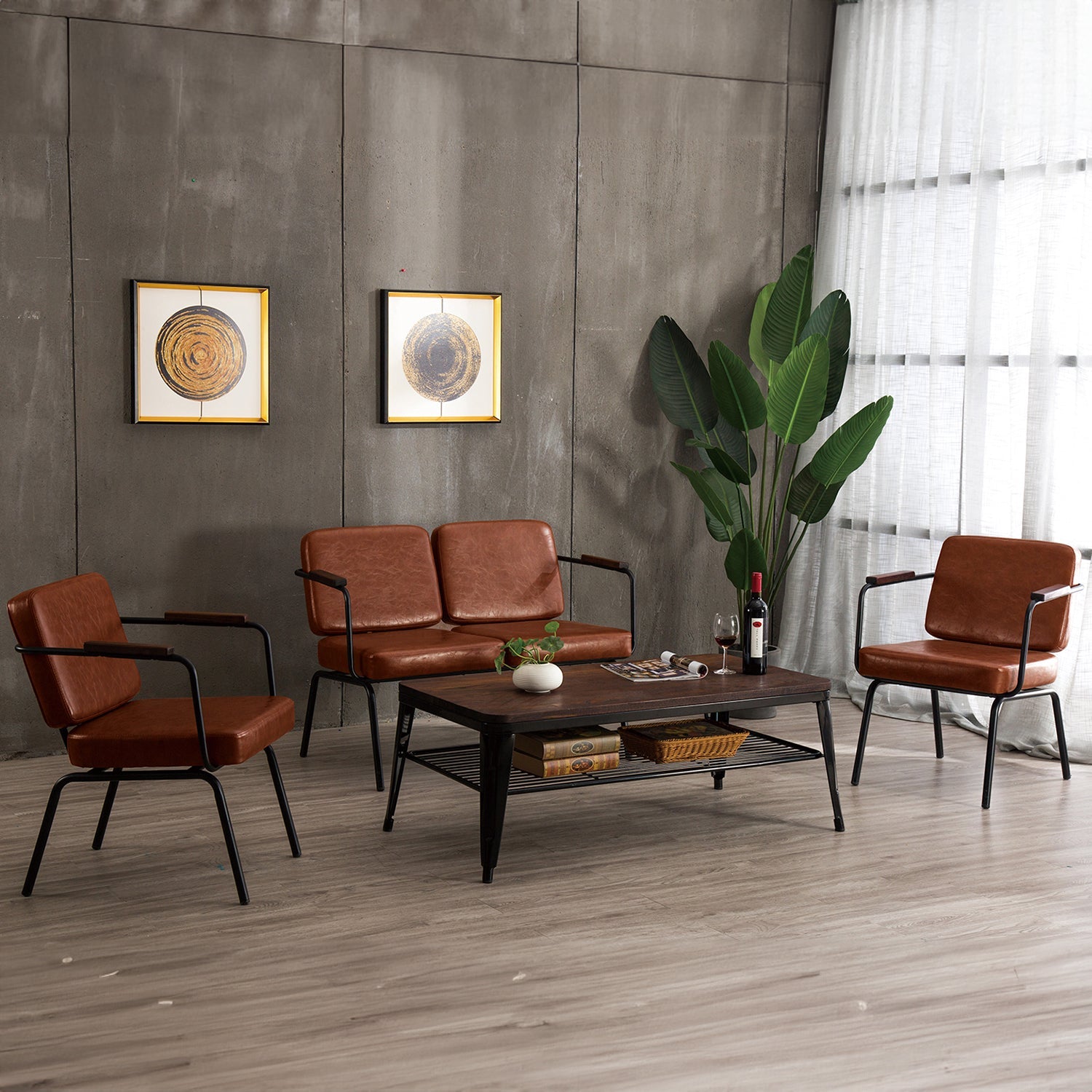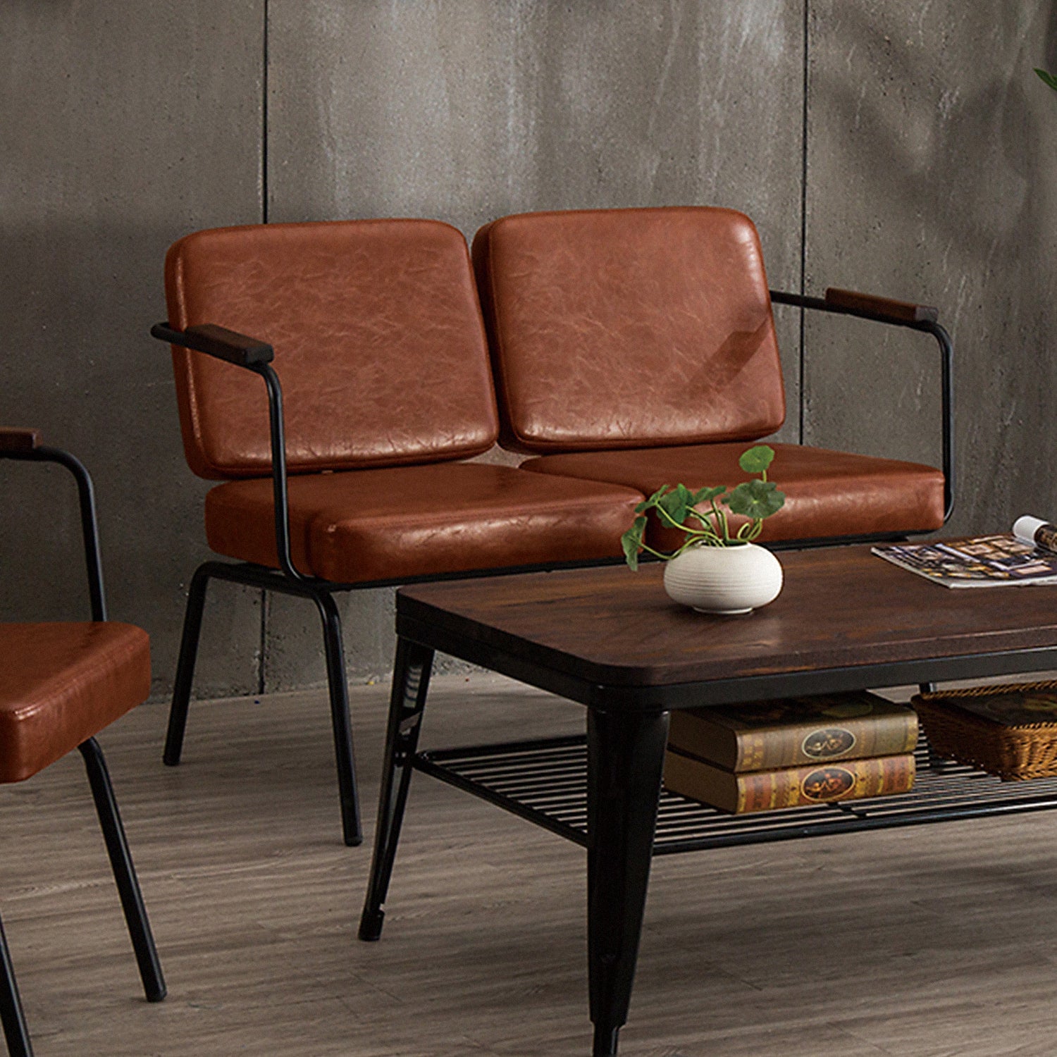 With its light brown leather cushion and sleek black steel frame, this chair blends industrial chic with warmth.