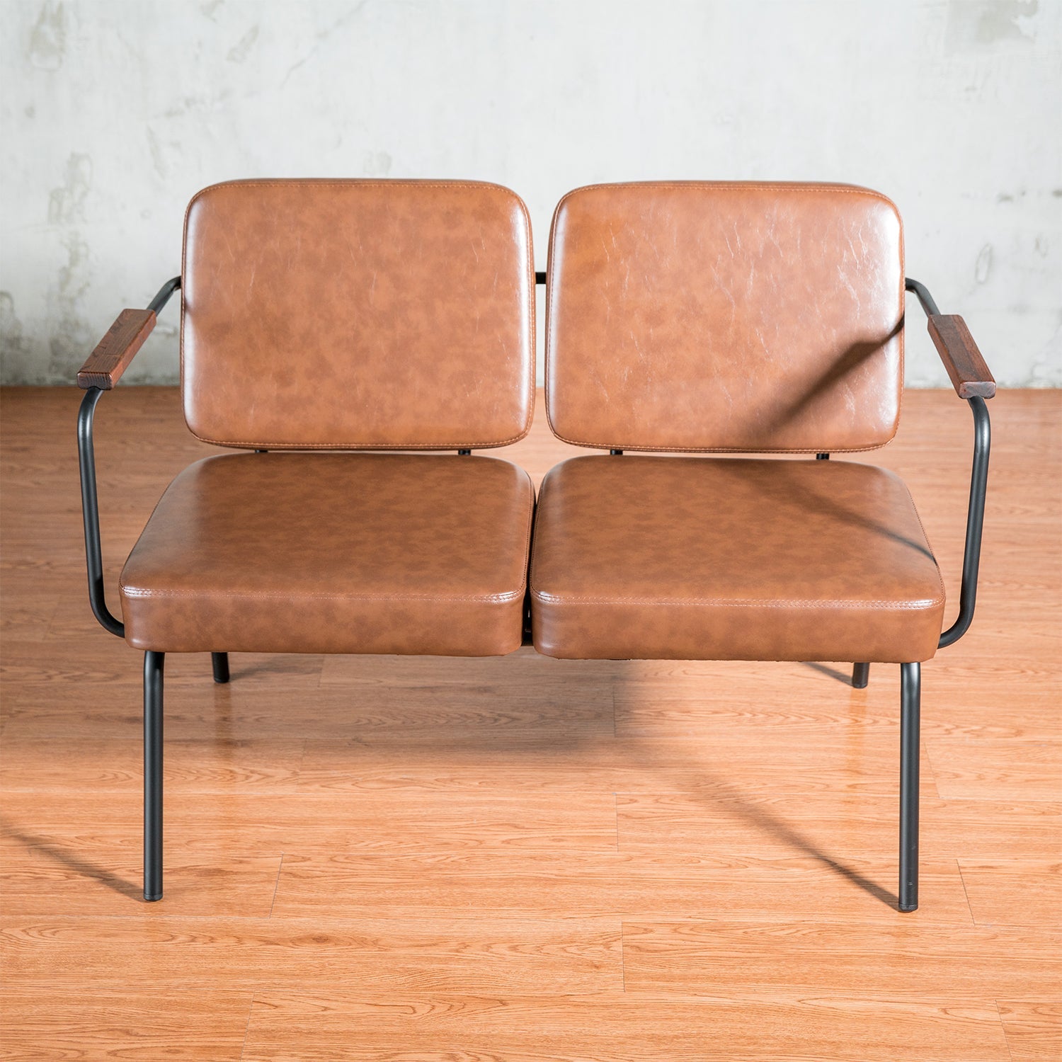 The Industrial PU Leather Dining Bench DOUBLE PULLMAN seamlessly integrates industrial aesthetics with enduring comfort. Constructed with a black powder-coated steel frame, it provides robust support for light brown PU leather cushions that are filled with high-density foam. The leather is designed to develop a distinctive patina over time, enhancing the appeal of any contemporary dining area.