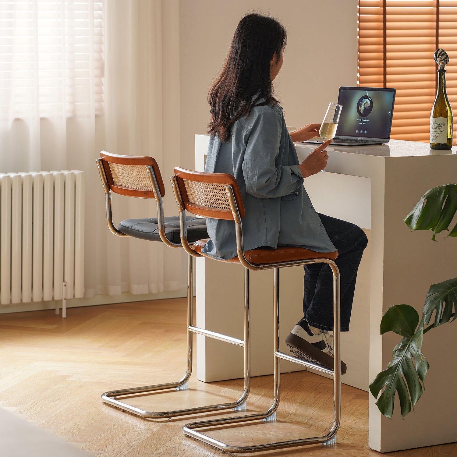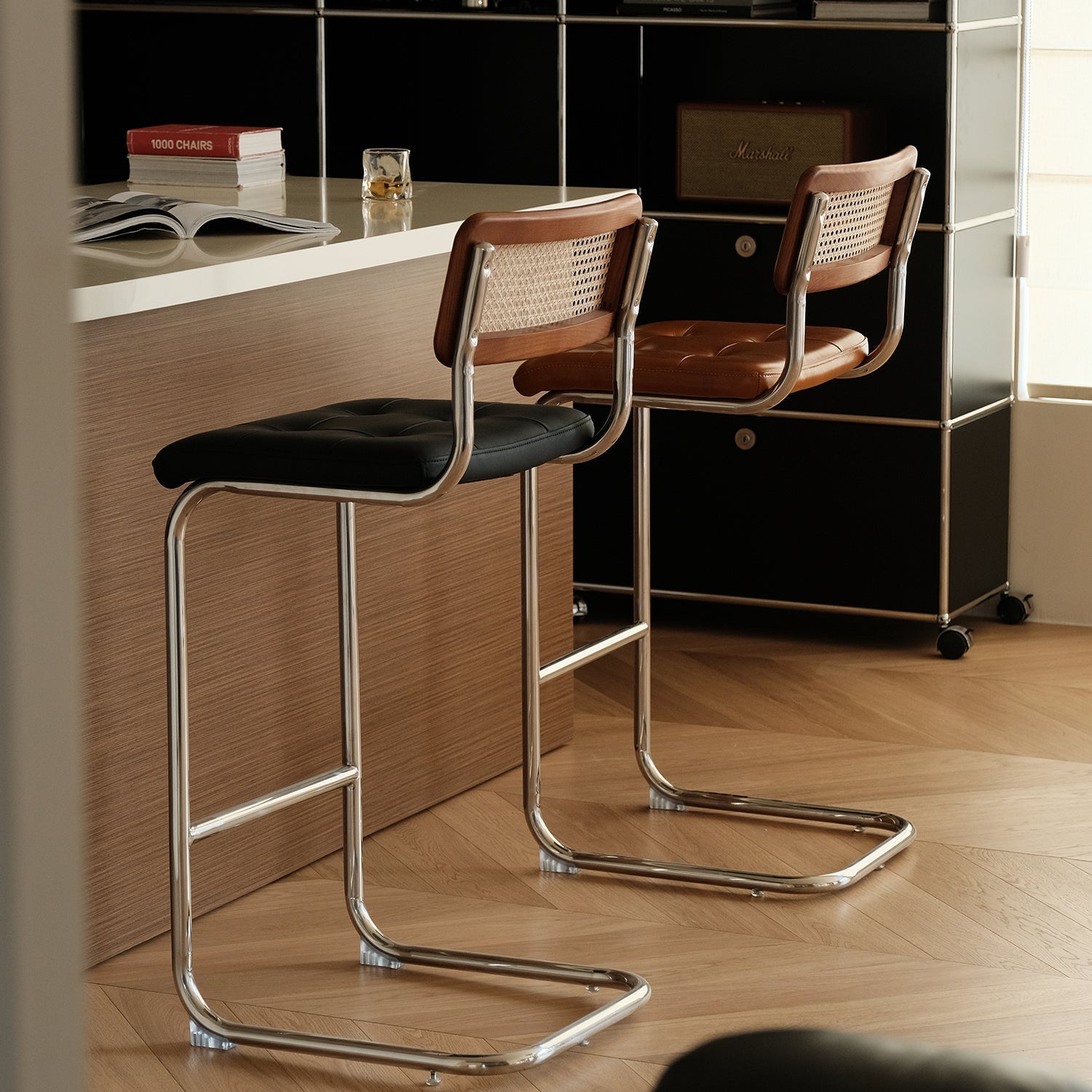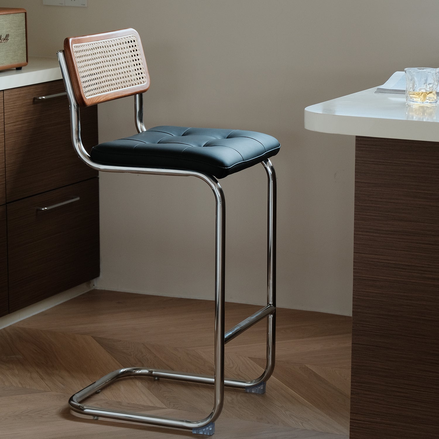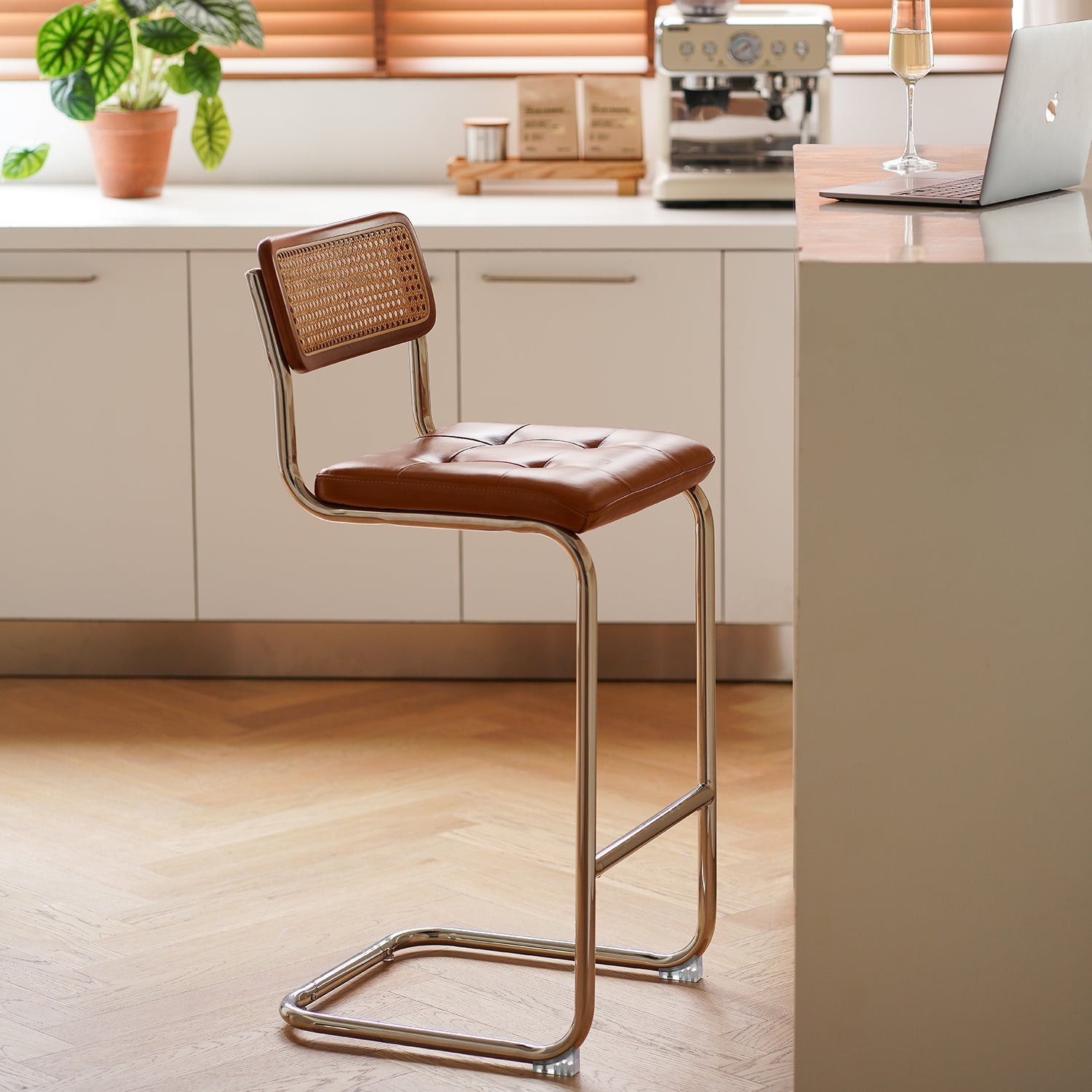 Vintage Rattan PU Leather Bar Chair HOH XIL brings a fresh vintage style with soft PU leather breathable rattan and a stable steel base perfect for bars and home dining
