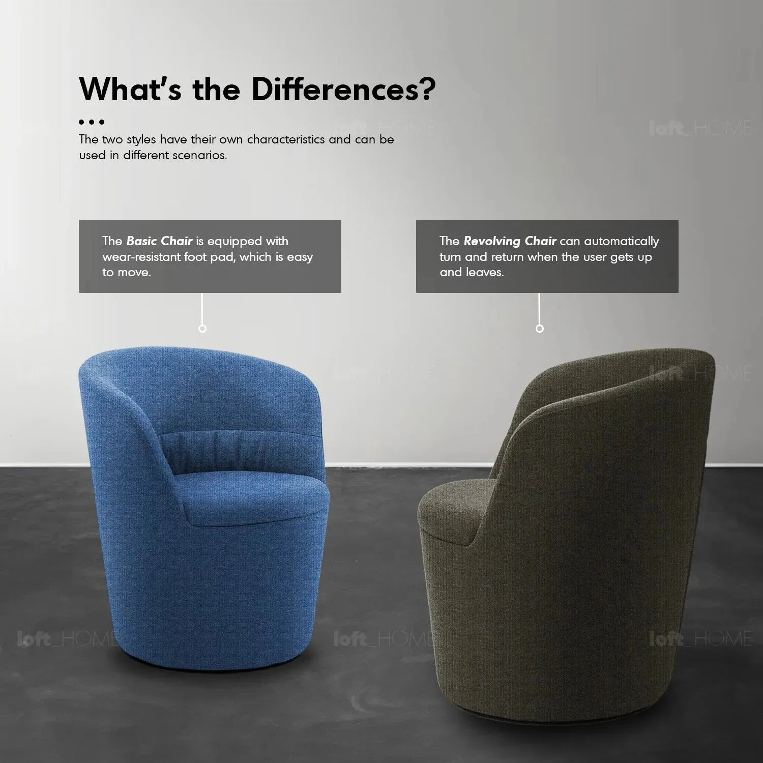 Choose from the basic chair with wear-resistant footpads for easy manoeuvrability or the automatic return chair, which features a custom steel frame mechanism that allows it to swivel back into position automatically—a feature that enhances both convenience and safety. |