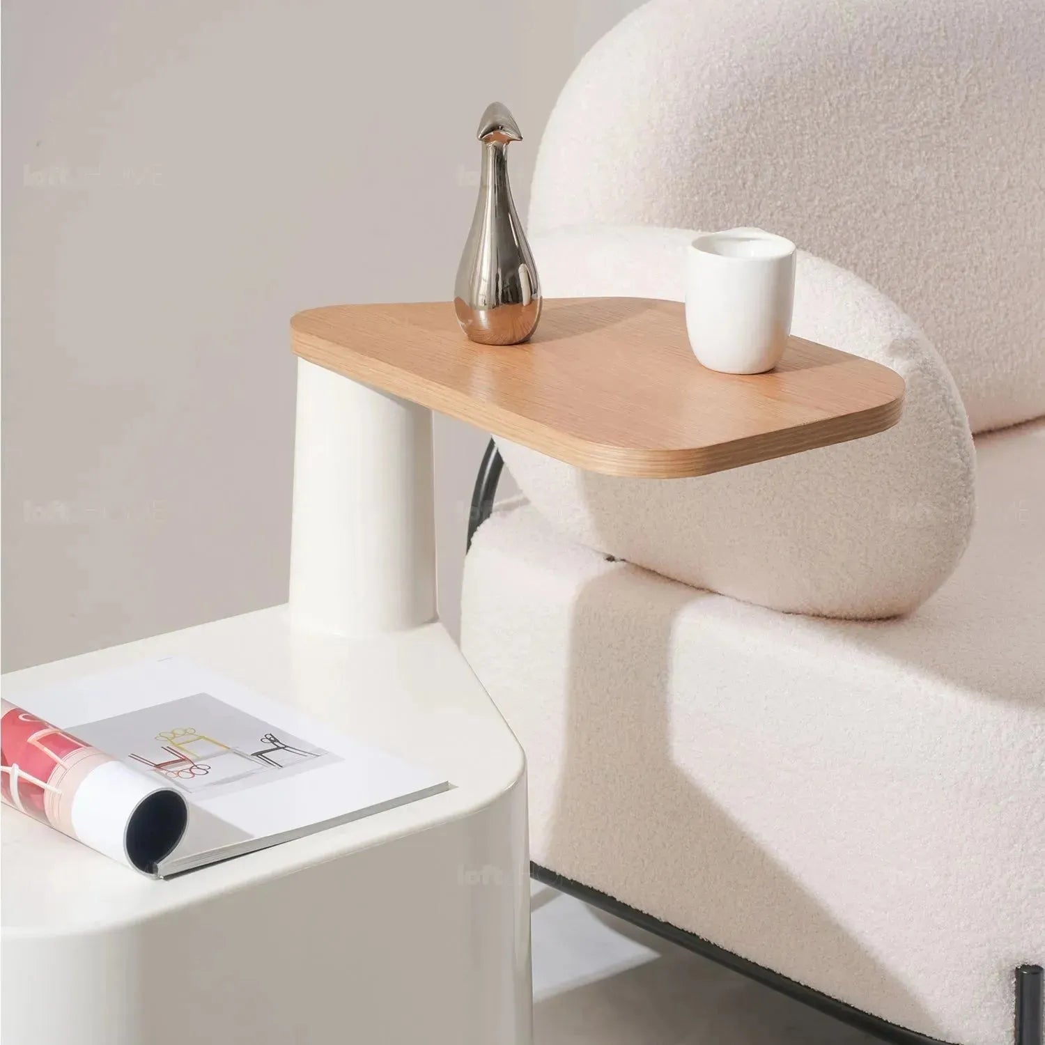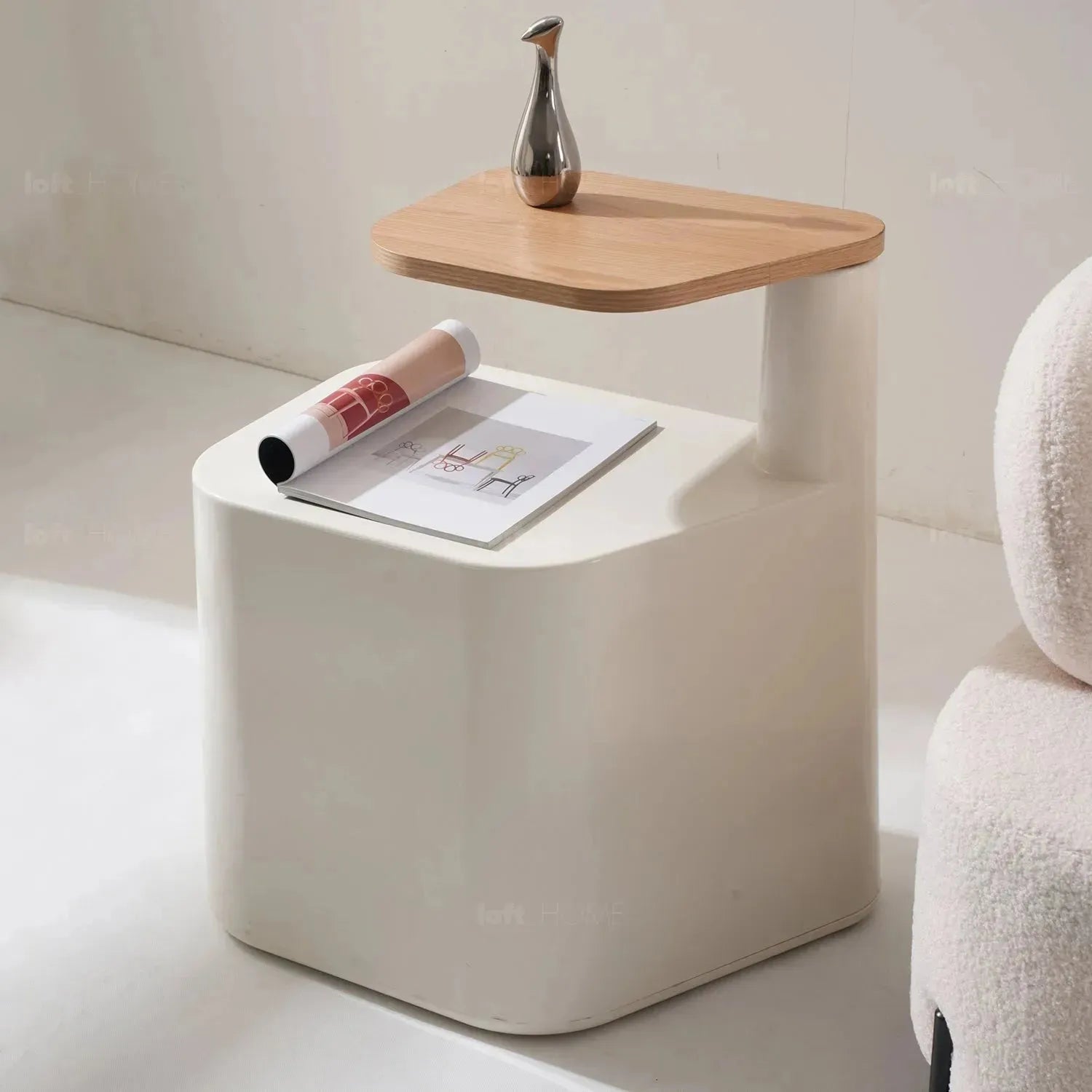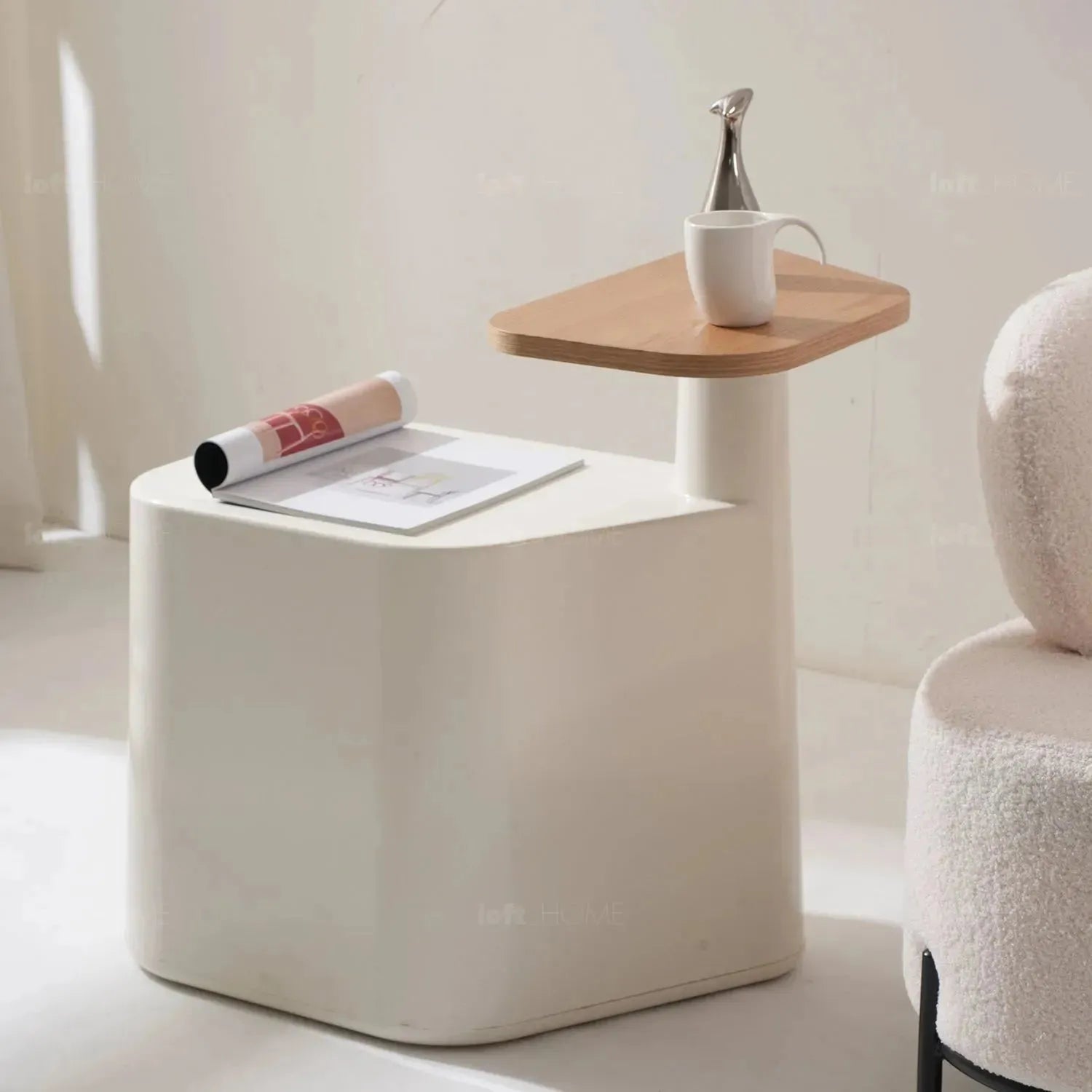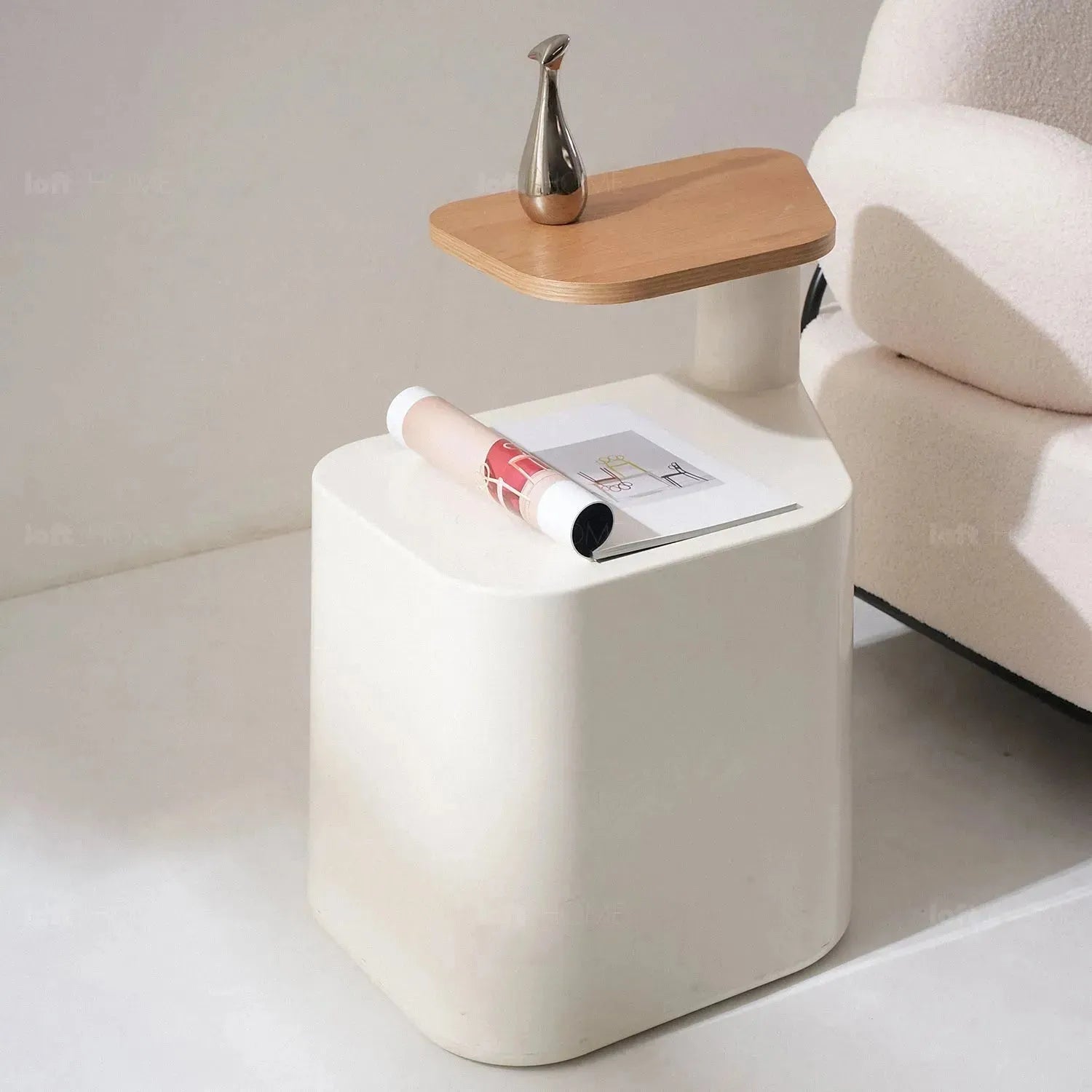 Our Cream Wood Side Table TIRAMISU combines modern design and practicality. With its rotating tabletop and crisp white base, it effortlessly adds a contemporary touch to your decor. It's the perfect blend of style and functionality.