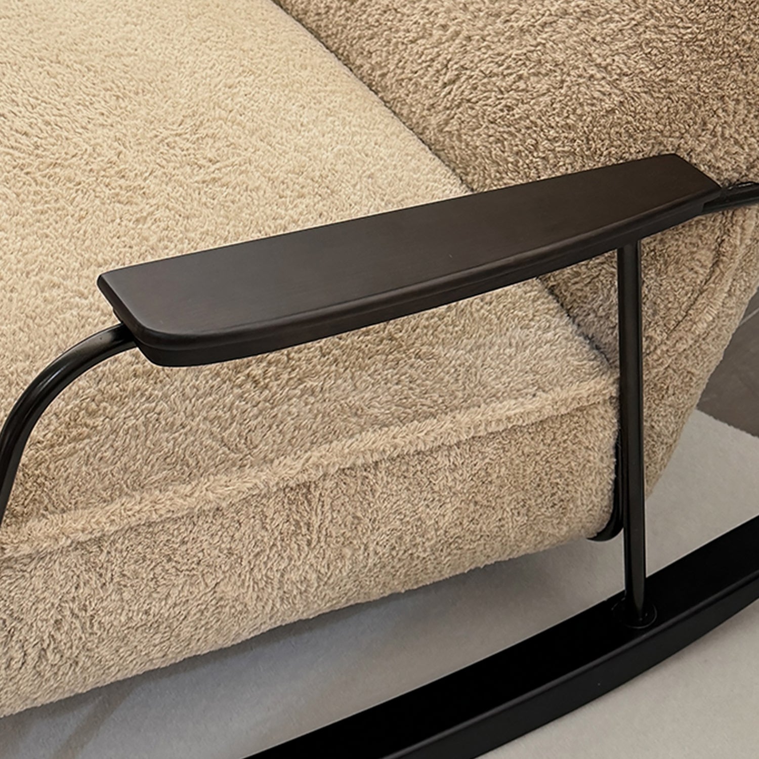 Experience ultimate relaxation with the Cream Sherpa Fabric Rocking Chair CLOUDY. Upholstered in premium Sherpa fabric and supported by European-imported beech wood legs, this chair merges style with durability. High-density foam cushioning ensures comfort, while the gentle rocking motion invites you to unwind effortlessly. With a sophisticated brown fini"CLOUDY" seamlessly integrates into any modern space, offering an ergonomic and luxurious seating experience built to last.