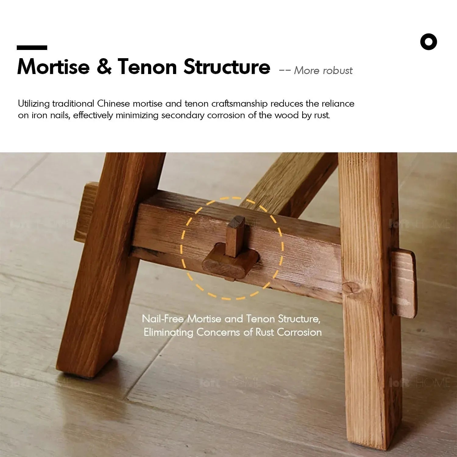 Bench legs are made through mortise–and-tenon joinery, which provides the strength of load bearing and stability.