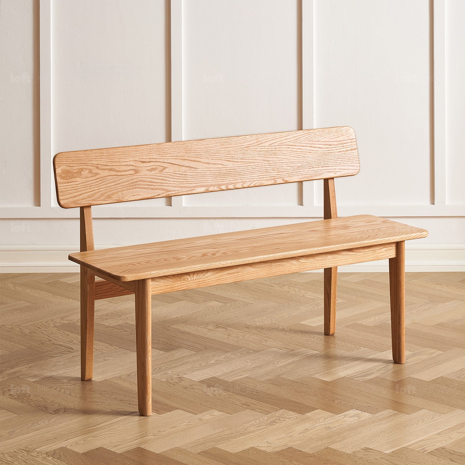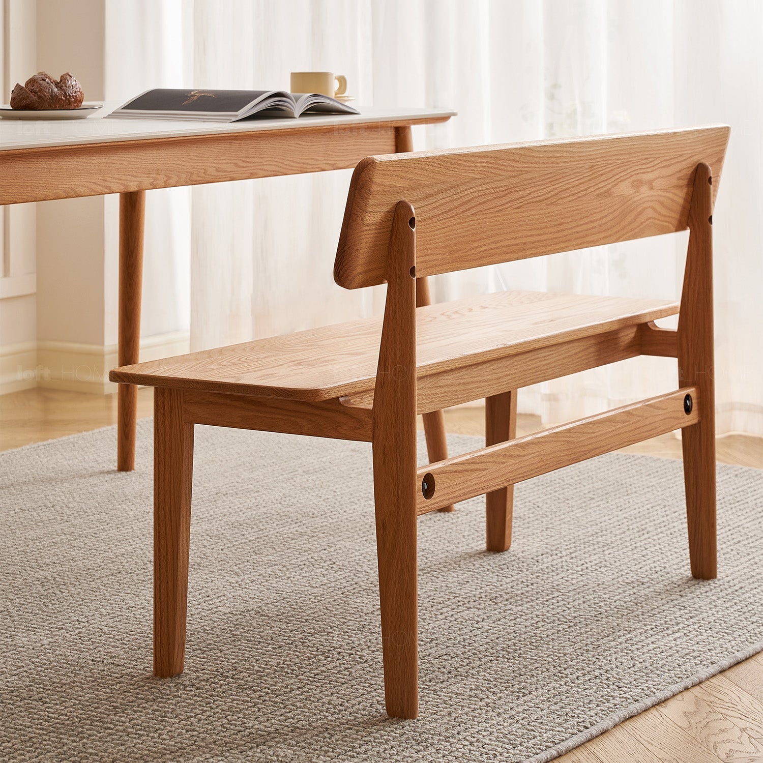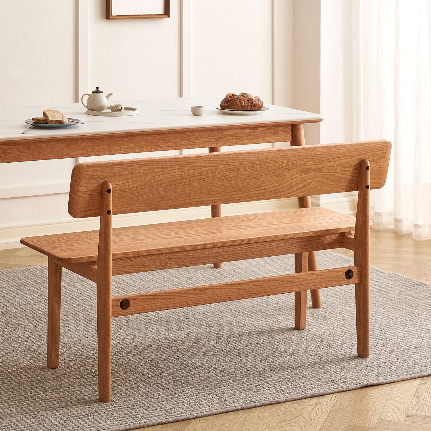 Scandinavian Oak Wood Dining Bench With Backrest RESTLY offers minimalist design, a wide supportive seat for 3-4 people, and versatile use in any space.